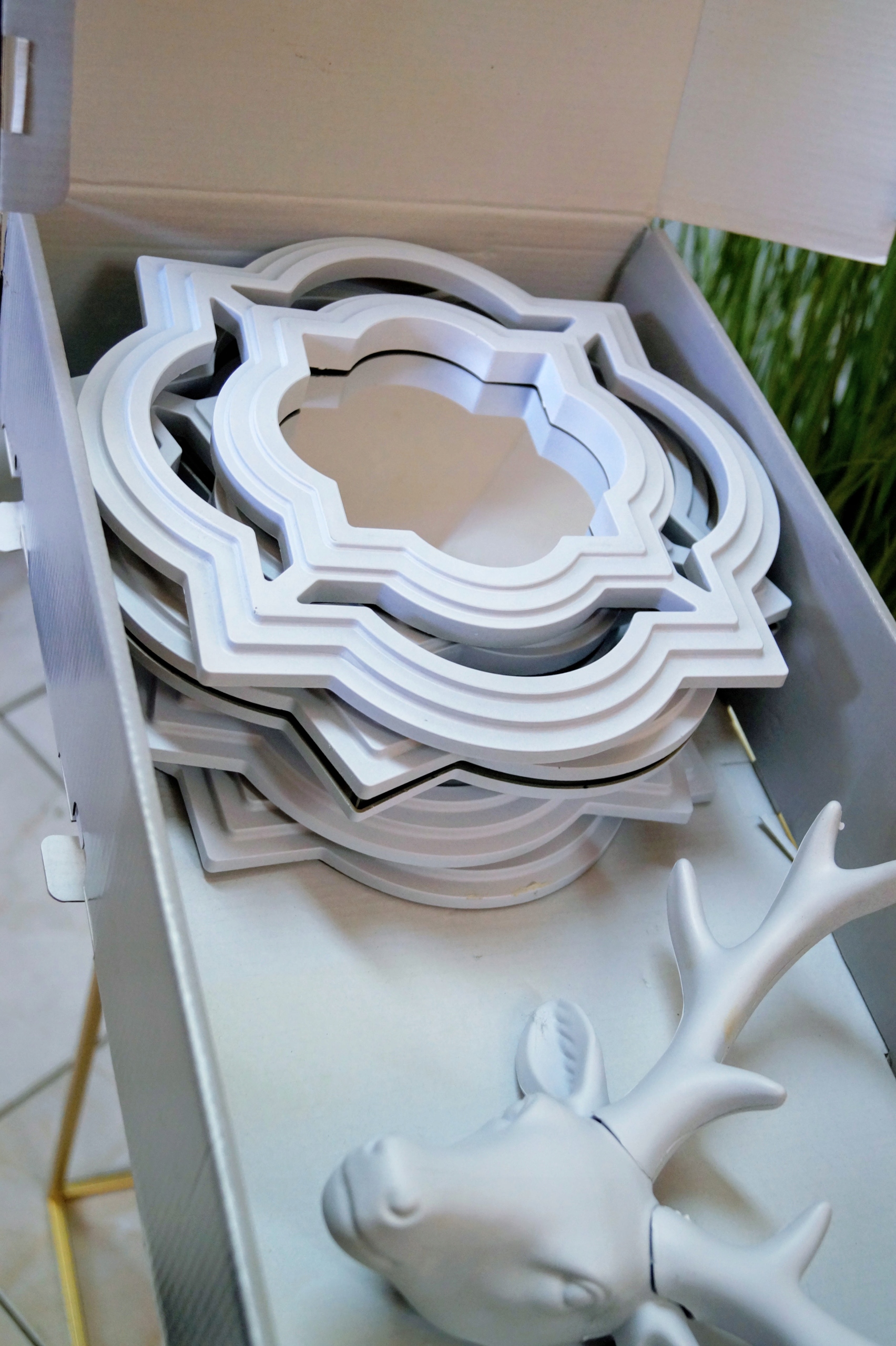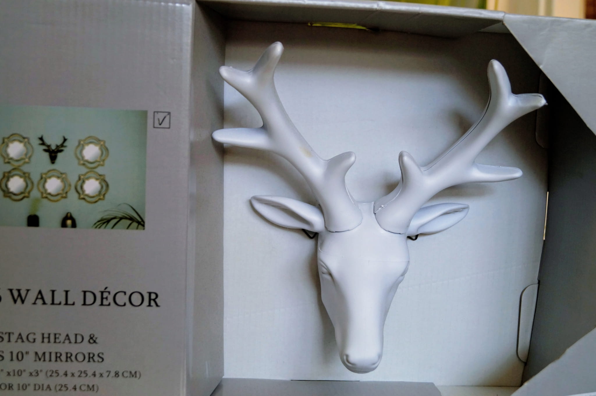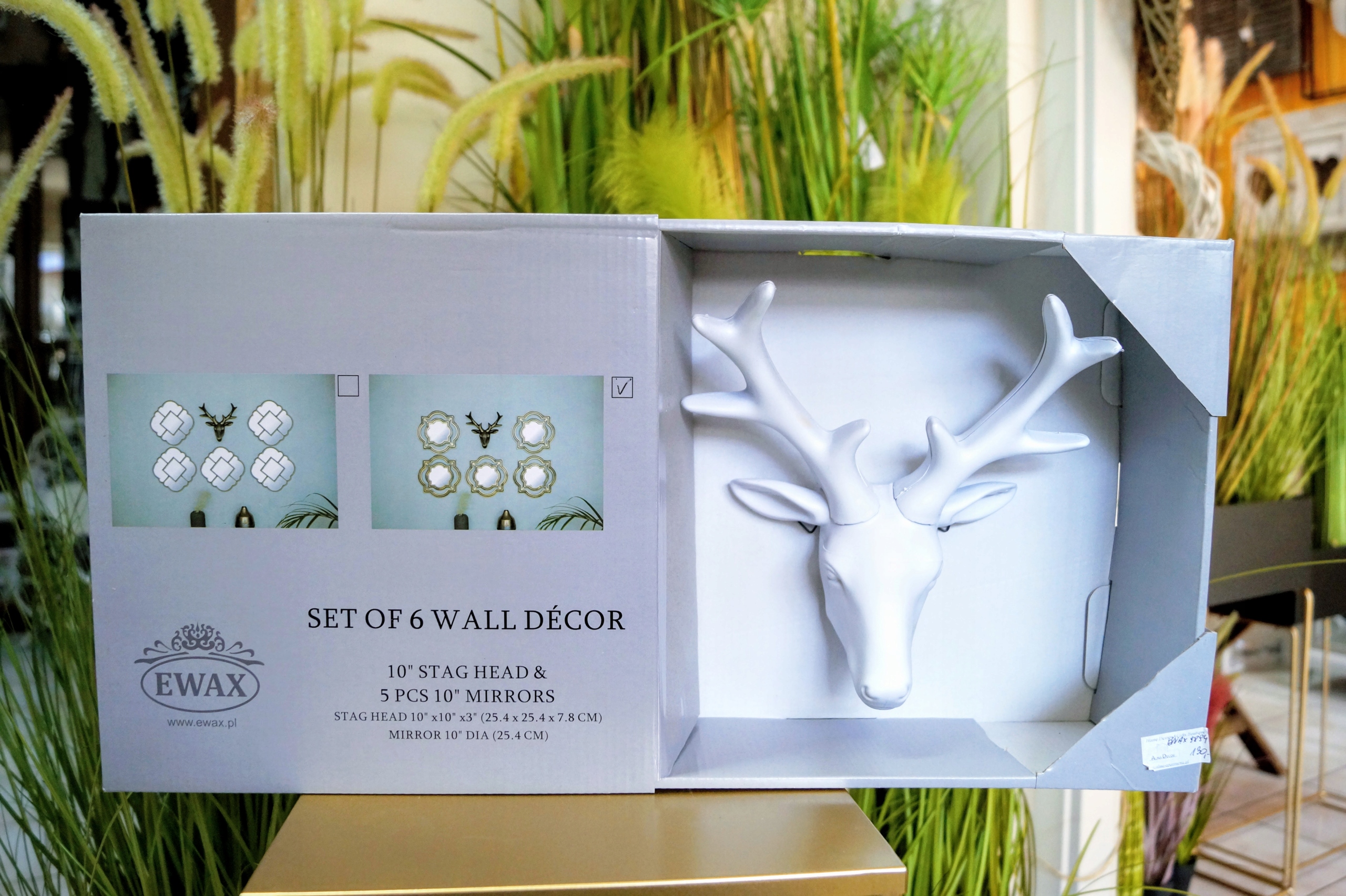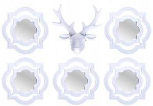Komplet dekoracji, 5 luster ażurowych i głowa renifera do zawieszenia na ścianie. Idealnie wkomponuje się do wnętrza w stylu glamour.