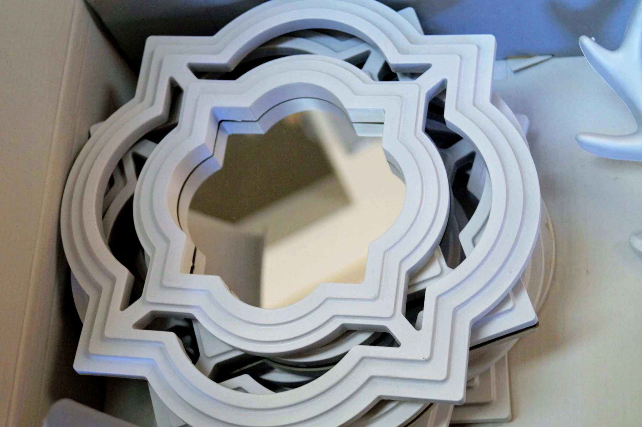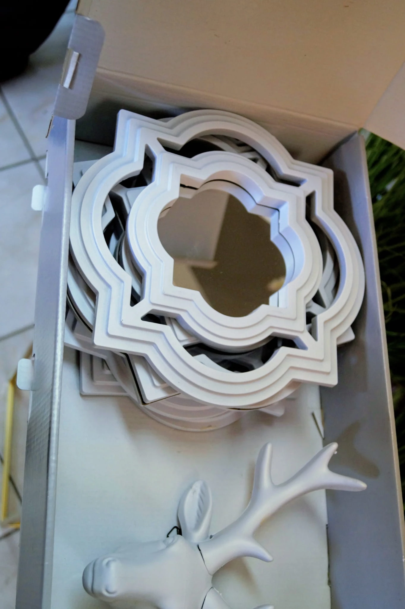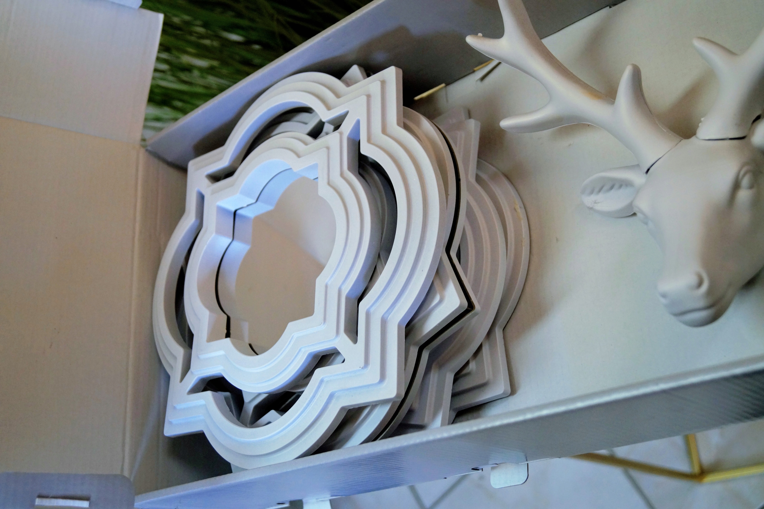 Komplet dekoracji, 5 luster ażurowych i głowa renifera do zawieszenia na ścianie. Idealnie wkomponuje się do wnętrza w stylu glamour.