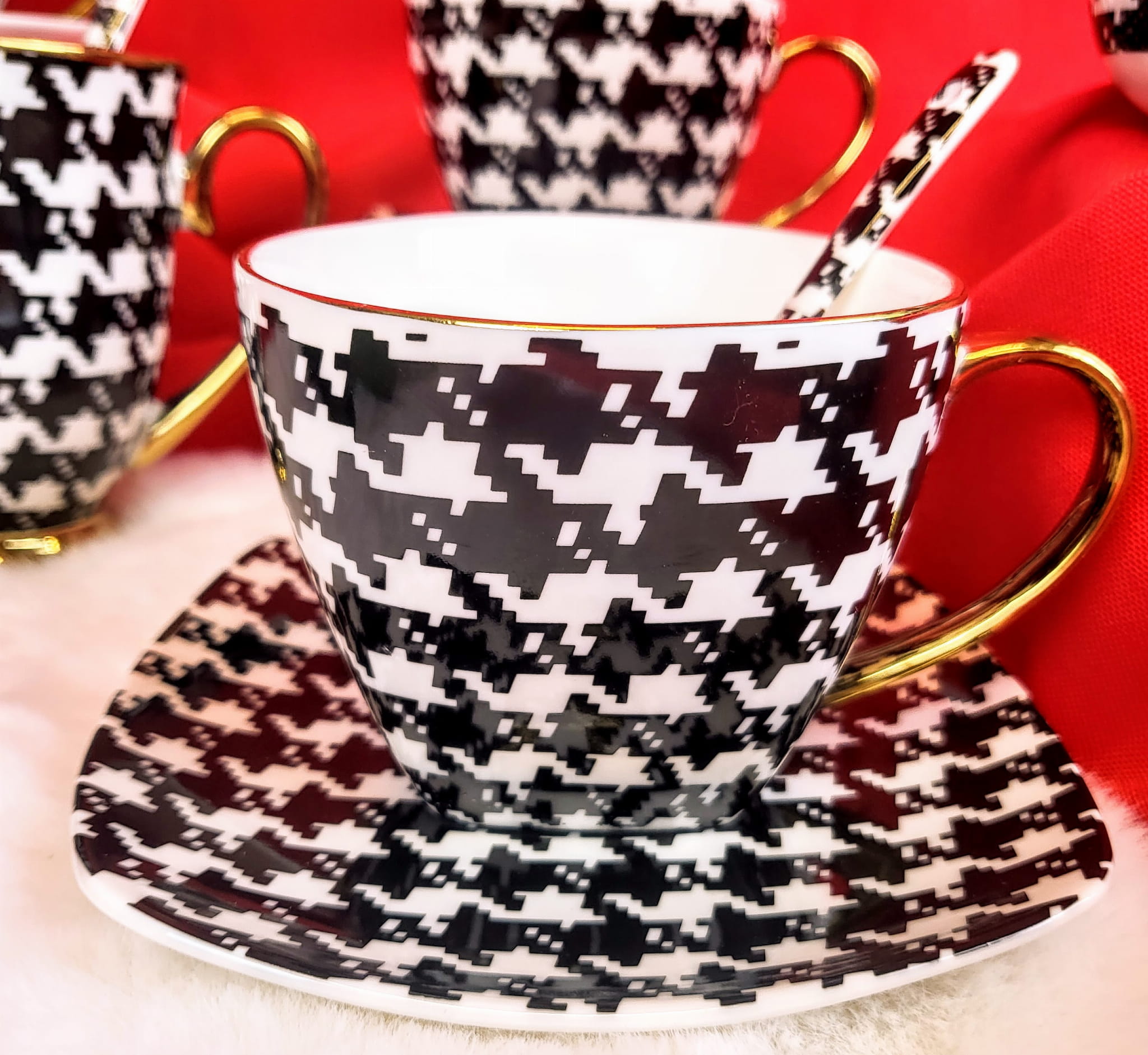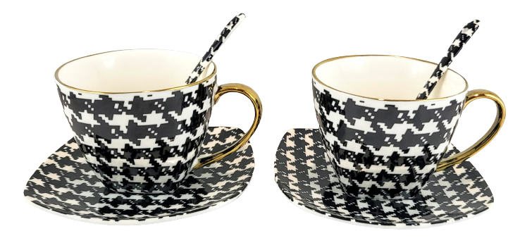 Ceramiczne filiżanki z podstawkami i łyżeczkami zdobione wzorem pepitki.