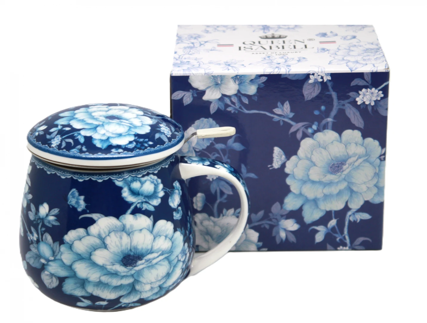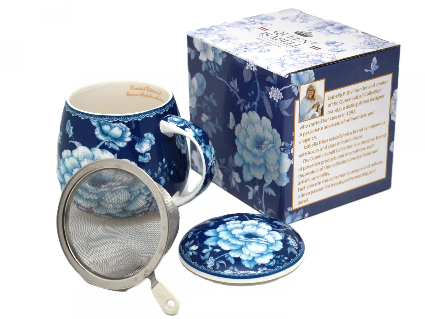 Kubek z zaparzaczem z porcelany bone china to funkcjonalny i stylowy zestaw dla miłośników herbaty. Kubek zdobiony jest subtelnymi, biało-niebieskimi motywami róż, które nadają mu elegancki wygląd. W zestawie znajduje się dopasowany porcelanowy zaparzacz, umożliwiający wygodne parzenie ulubionej herbaty. Całość zapakowana jest w ozdobne opakowanie, co czyni zestaw doskonałym na prezent.