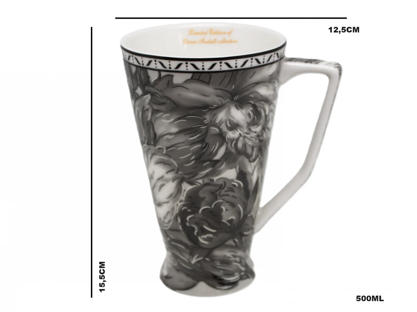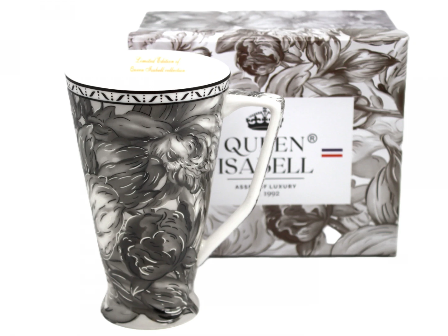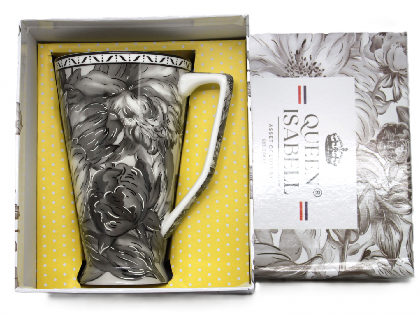 Elegancki, smukły kubek z porcelany, ozdobiony wyrazistym, czarno-białym motywem kwiatowym, przedstawiającym róże i inne rośliny. Zapakowany w dopasowane pudełko prezentowe, które harmonizuje z motywem zdobiącym kubek, z wyraźnym napisem „Queen Isabell” . Całość sprawia wrażenie luksusowego i wyjątkowego produktu, idealnego na prezent.