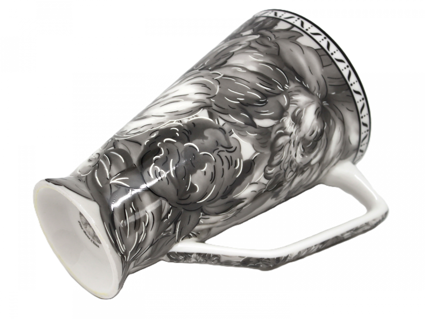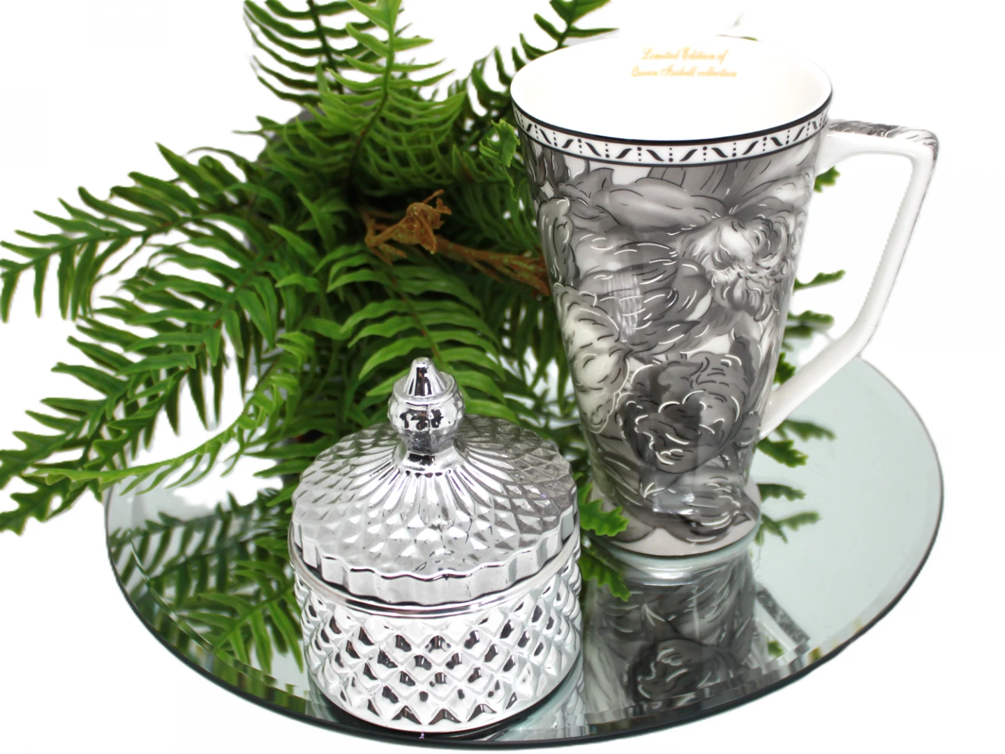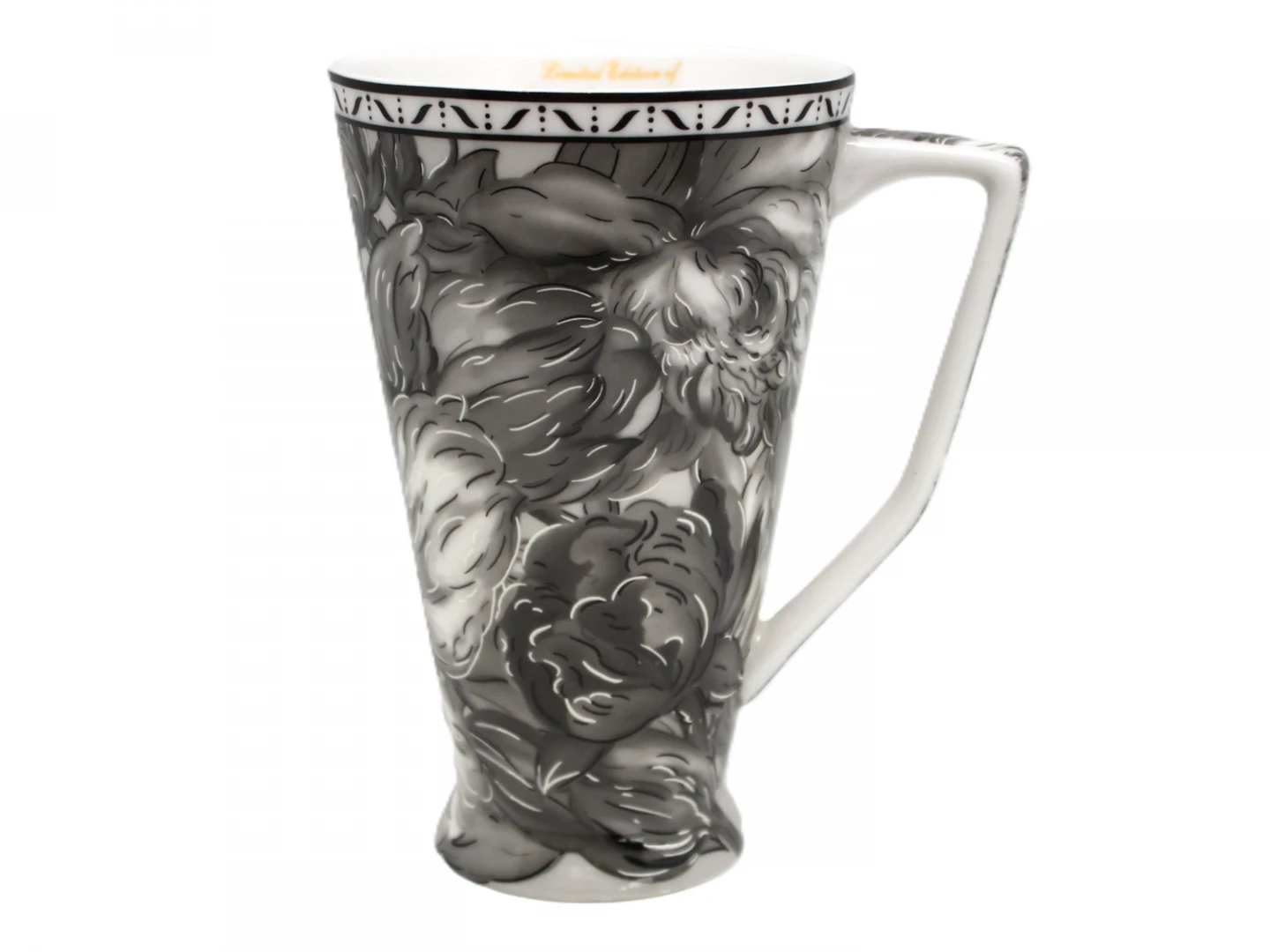 Elegancki, smukły kubek z porcelany, ozdobiony wyrazistym, czarno-białym motywem kwiatowym, przedstawiającym róże i inne rośliny. Zapakowany w dopasowane pudełko prezentowe, które harmonizuje z motywem zdobiącym kubek, z wyraźnym napisem „Queen Isabell” . Całość sprawia wrażenie luksusowego i wyjątkowego produktu, idealnego na prezent.