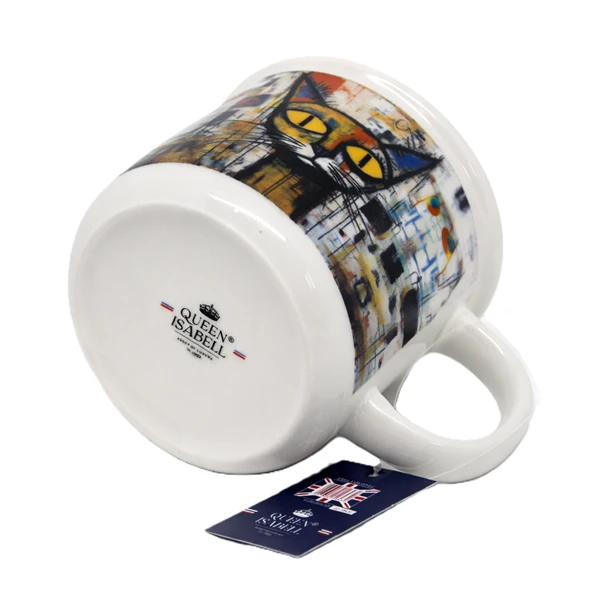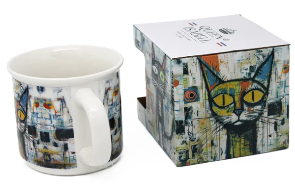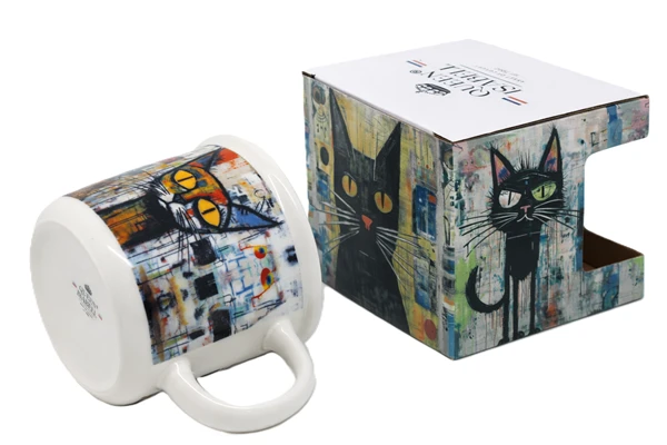 Jeśli szukasz kubka, który wyróżnia się na tle klasycznej ceramiki, ten model z pewnością przyciągnie Twoją uwagę. Przedstawia on czarnego kota o przenikliwym spojrzeniu, osadzonego w barwnym, artystycznym tle przypominającym nowoczesne graffiti. To idealne połączenie pasji do zwierząt z odważnym, współczesnym designem.