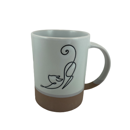 Ceramiczny biało-beżowy kubek z motywem rozciągającego się kota. Idealny pomysł na drobny upominek dla każdego wielbiciela zwierząt, szczególnie kotów.