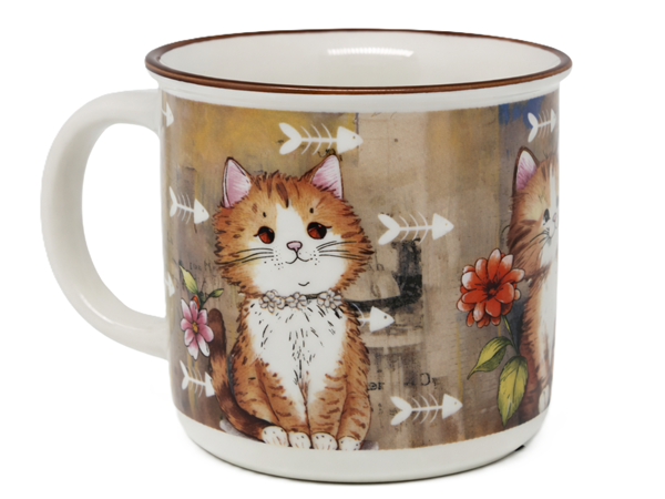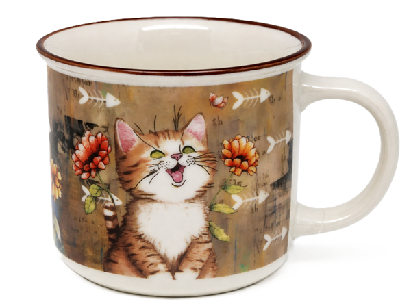 Wprowadź odrobinę ciepła i humoru do swoich codziennych rytuałów! Ten wyjątkowy kubek ceramiczny o pojemności 400 ml zachwyca artystyczną ilustracją rozbawionego kota otoczonego kwiatami. Ciepła, beżowo-brązowa kolorystyka tła oraz detale w postaci rybich ości nadają mu unikalnego, nieco rustykalnego charakteru, który idealnie pasuje do przytulnej kuchni.