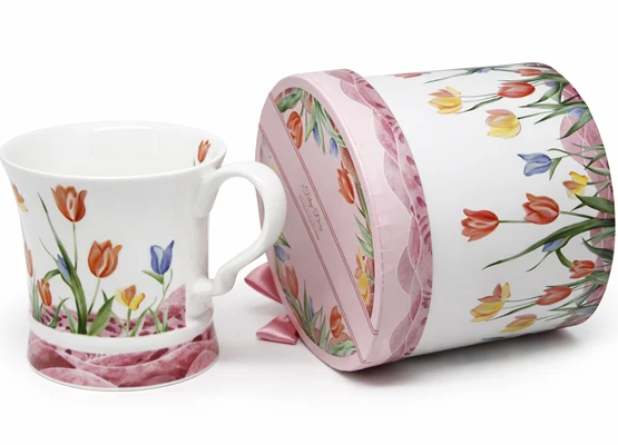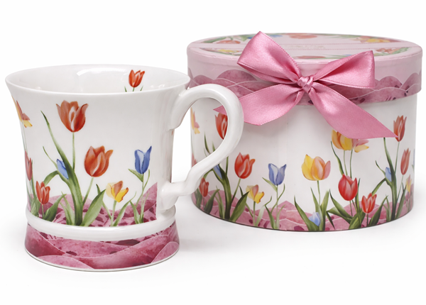 Kubek zapakowany jest w piękne, okrągłe pudełko z tym samym motywem tulipanów, zwieńczone elegancką, różową wstążką z satyny. To idealny, gotowy upominek dla: