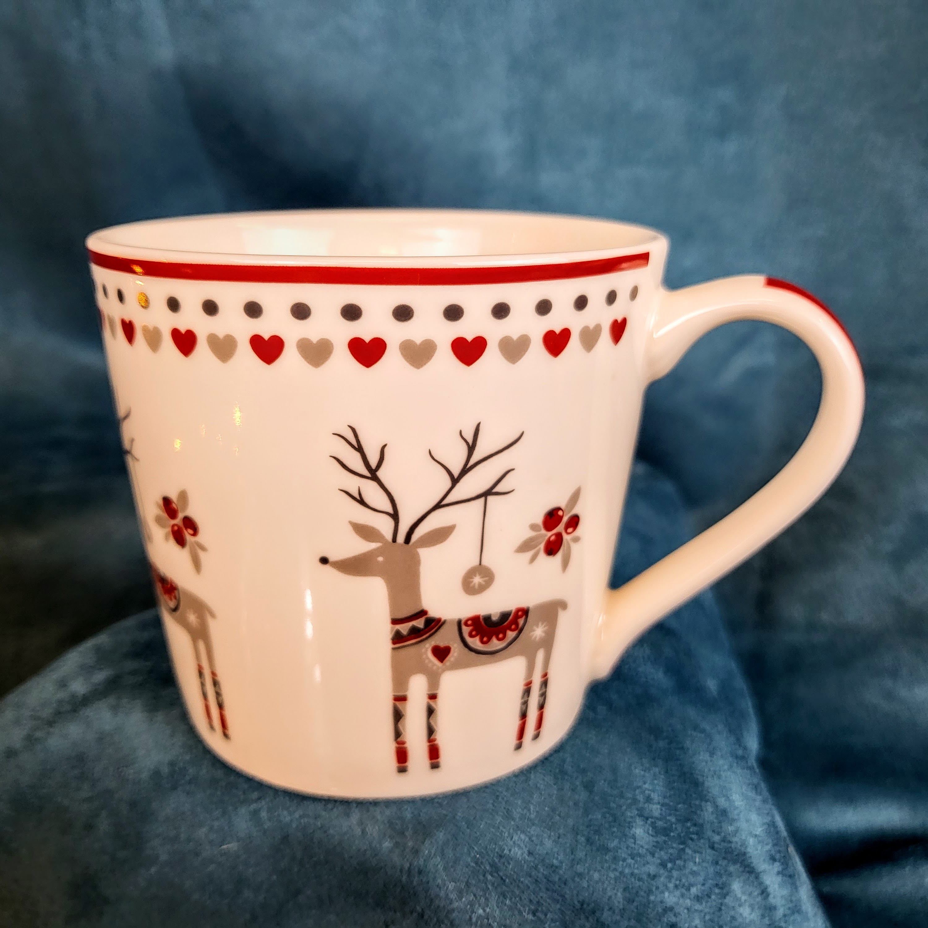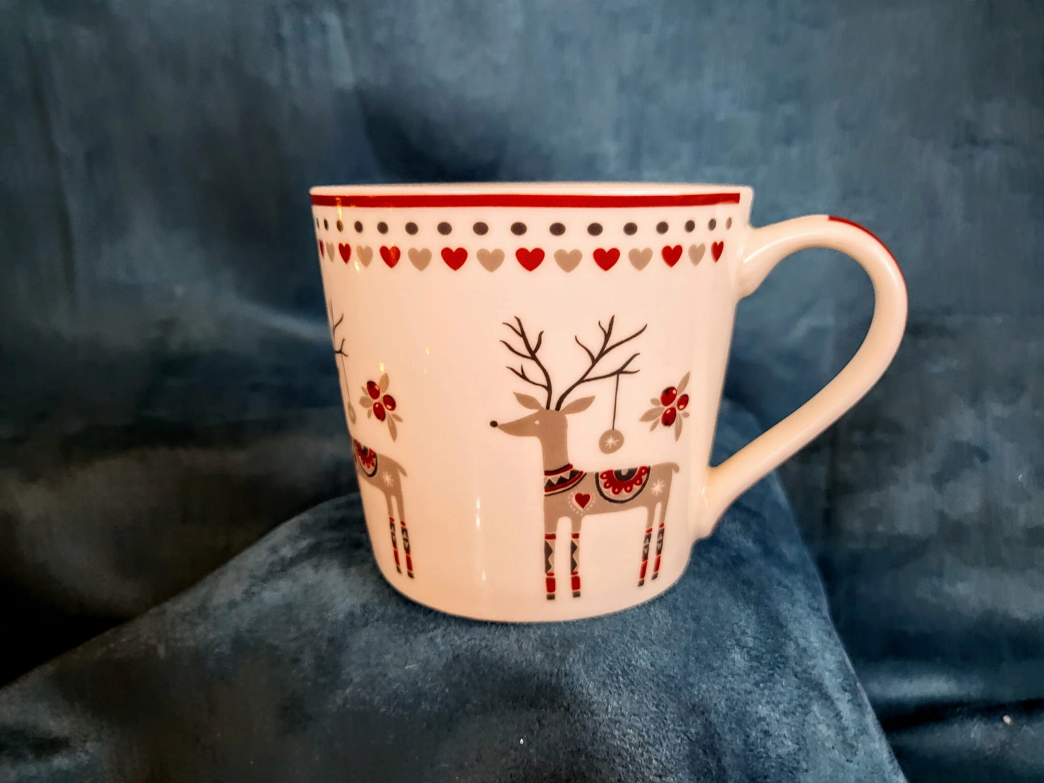 Ceramiczny biały kubek w urocze reniferki. Idealny pomysł na drobny upominek dla każdego wielbiciela picia ciepłych napoi na zimne jesienne oraz zimowe wieczory.