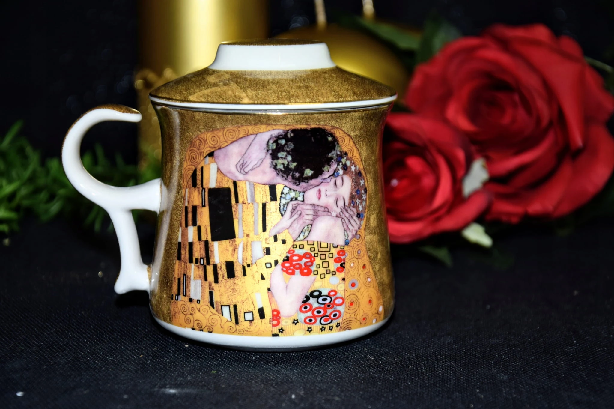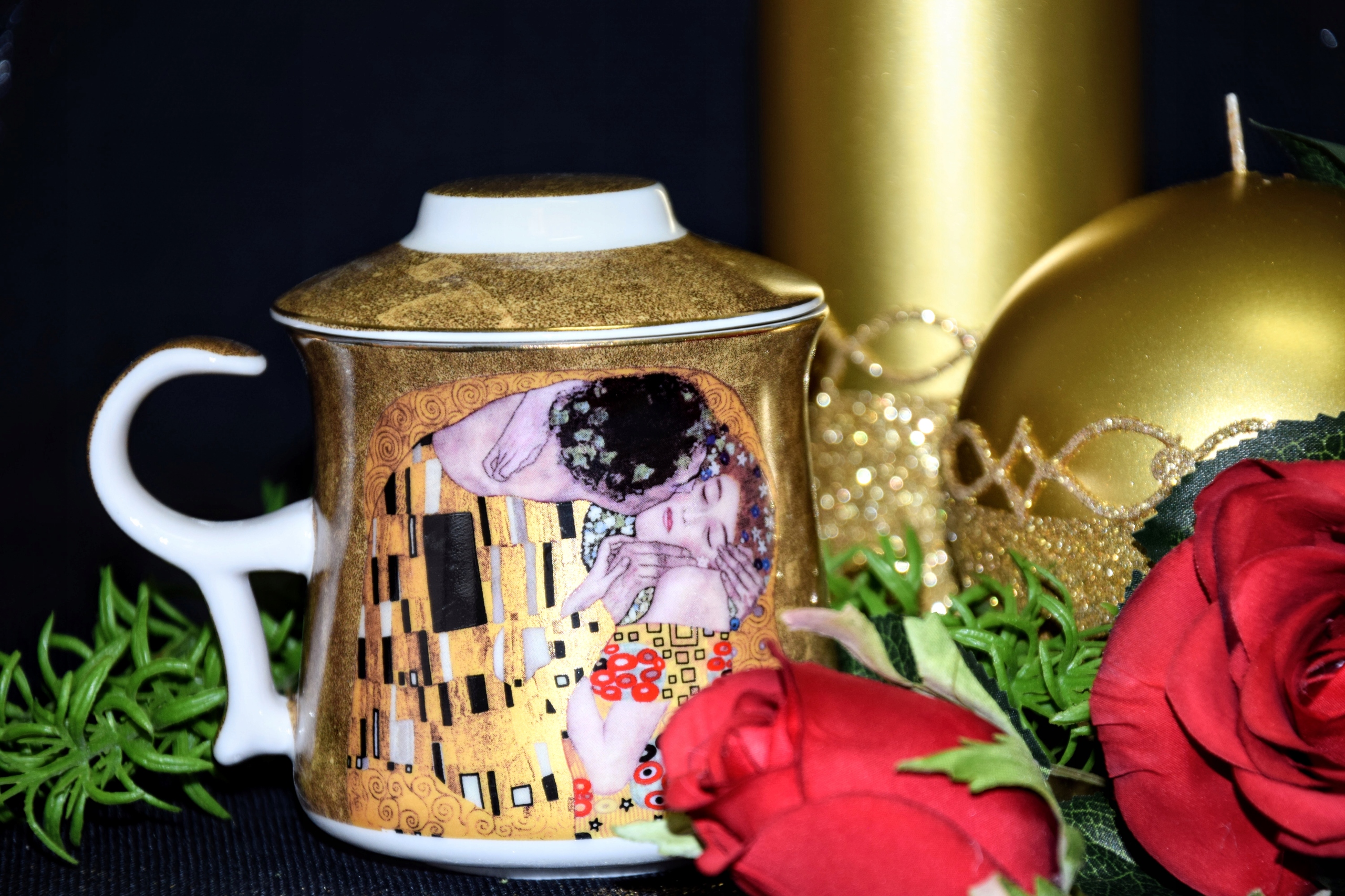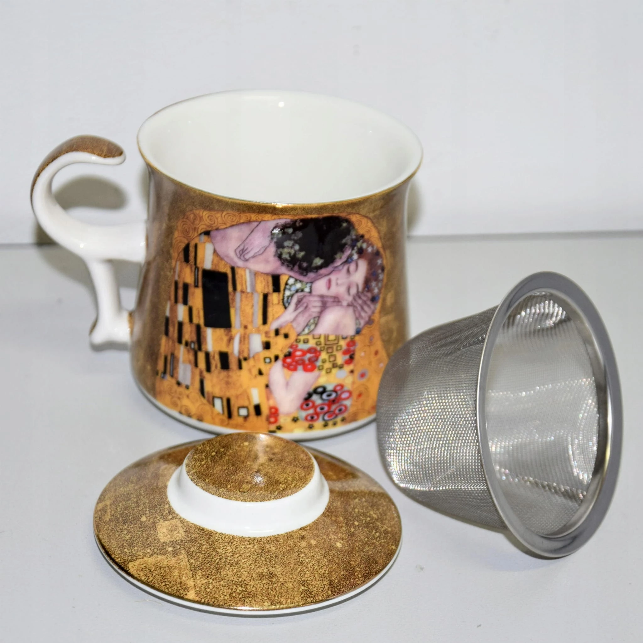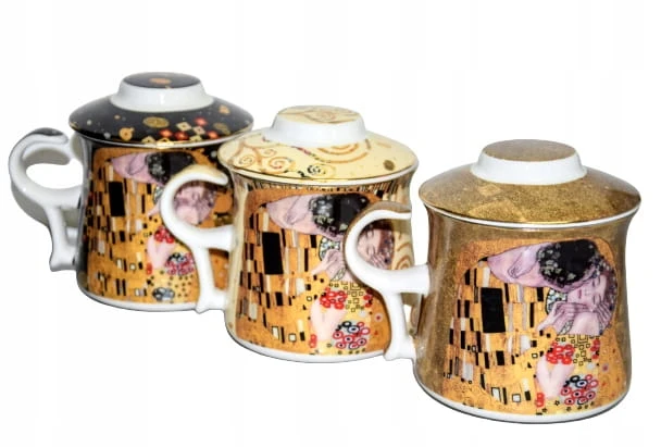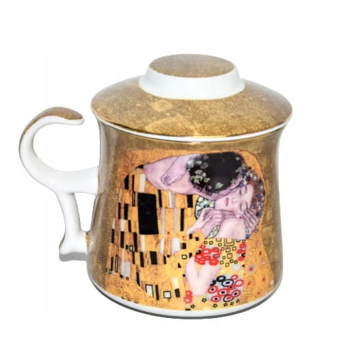 Ceramiczny kubek z pokrywką i metalowym zaparzaczem. Dominujący wzór- G. KLIMT.