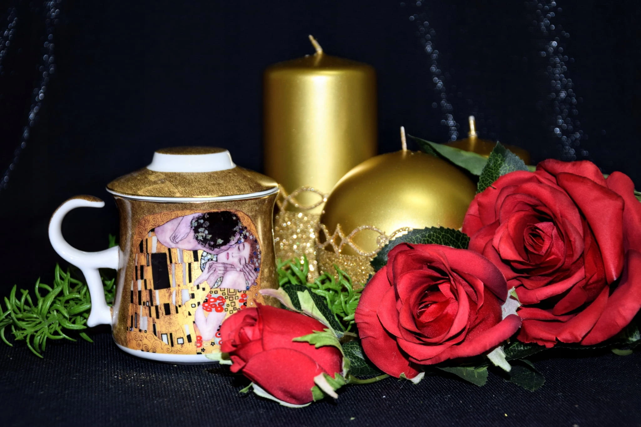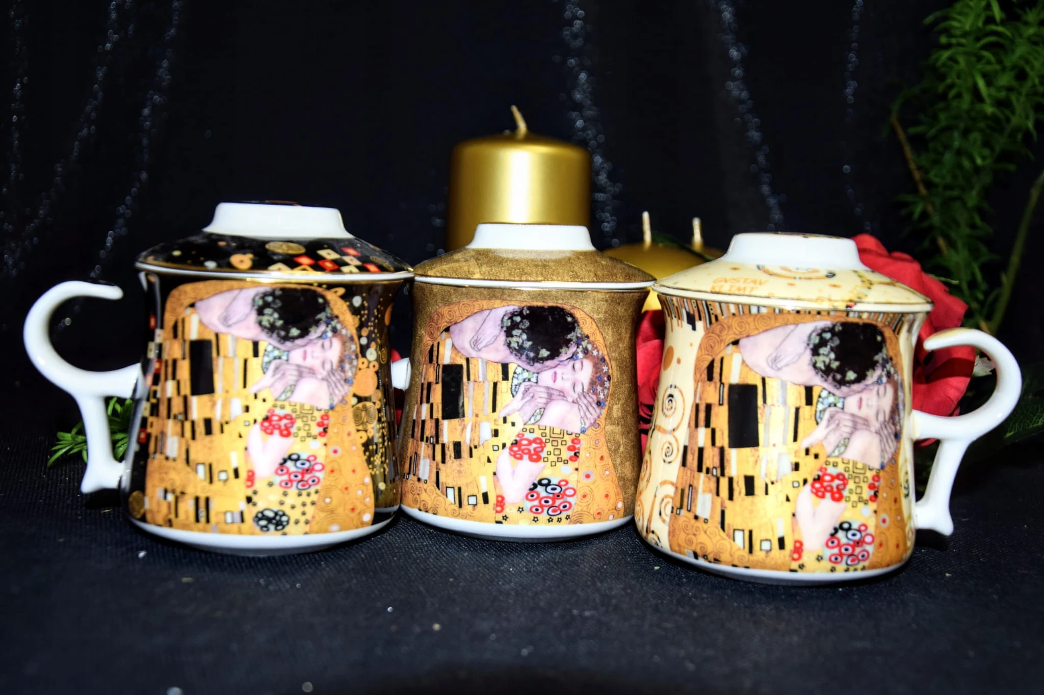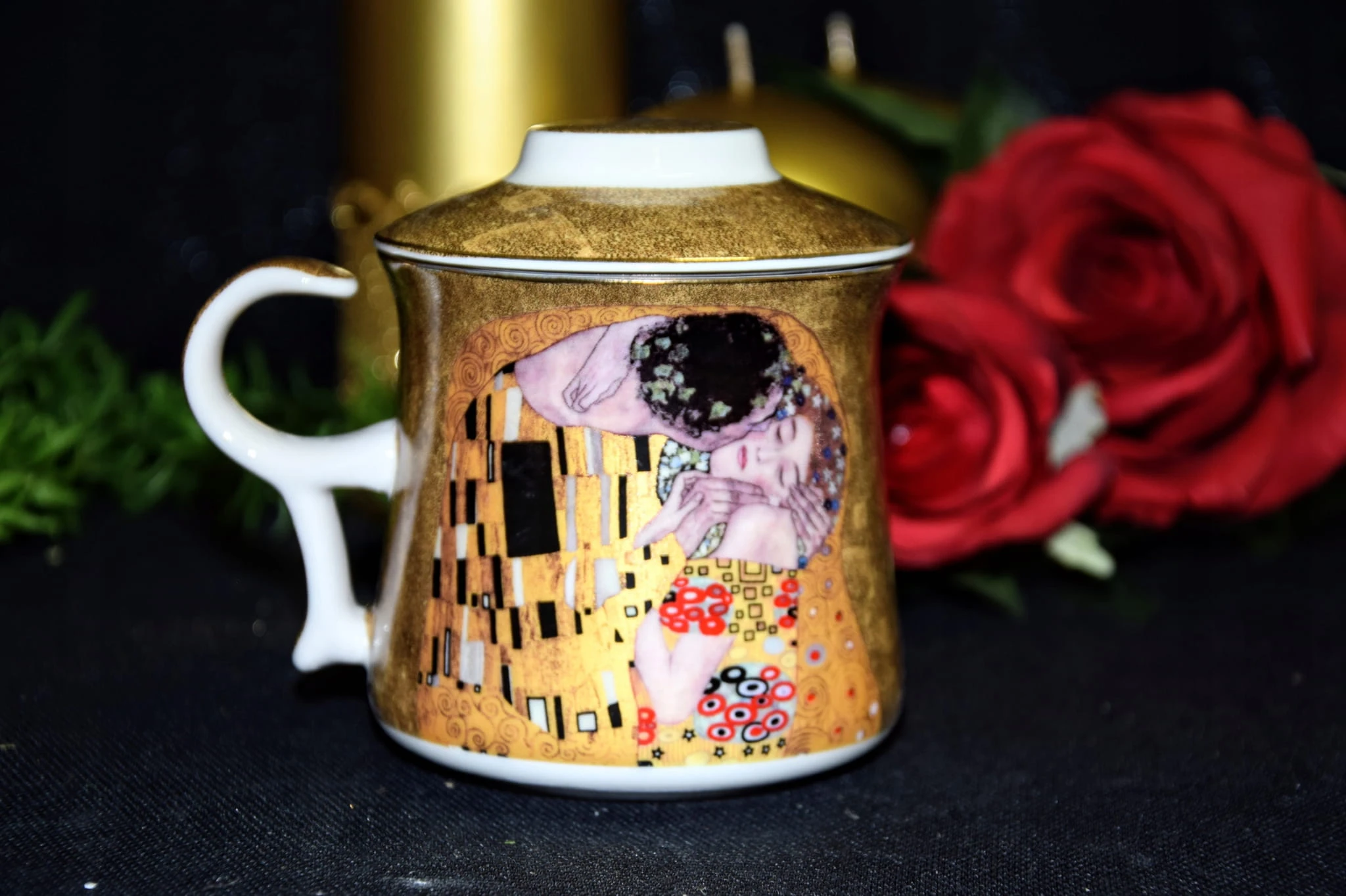 Ceramiczny kubek z pokrywką i metalowym zaparzaczem. Dominujący wzór- G. KLIMT.