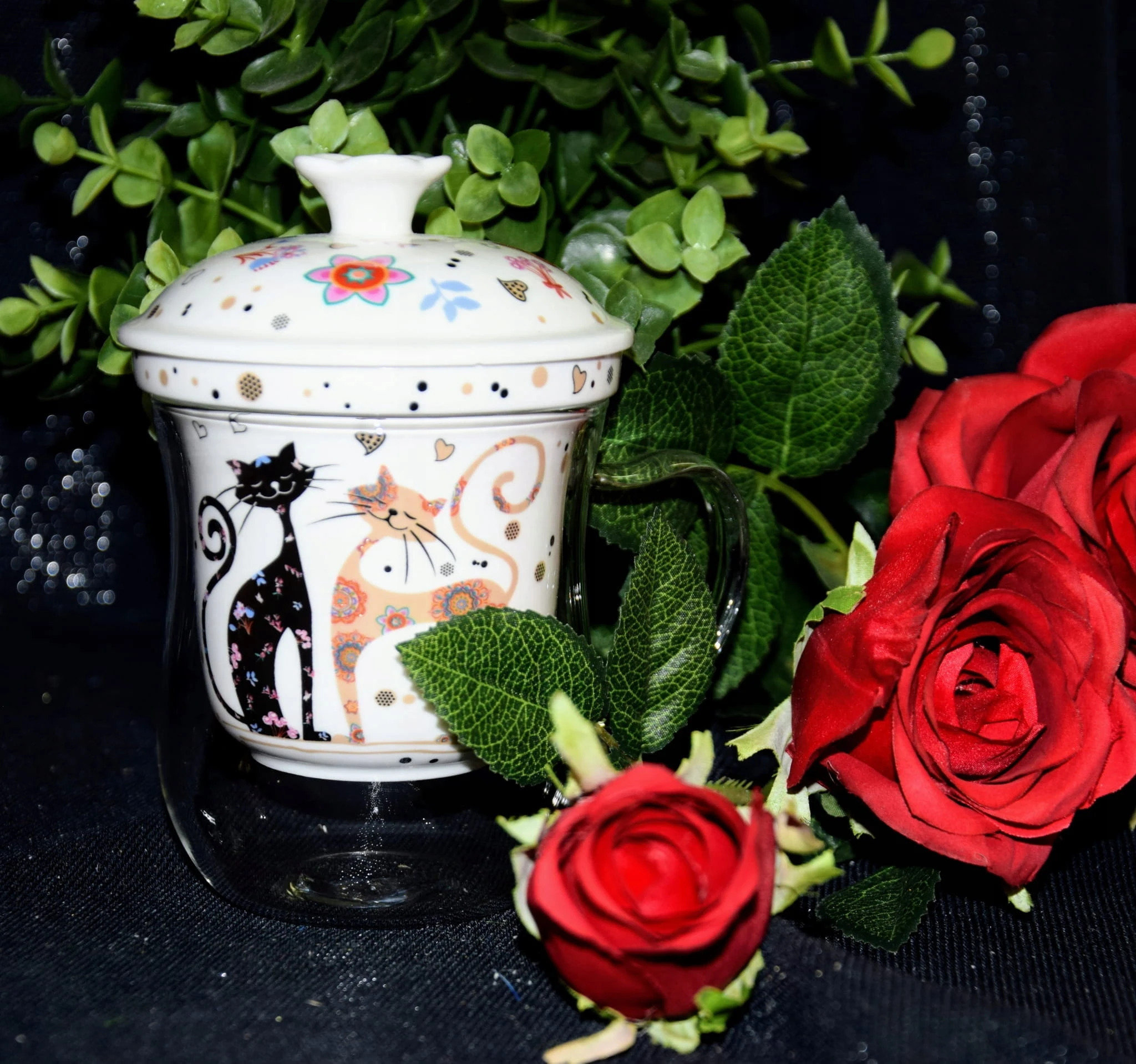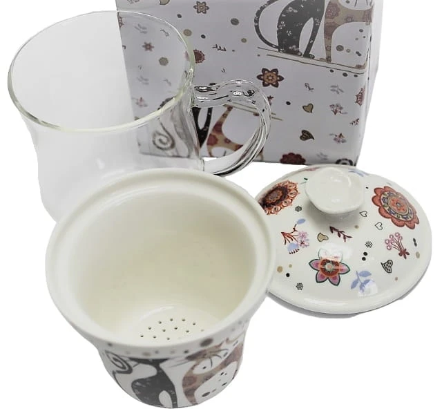 KUBEK CERAMICZNY Z METALOWYM ZAPARZACZEM KOTY