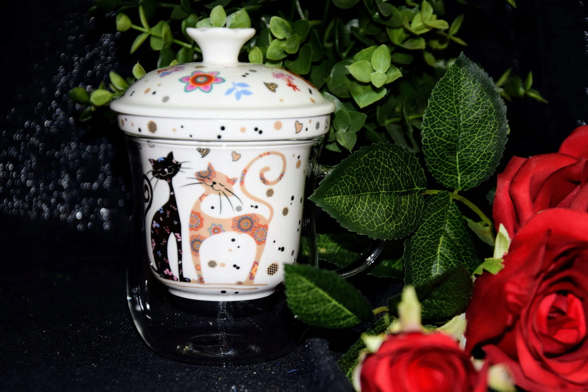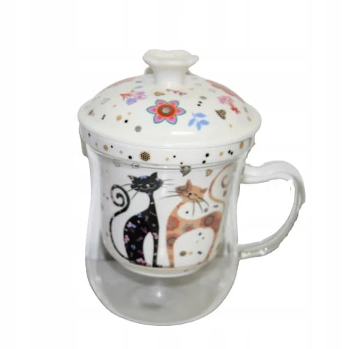Ceramiczny kubek z pokrywką i metalowym zaparzaczem. Dominujący wzór- KOTY.