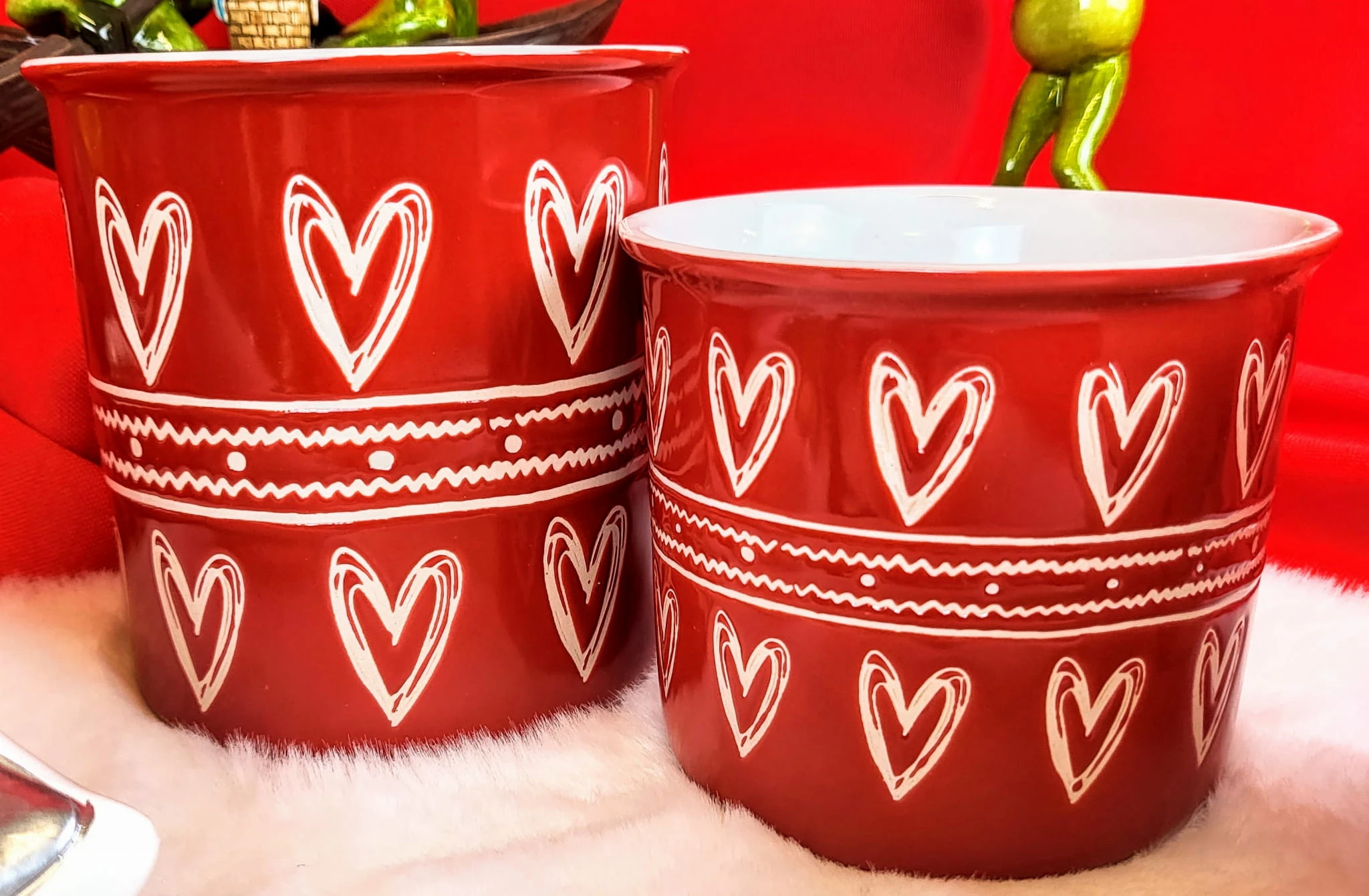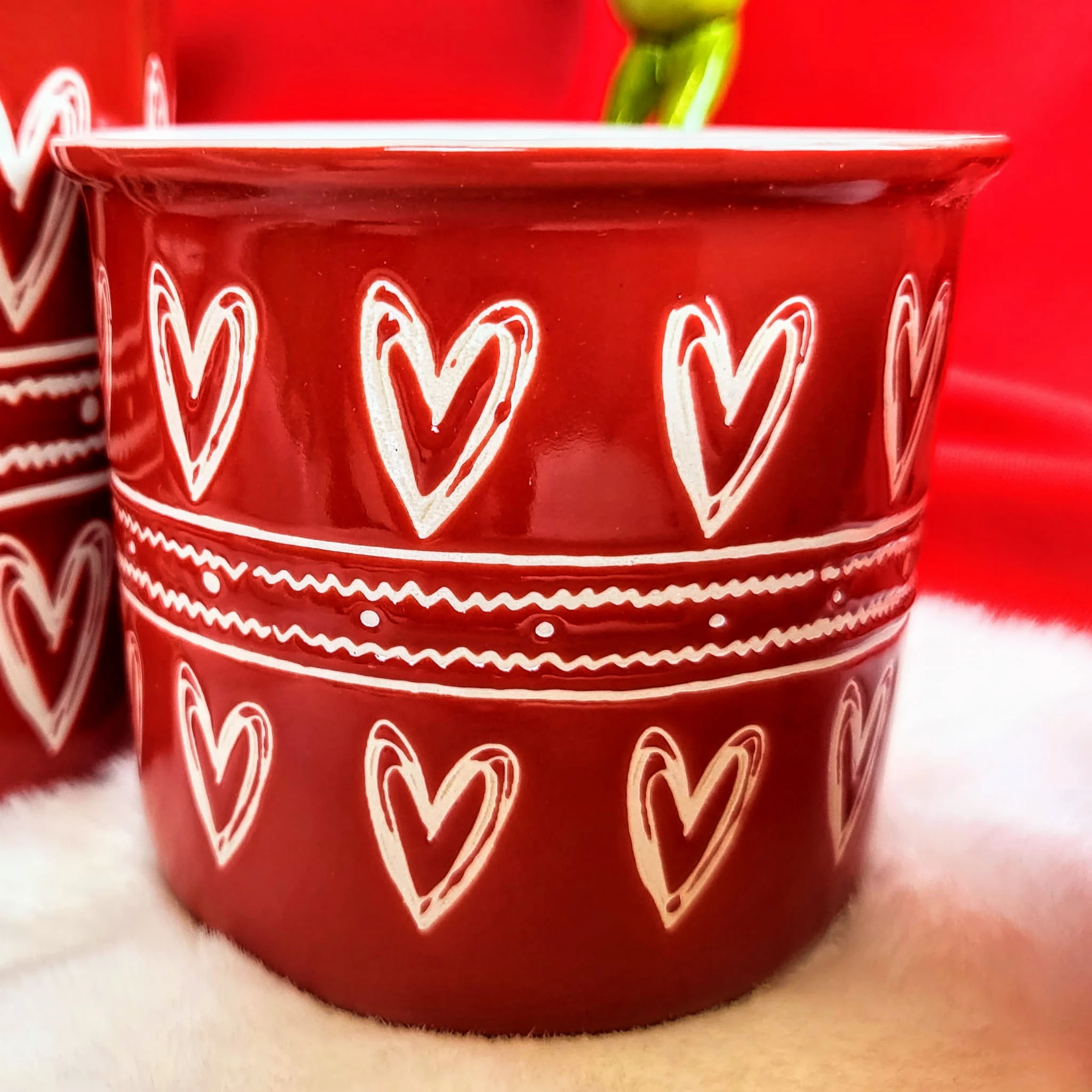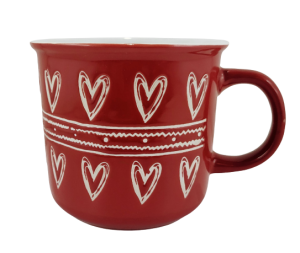 Ceramiczny czerwony kubek w serduszka. Idealny pomysł na drobny upominek dla każdego wielbiciela picia ciepłych napoi na zimne jesienne oraz zimowe wieczory.