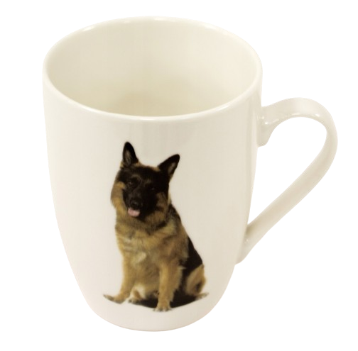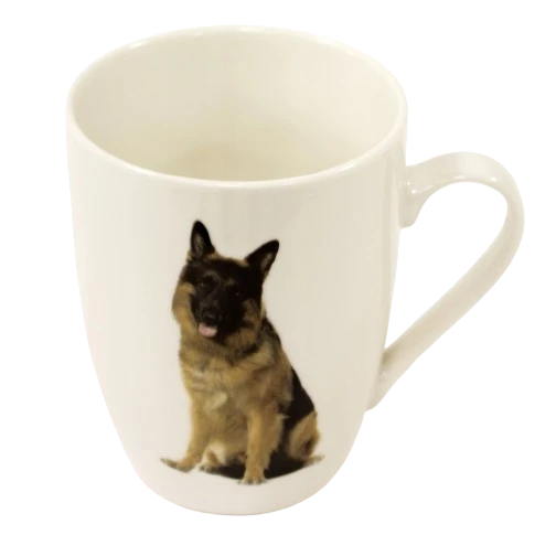 Kubek wykonany jest z jasno kremowej porcelany zdobionej wizerunkiem siedzącego owczarka niemieckiego. Pojemność kubka 360 ml (pojemność liczona po rant kubka).