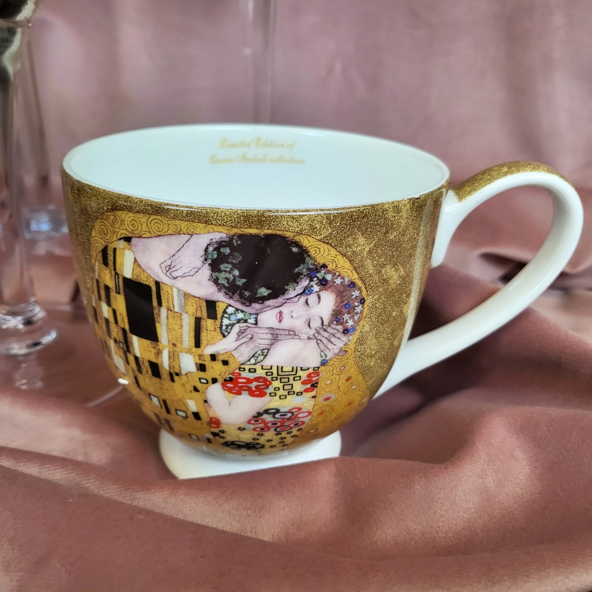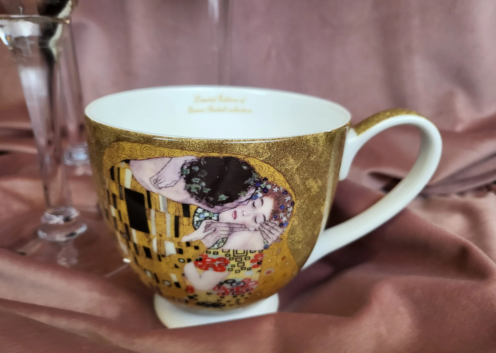 Filiżanka posiadający zdobienie przedstawiające obraz Gustawa Klimta- Pocałunek.