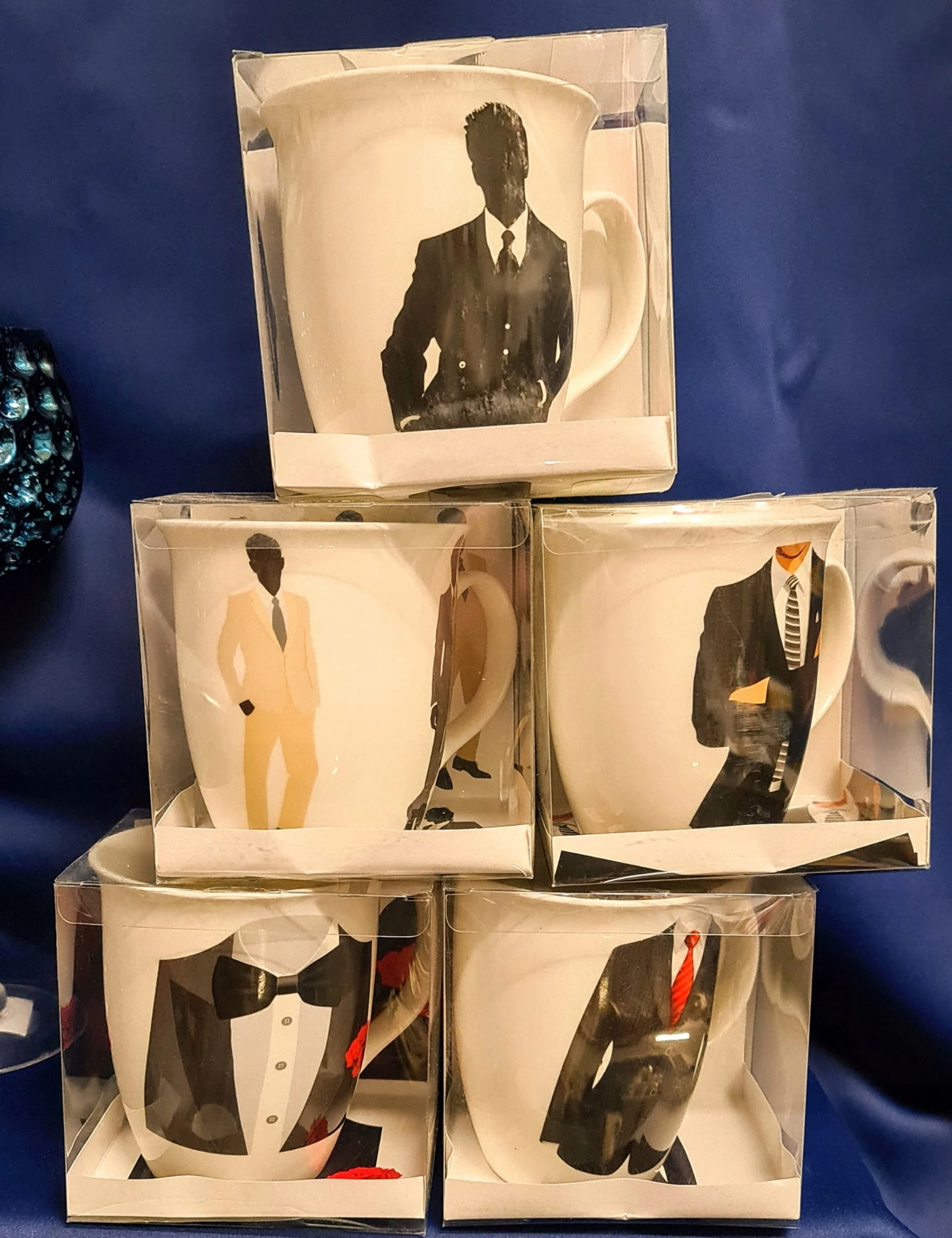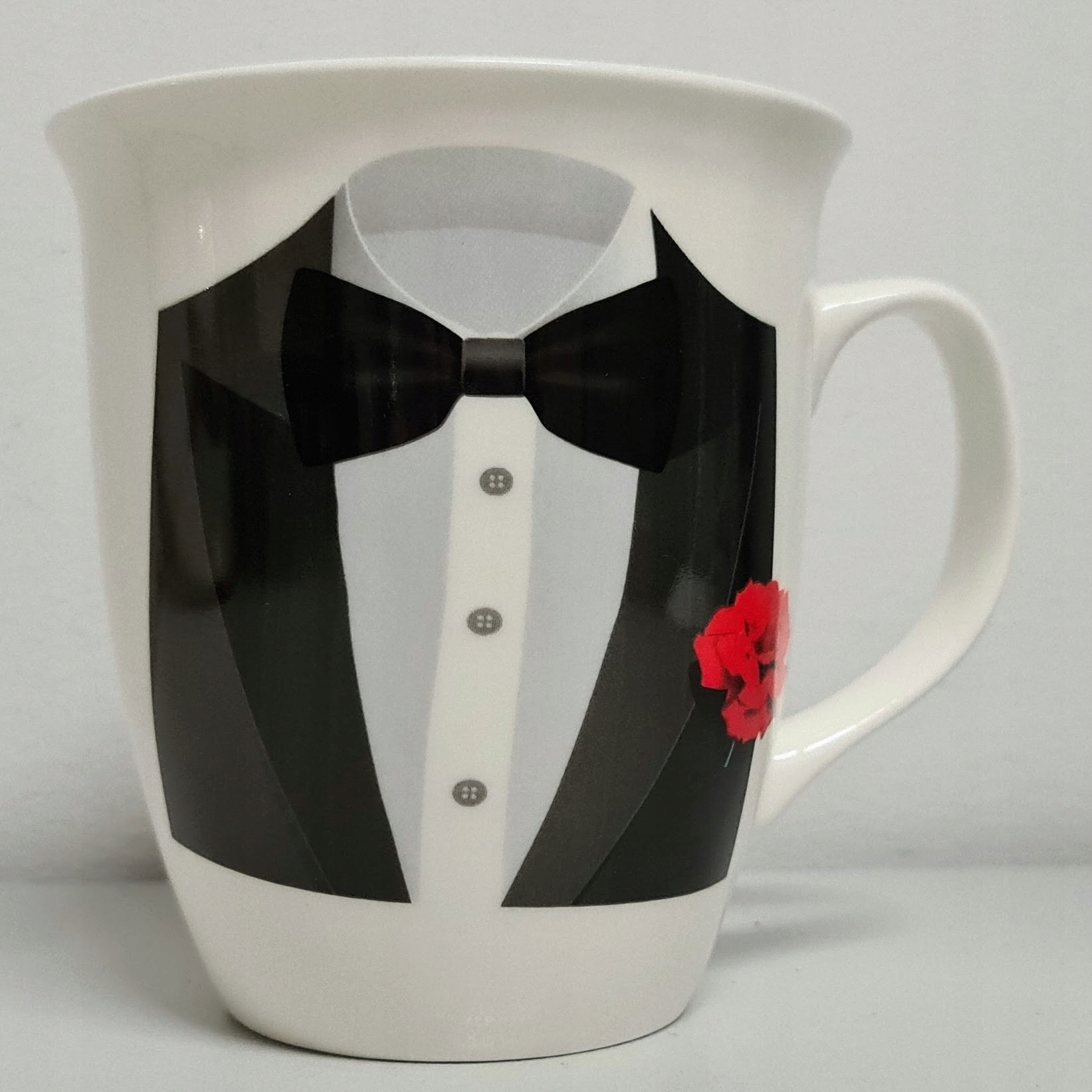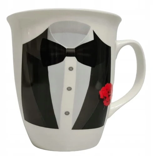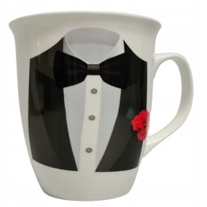 Kubek wykonany z ceramiki zdobiony motywem męskiego tłowia w garniturze.