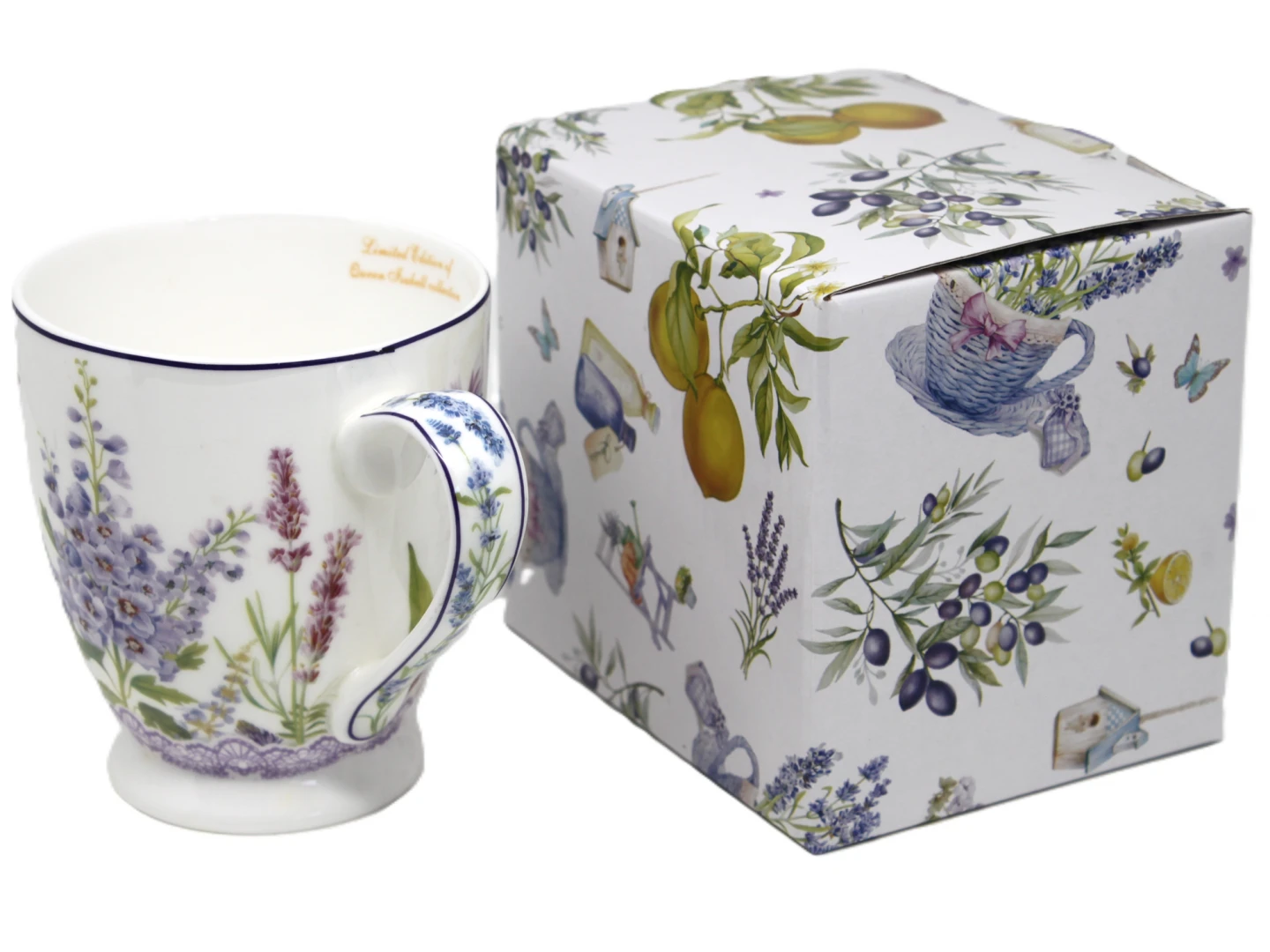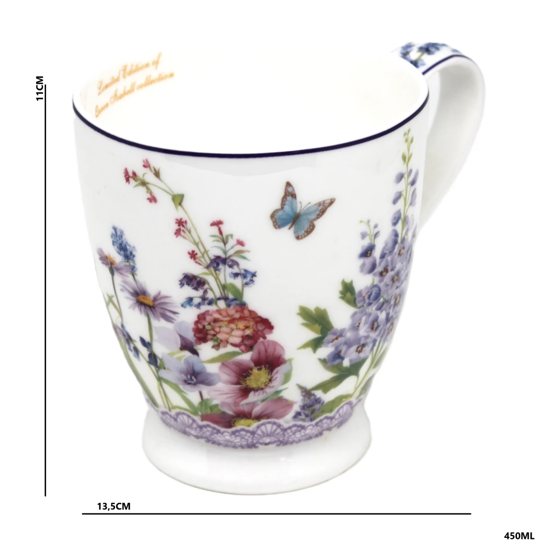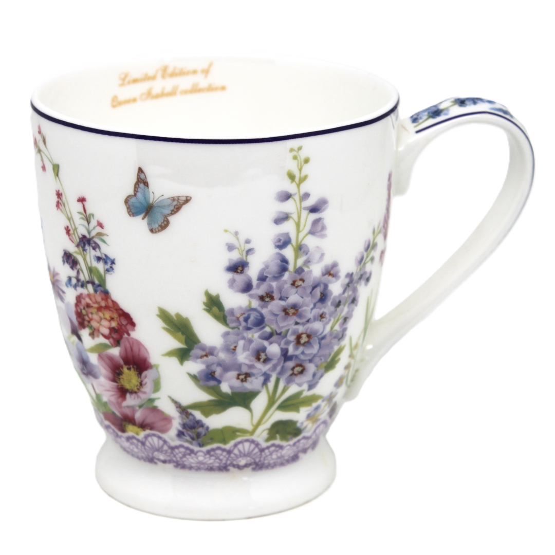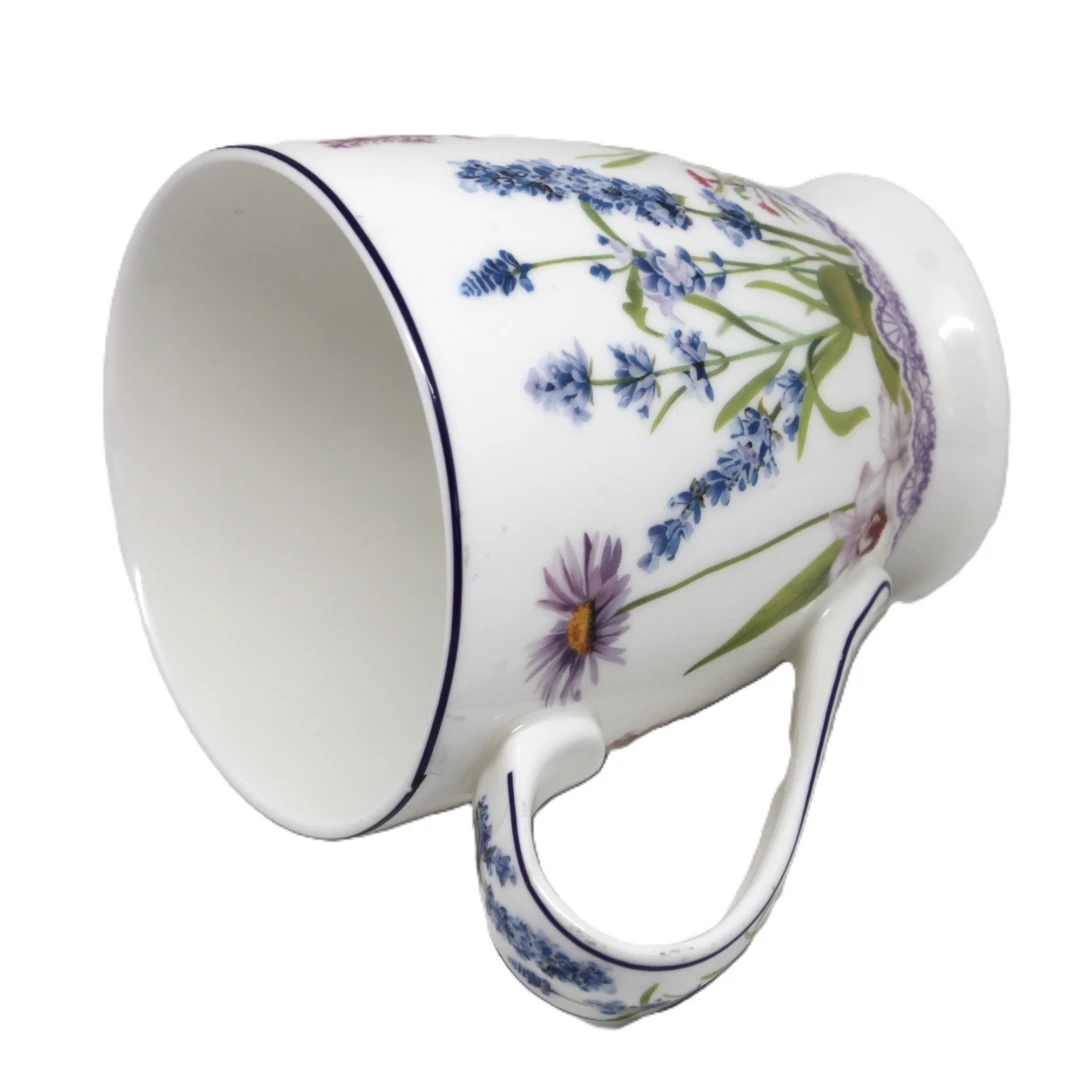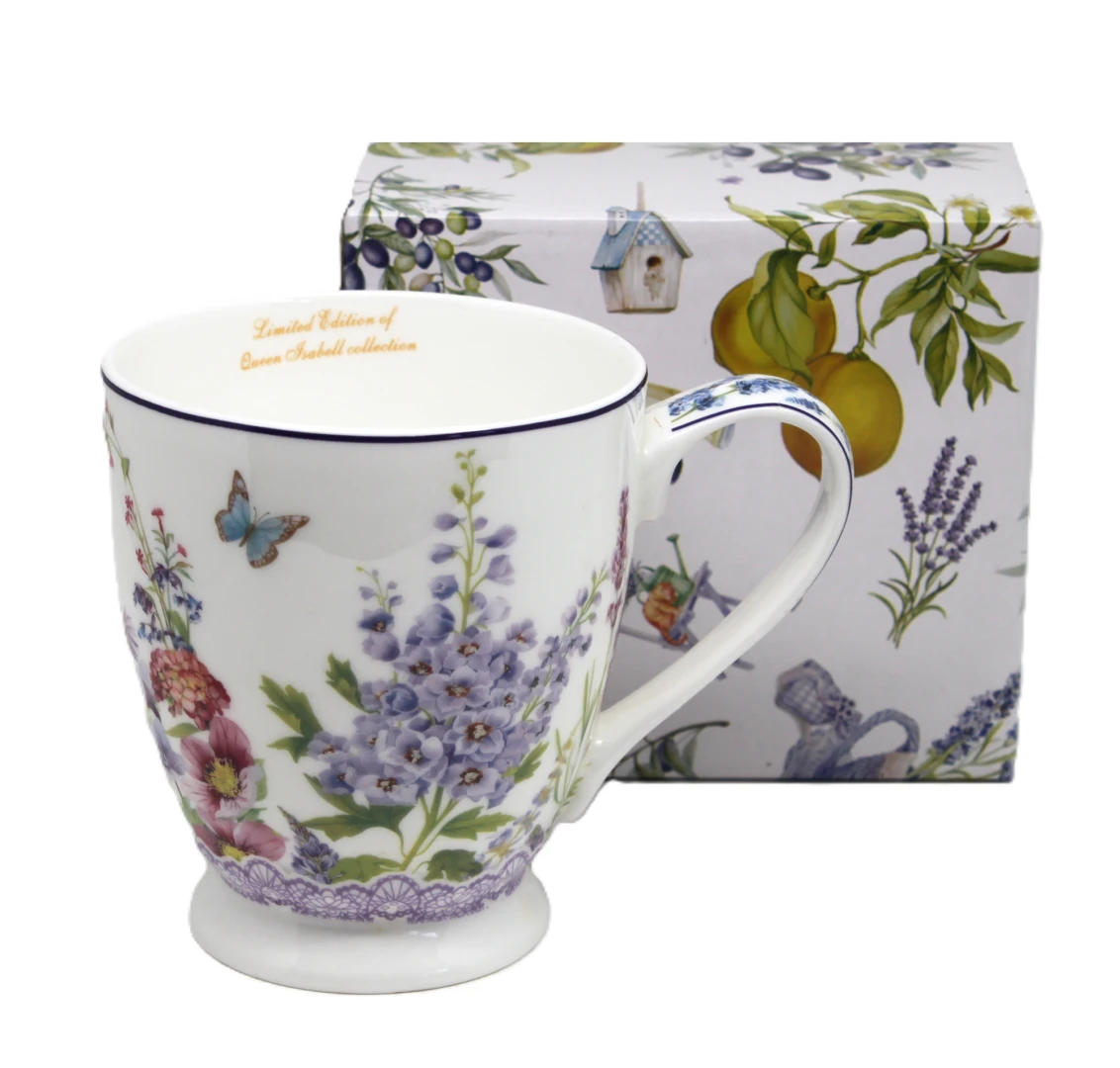 Elegancki porcelanowy kubek z kolekcji Queen Isabell to doskonały wybór dla miłośników pięknych i stylowych dodatków. Jego powierzchnia zdobiona jest delikatnym motywem lawendy oraz motyli, co nadaje mu subtelny i romantyczny charakter. Fioletowe akcenty w połączeniu z białym tłem tworzą harmonijną i elegancką kompozycję.