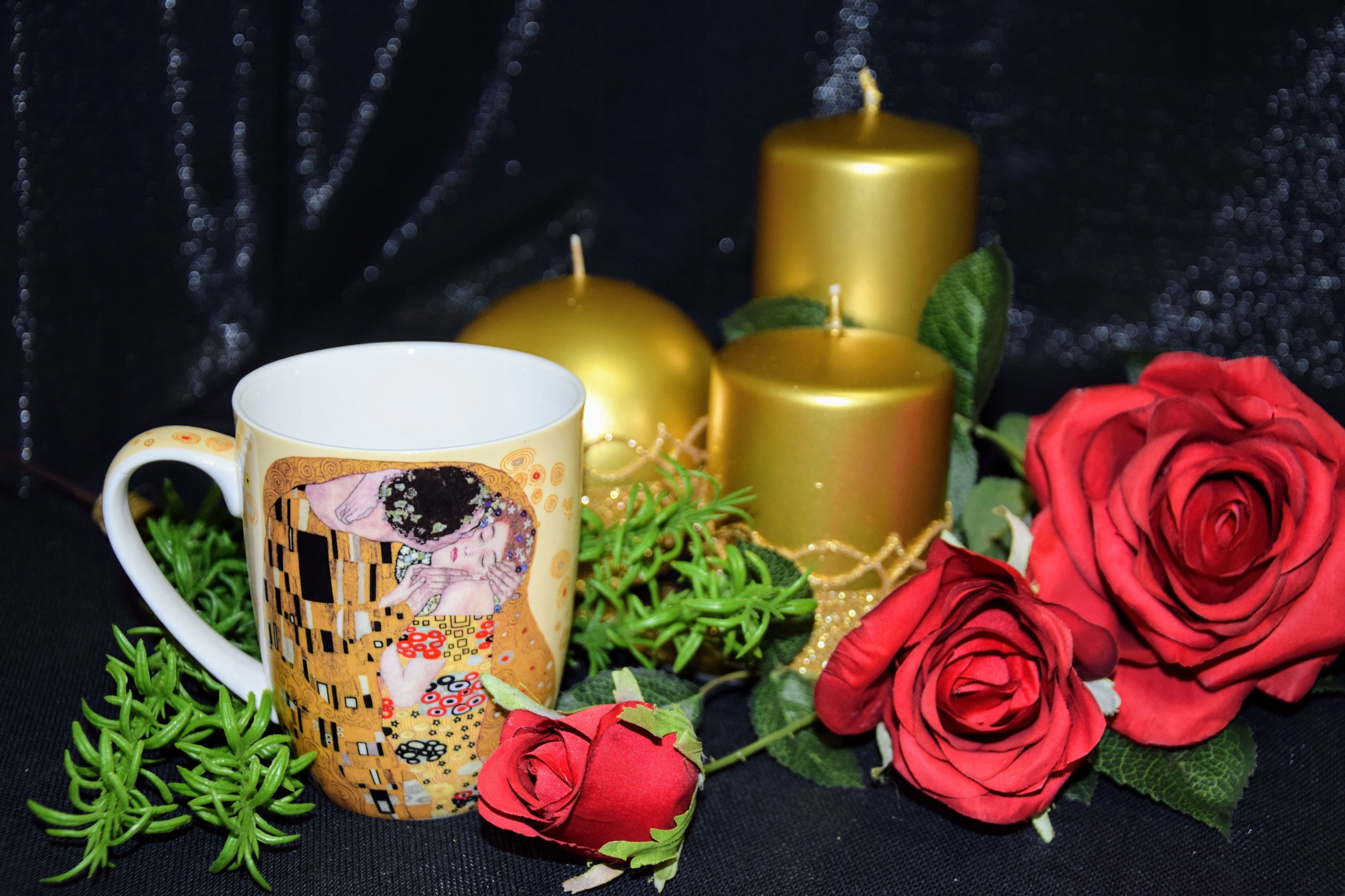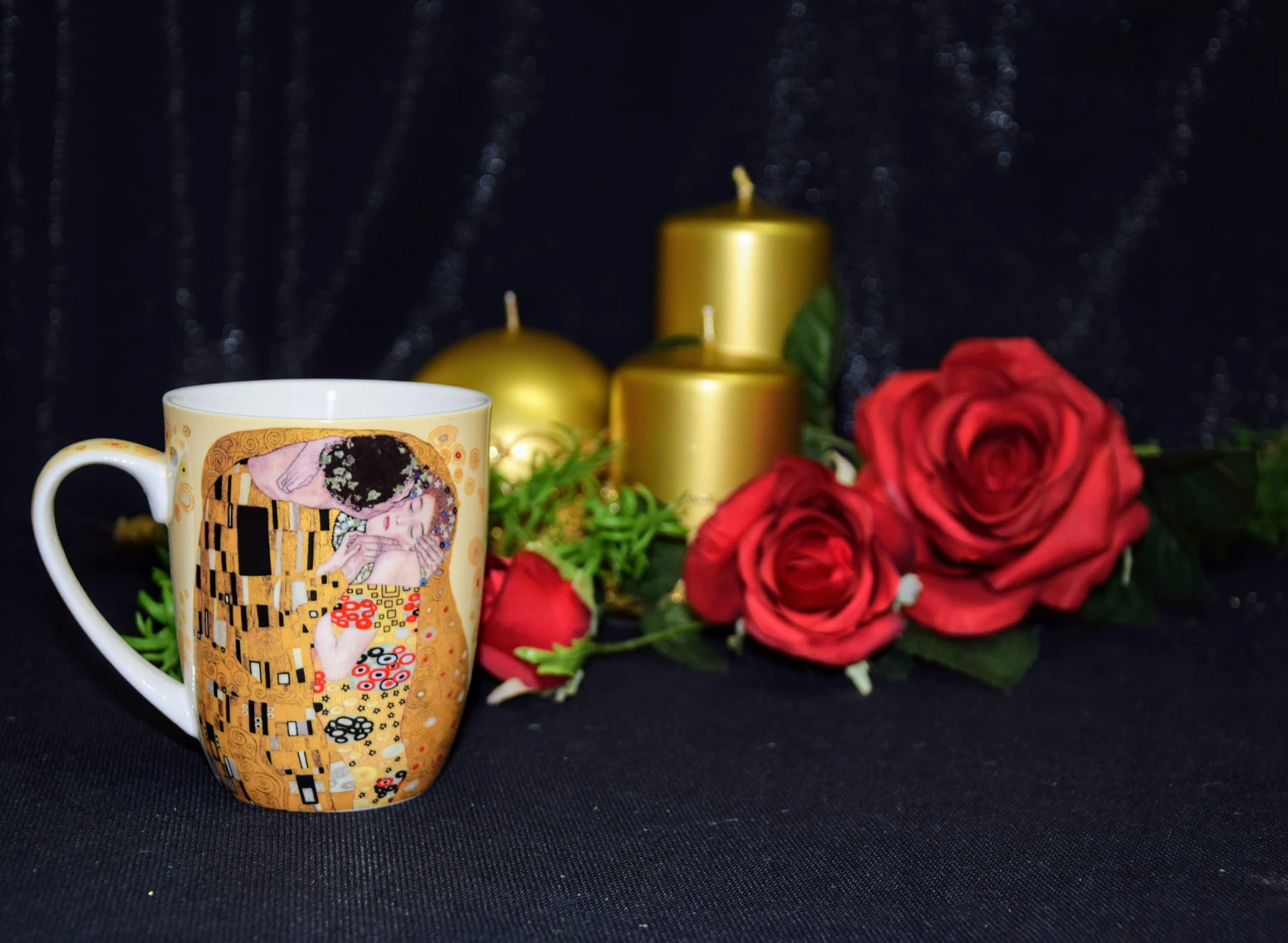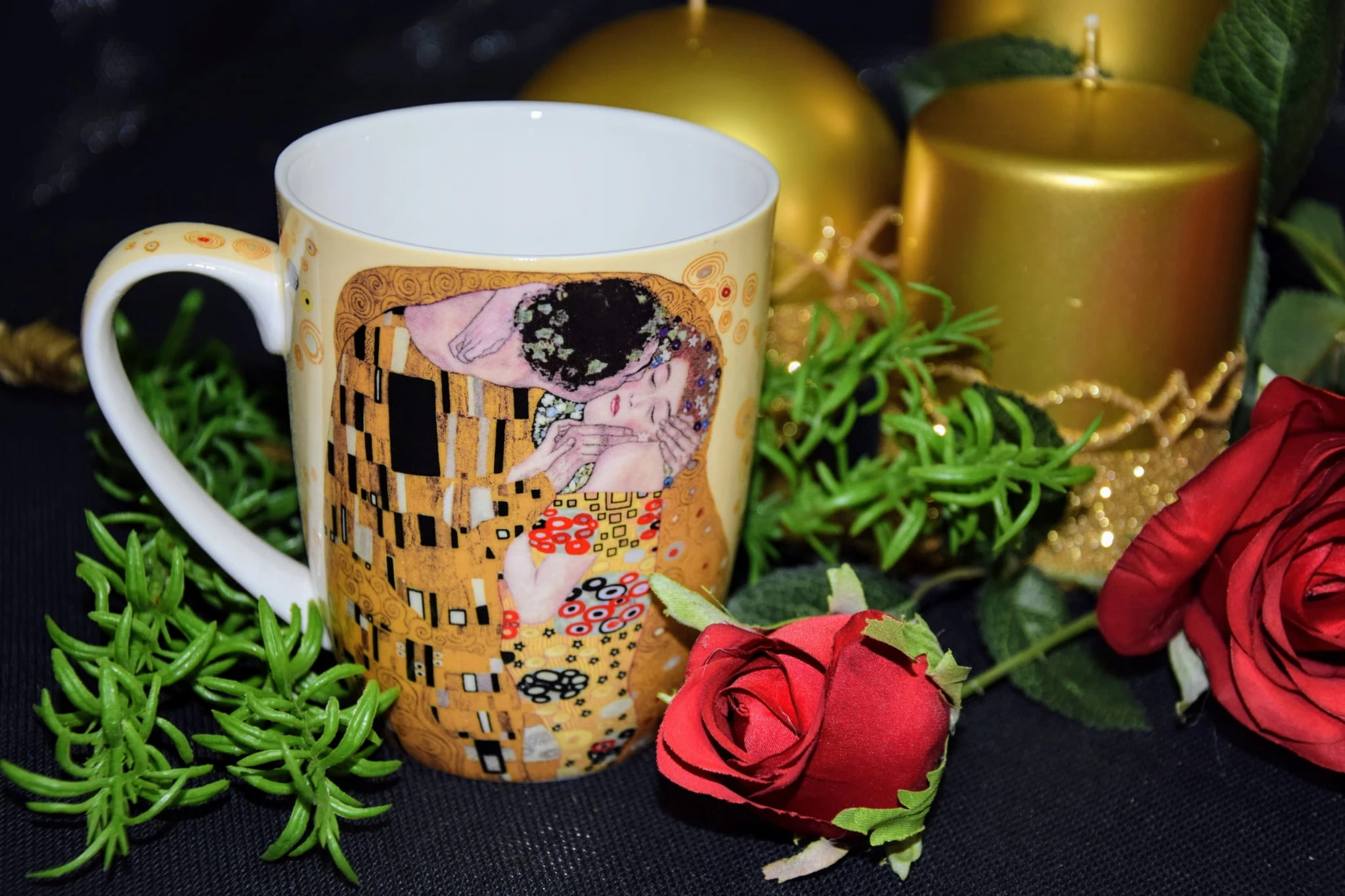 Kubek posiadający zdobienie przedstawiające obraz Gustawa Klimta- Pocałunek.