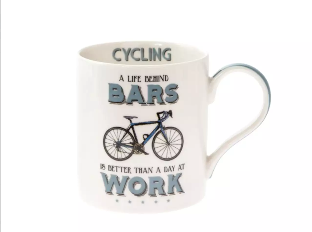 Kubek The Leonardo Collection, z wizerunkiem roweru (po obu stronach kubka), i napisem A LIFE BEHIND BARS IS BETTER THAN A DAY AT WORK.