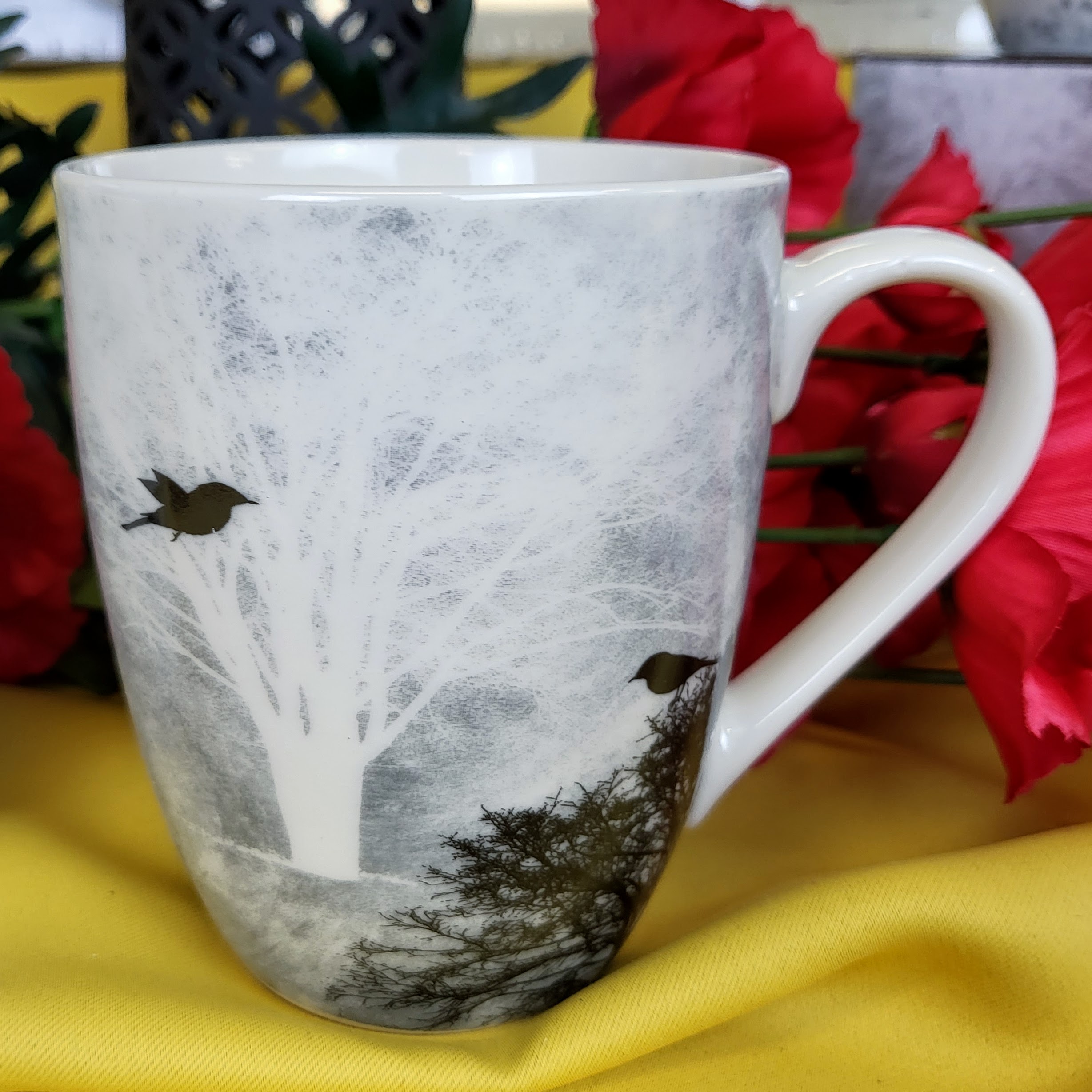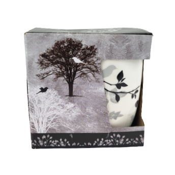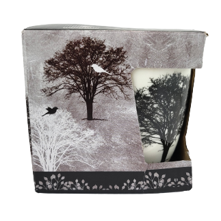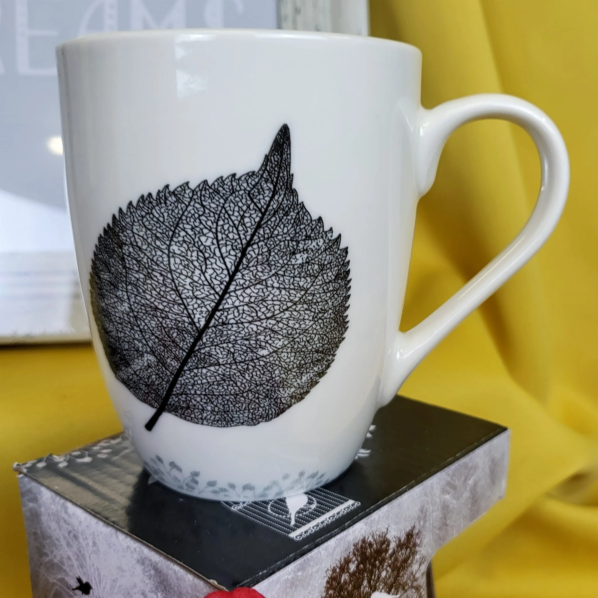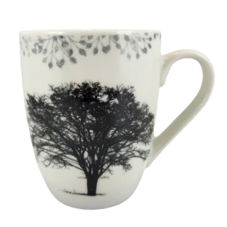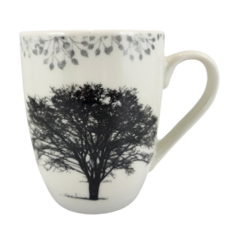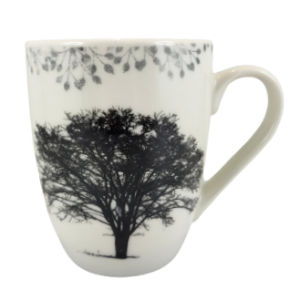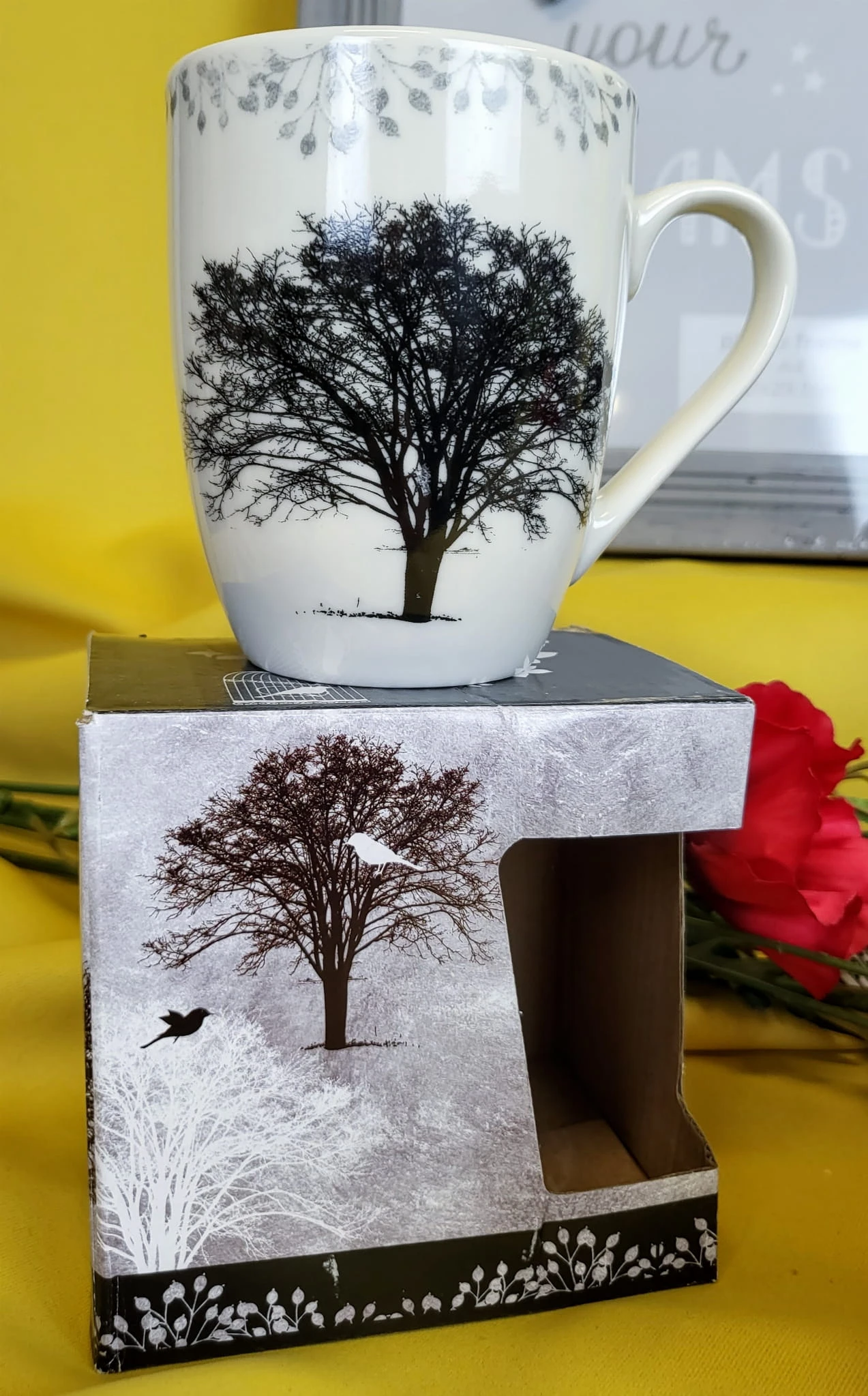 Kubek z eleganckim motywem drzew, liści. Idealny pomysł na drobny upominek dla każdego wielbiciela przyrody lub herbaty.
