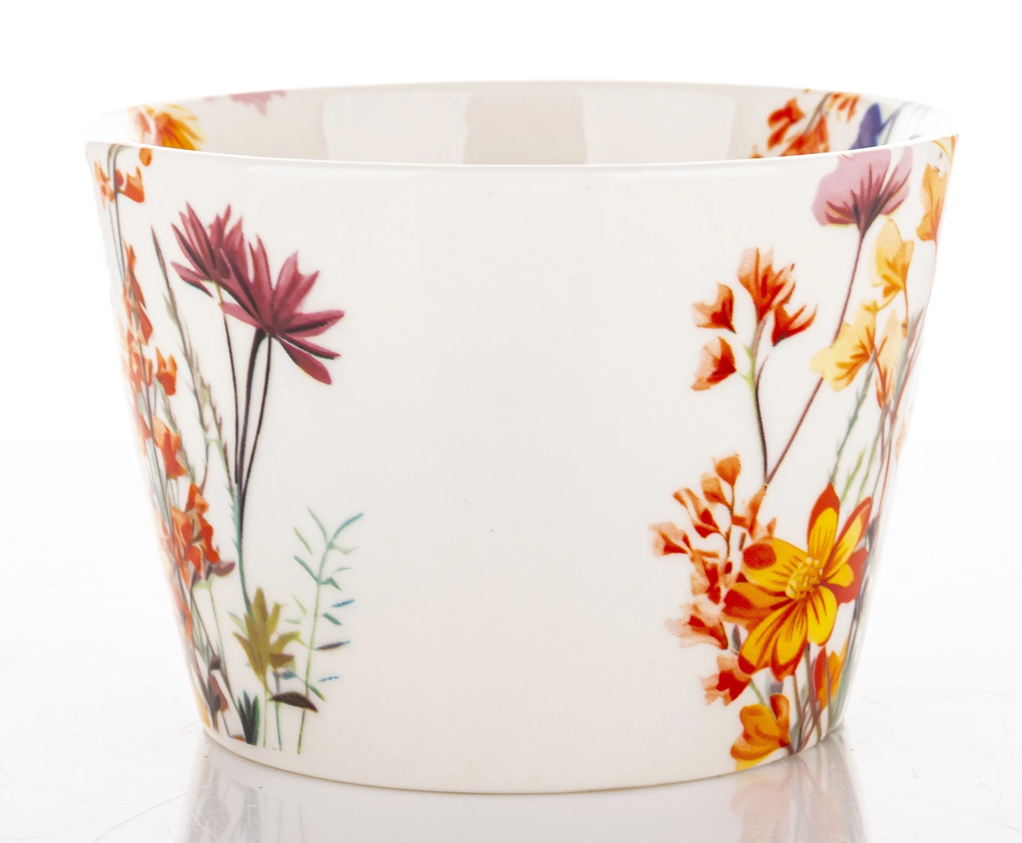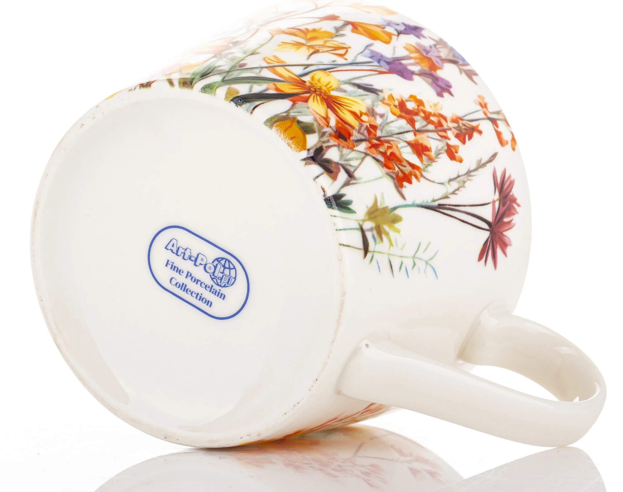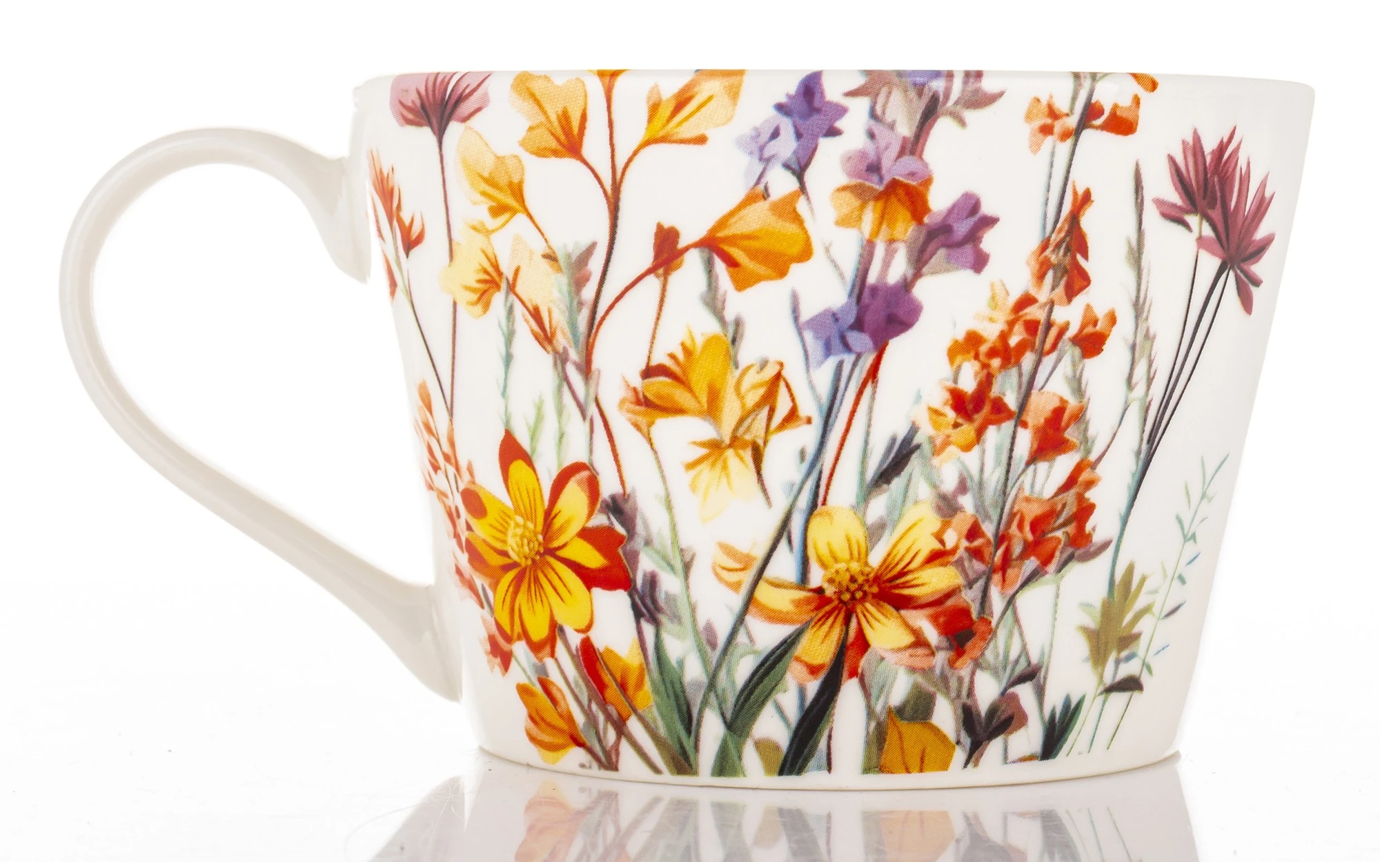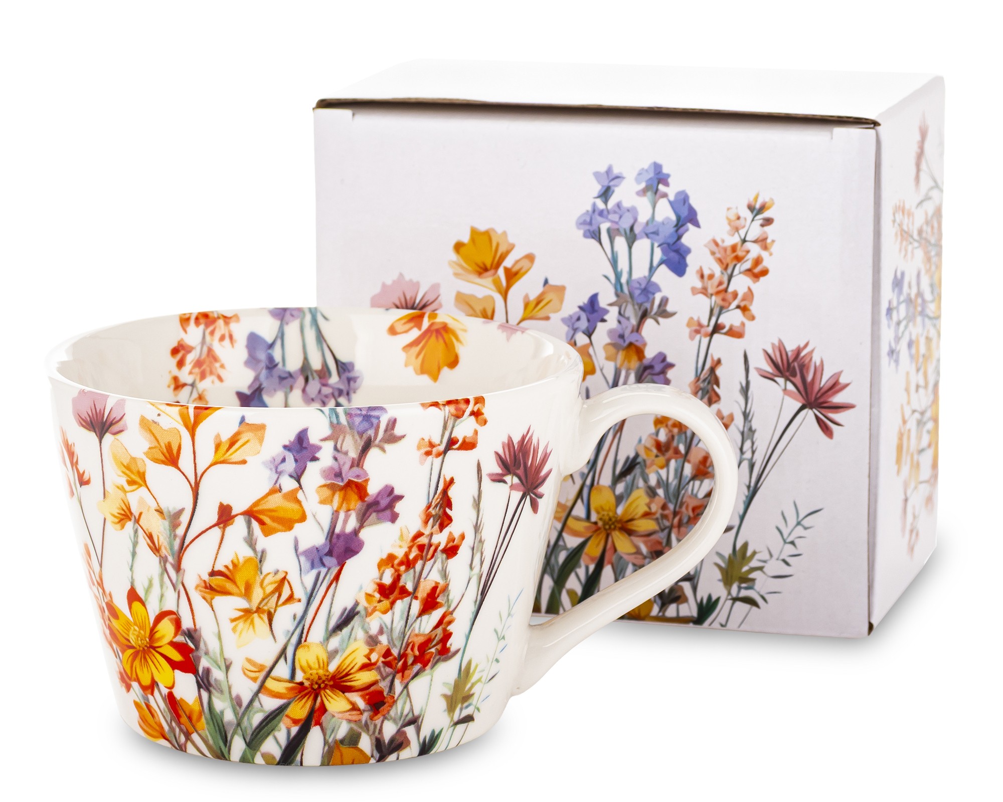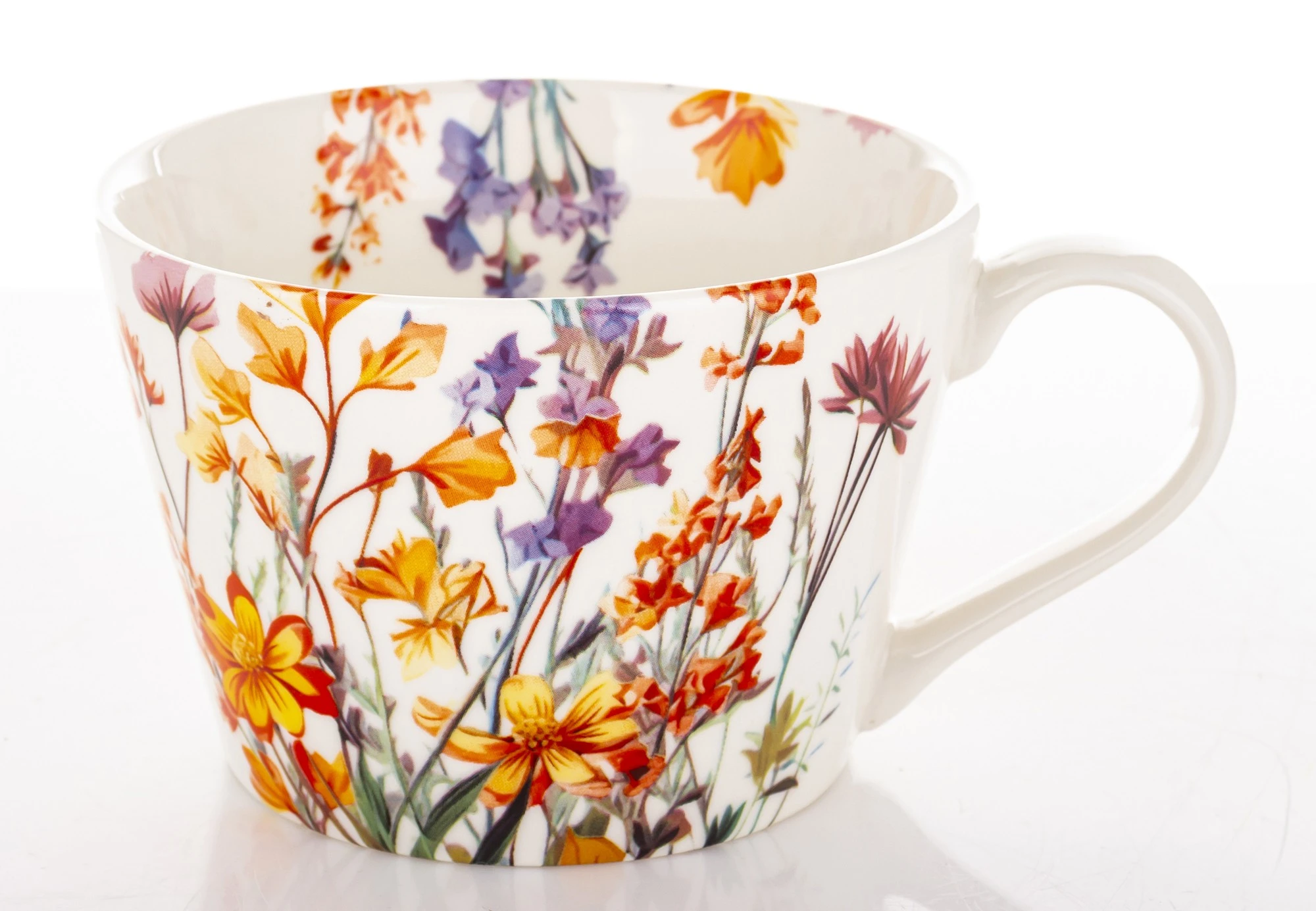 Wprowadź powiew świeżości do swojego domu dzięki temu urokliwemu kubkowi wykonanemu z wysokiej jakości porcelany. Śnieżnobiała powierzchnia naczynia została ozdobiona subtelnym, a zarazem radosnym motywem polnych kwiatów w odcieniach żółci, fioletu i pomarańczu. Grafika jest niezwykle szczegółowa i znajduje się zarówno na zewnątrz, jak i wewnątrz górnej krawędzi naczynia, co nadaje mu unikalny, rzemieślniczy charakter.