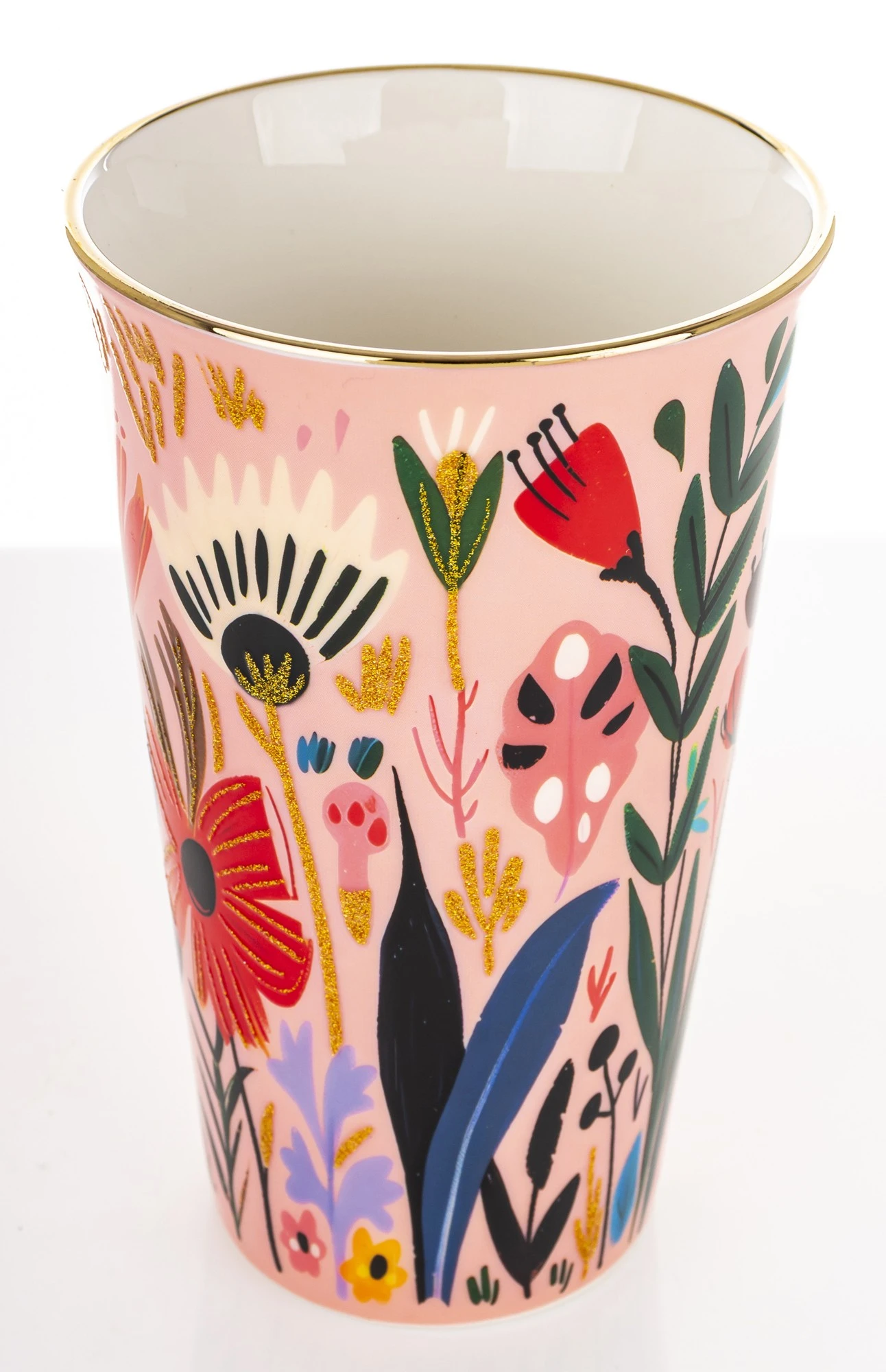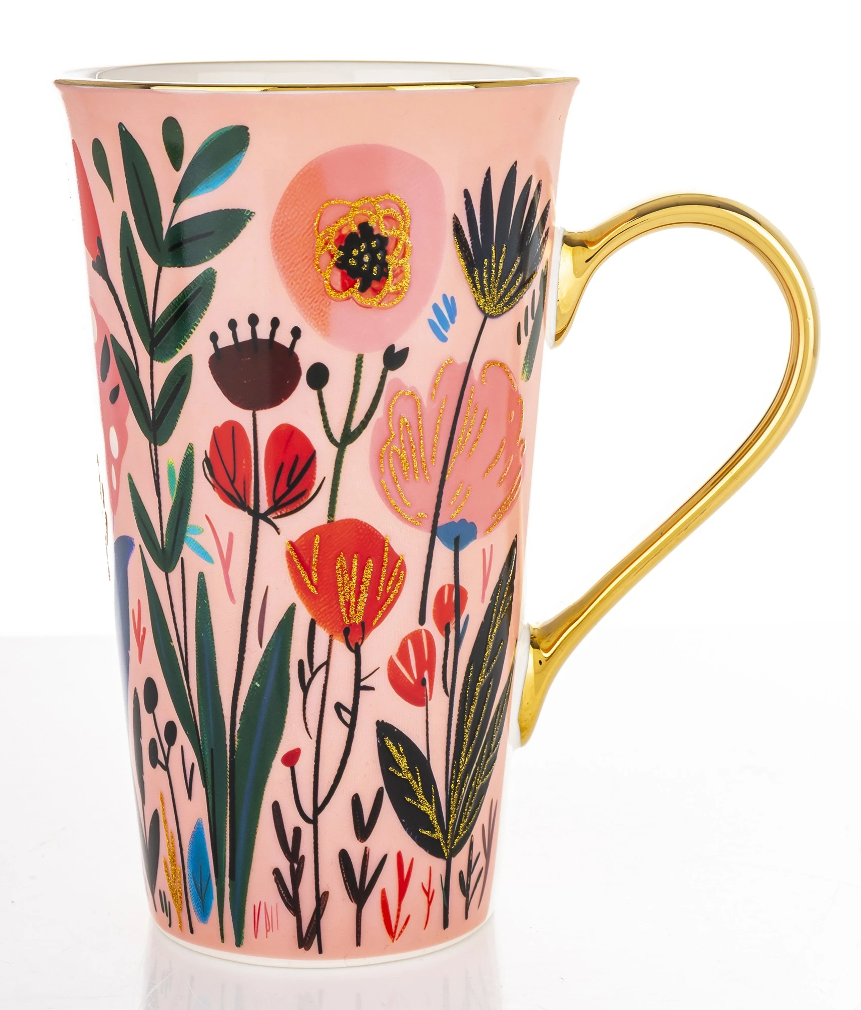 Zanurz się w świecie barw z tym wyjątkowym, dużym kubkiem w kolorze delikatnego różu. Jego powierzchnię zdobią artystyczne ilustracje kwiatów i roślin w nasyconych odcieniach czerwieni, granatu i zieleni, które zostały podkreślone misternymi, złotymi zdobieniami. Całość dopełnia luksusowe, w pełni złocone ucho, które sprawia, że kubek staje się małym dziełem sztuki użytkowej.