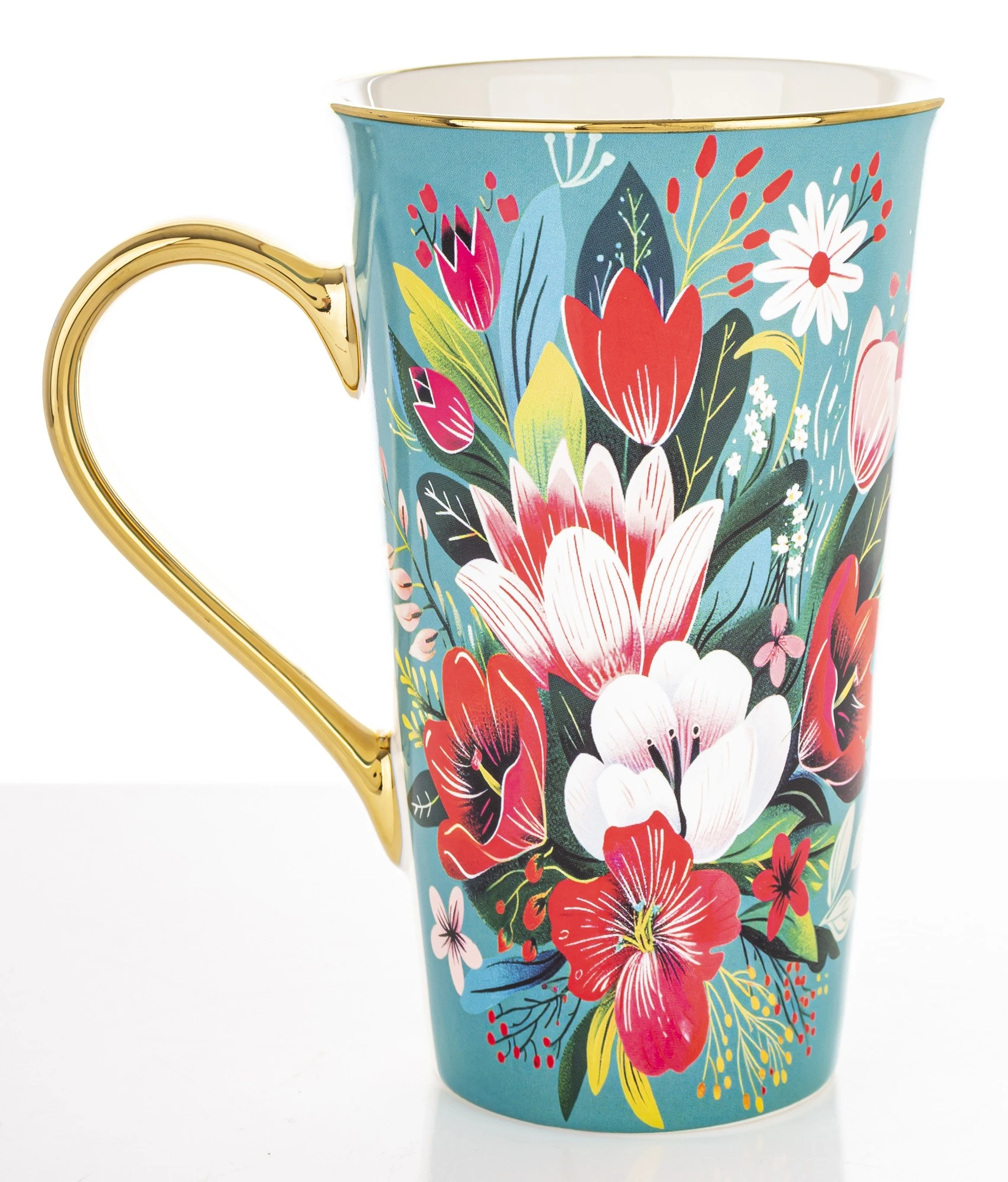 Dodaj energii swoim porankom dzięki temu wyjątkowemu kubkowi w nasyconym kolorze turkusowym. Cała powierzchnia naczynia pokryta jest gęstym, artystycznym wzorem przedstawiającym białe, różowe i czerwone kwiaty, które tworzą efektowną, barwną kompozycję. Wyjątkowy charakter podkreśla szerokie, w pełni złocone ucho oraz złoty brzeg, które nadają całości elegancji i prestiżu.