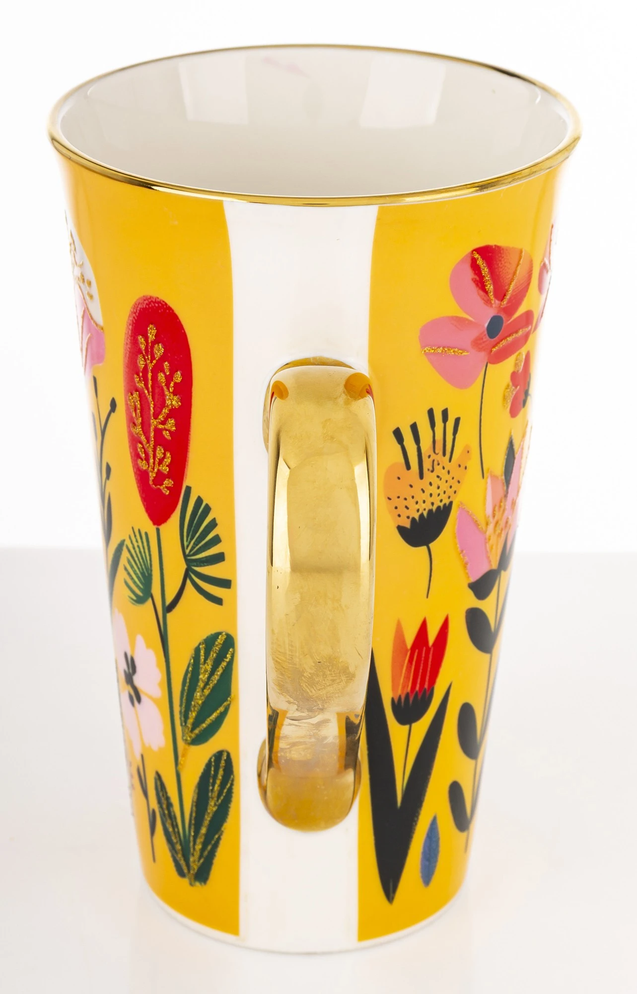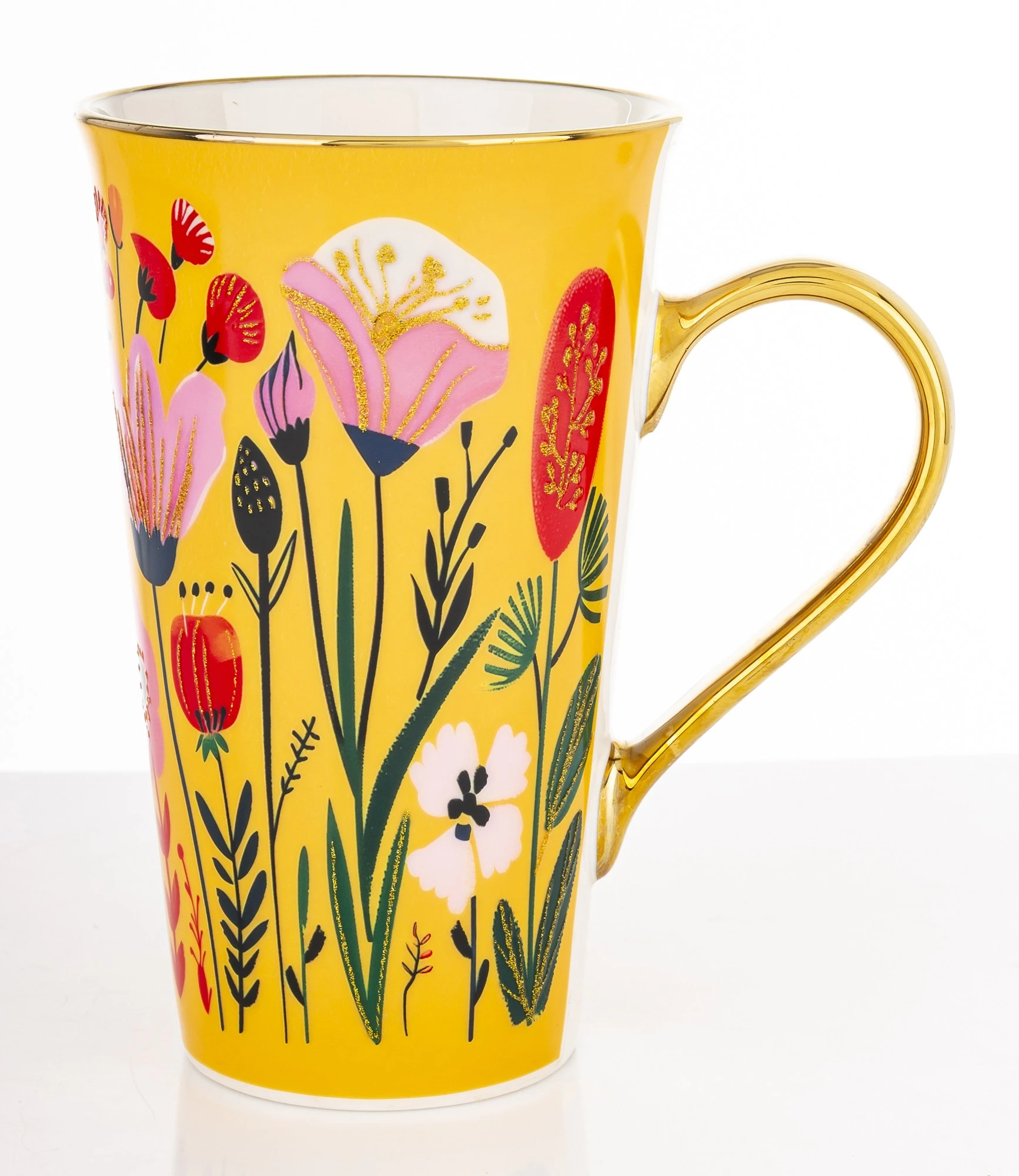 Rozpocznij dzień z uśmiechem dzięki temu wyjątkowemu kubkowi w intensywnym, żółtym kolorze. Powierzchnię naczynia zdobi artystyczny, wielobarwny motyw łąki pełnej polnych kwiatów w odcieniach różu, czerwieni i bieli. Całość została wzbogacona o subtelne, złote drobinki na wzorze oraz eleganckie, w pełni złocone ucho, które nadaje naczyniu luksusowego charakteru.