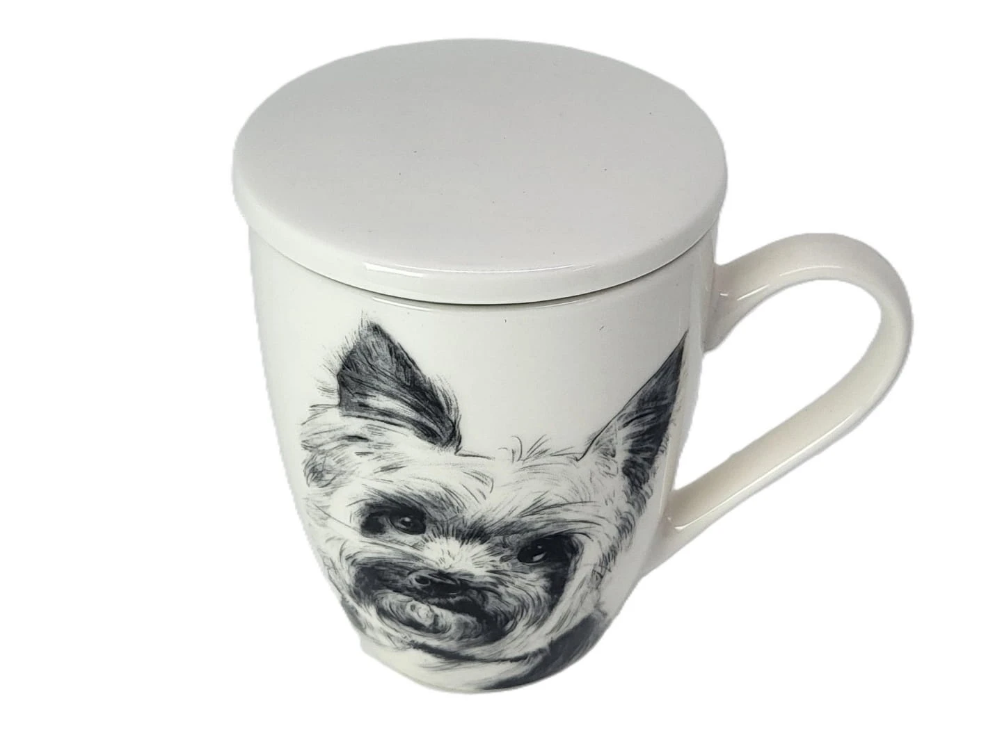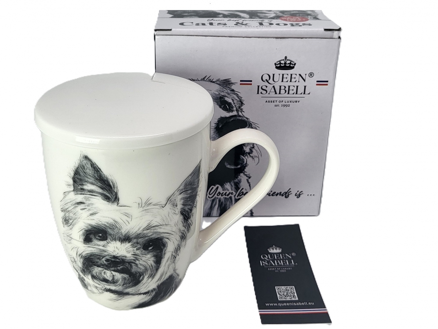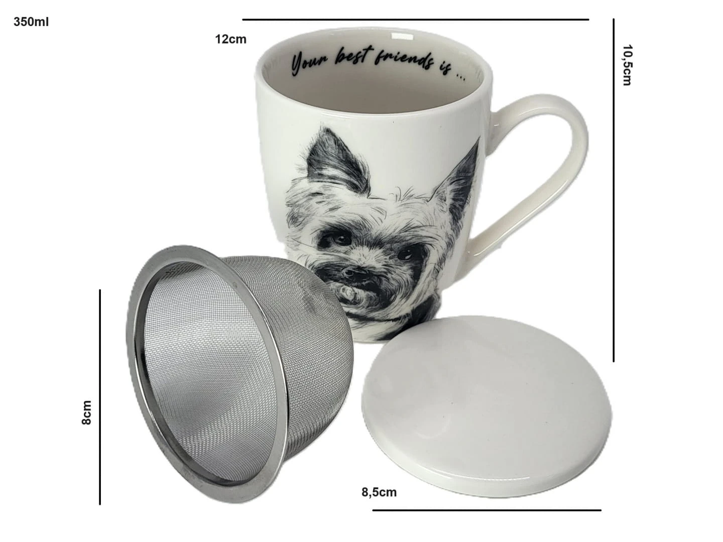 Kubek porcelany z przykrywką i sitkiem z rysunkiem Yorkshire Teriera, zapakowany w eleganckie opakowanie prezentowe. Ten uroczy kubek jest idealnym dodatkiem do porannej kawy lub herbaty dla miłośników psów, zwłaszcza tych, którzy kochają Yorkshire Teriery.