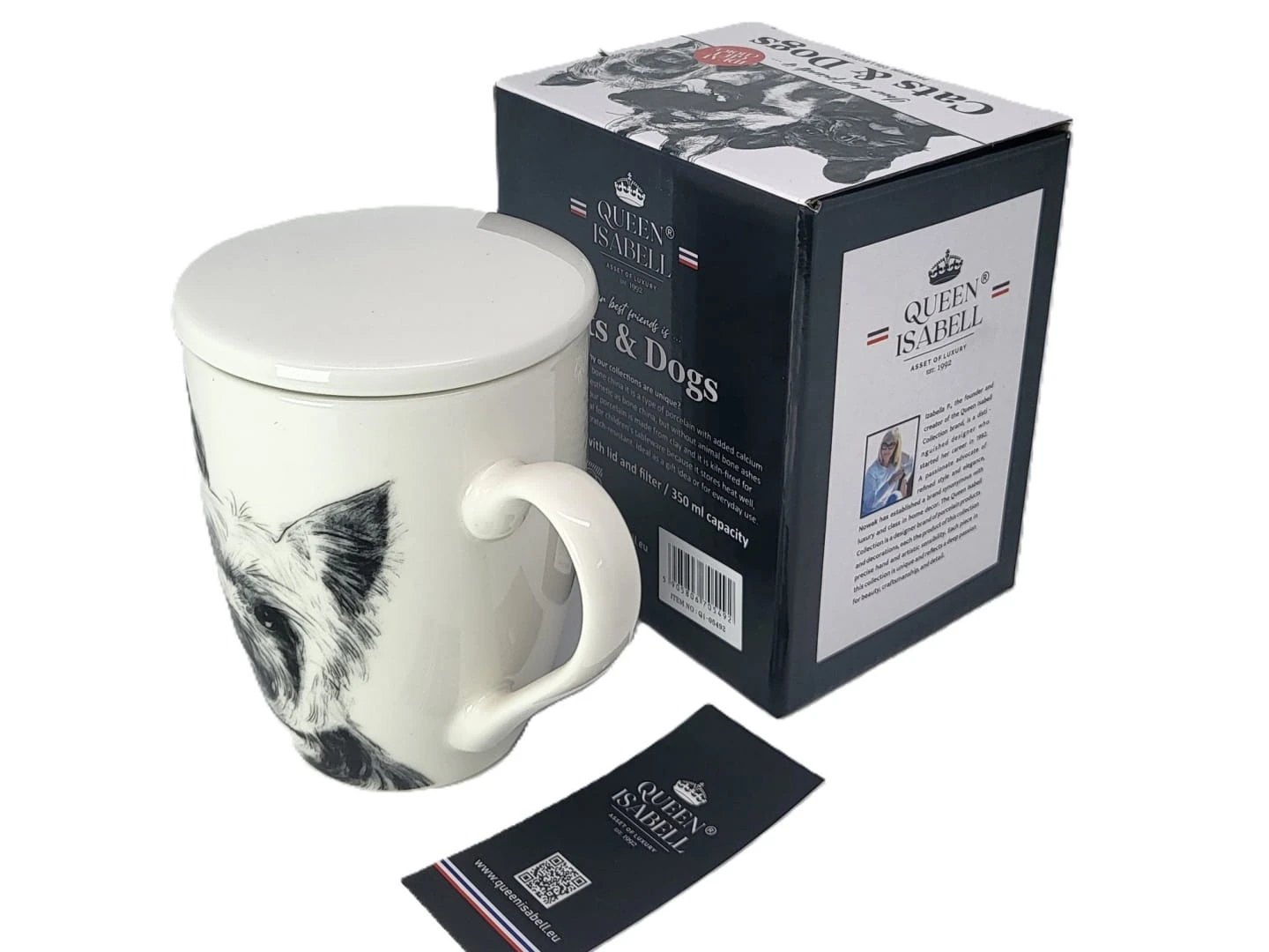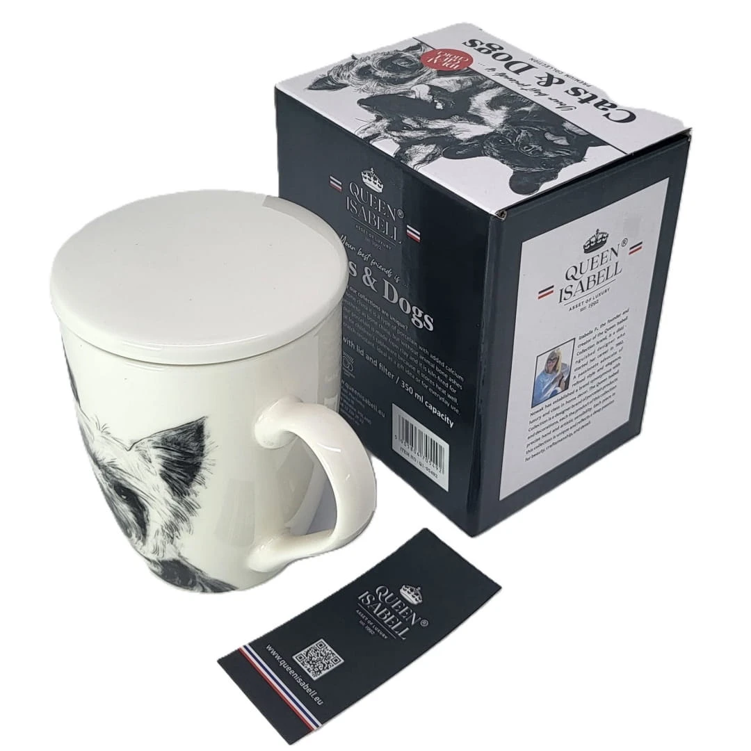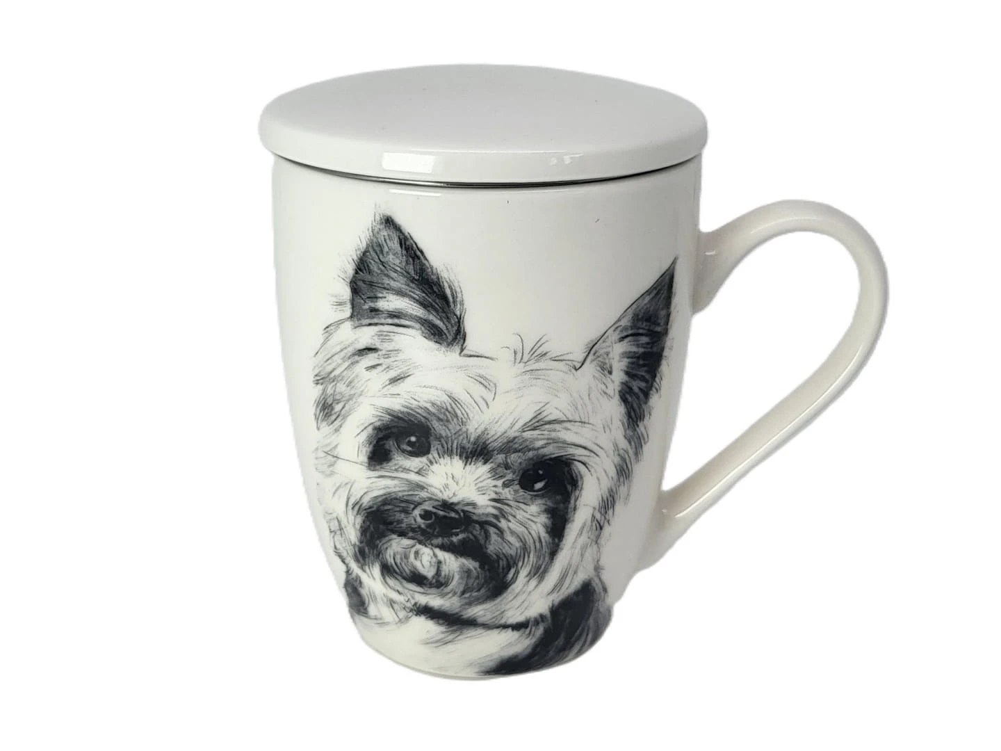 Kubek porcelany z przykrywką i sitkiem z rysunkiem Yorkshire Teriera, zapakowany w eleganckie opakowanie prezentowe. Ten uroczy kubek jest idealnym dodatkiem do porannej kawy lub herbaty dla miłośników psów, zwłaszcza tych, którzy kochają Yorkshire Teriery.