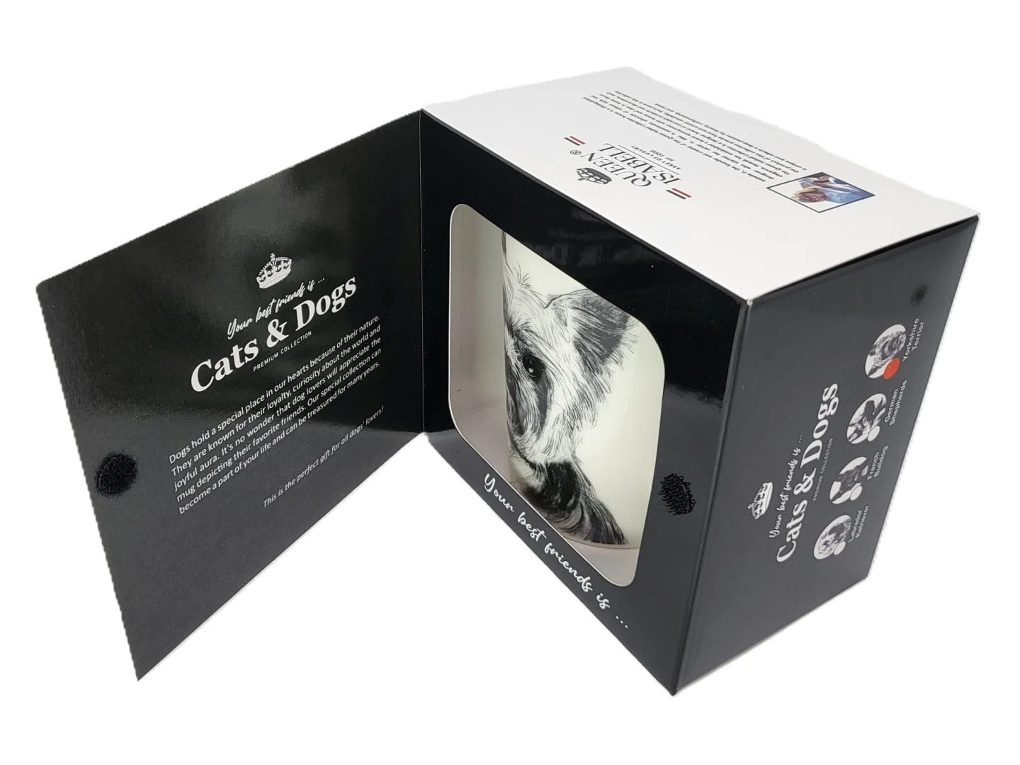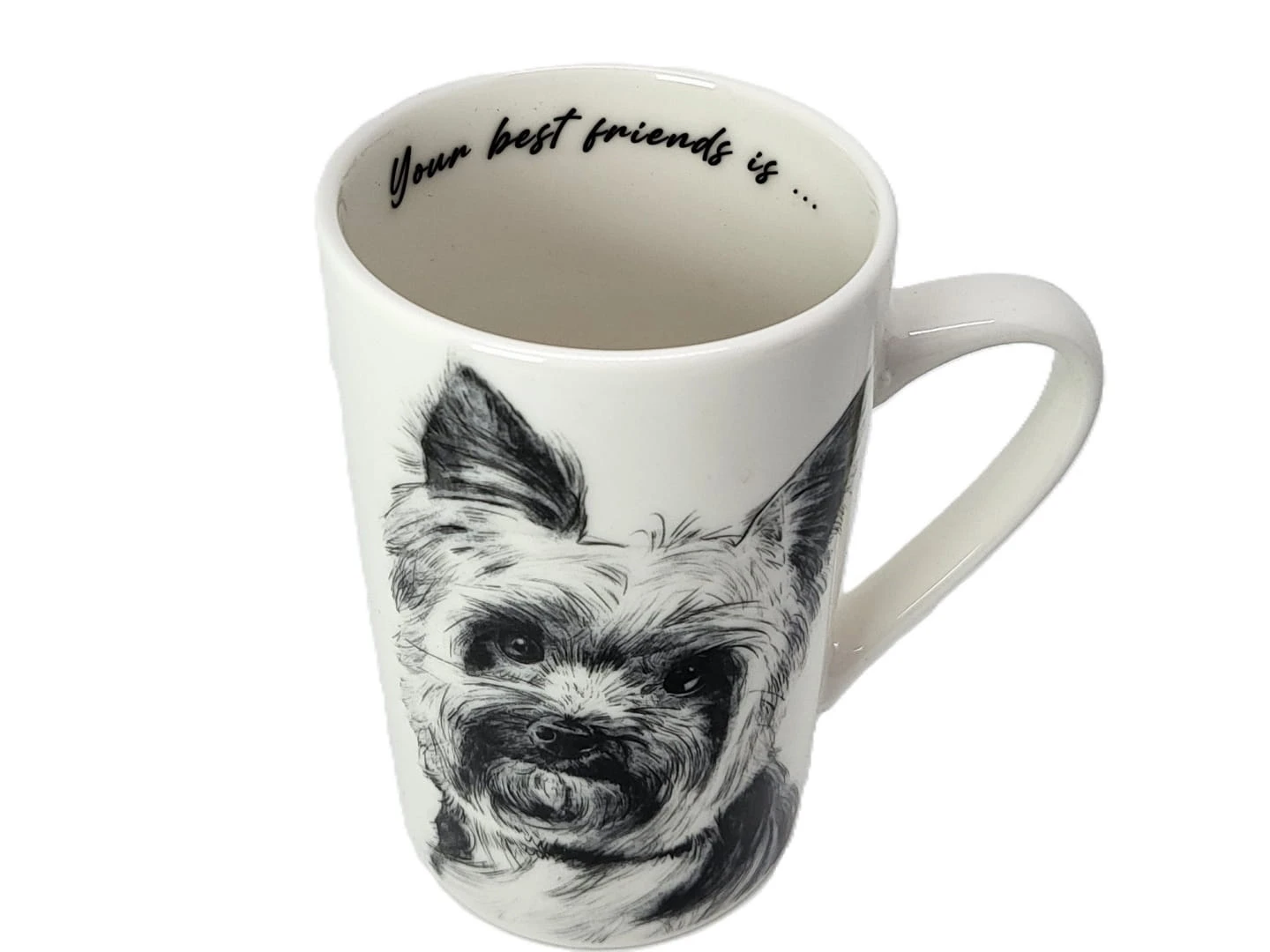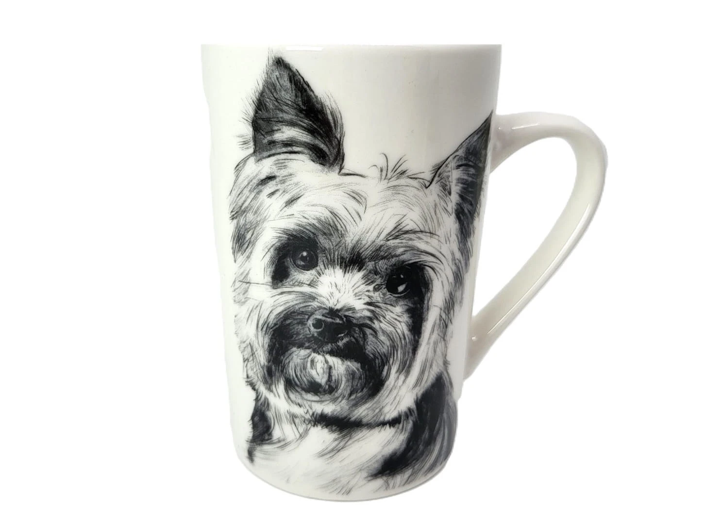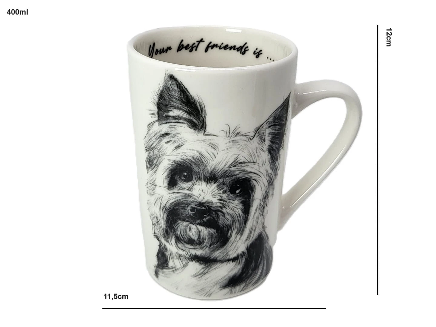 Kubek porcelanowy z rysunkiem Yorkshire Teriera, zapakowany w prezentowe opakowanie. Ten uroczy kubek jest idealny dla miłośników psów, zwłaszcza tych, którzy uwielbiają Yorkshire Teriery.