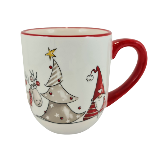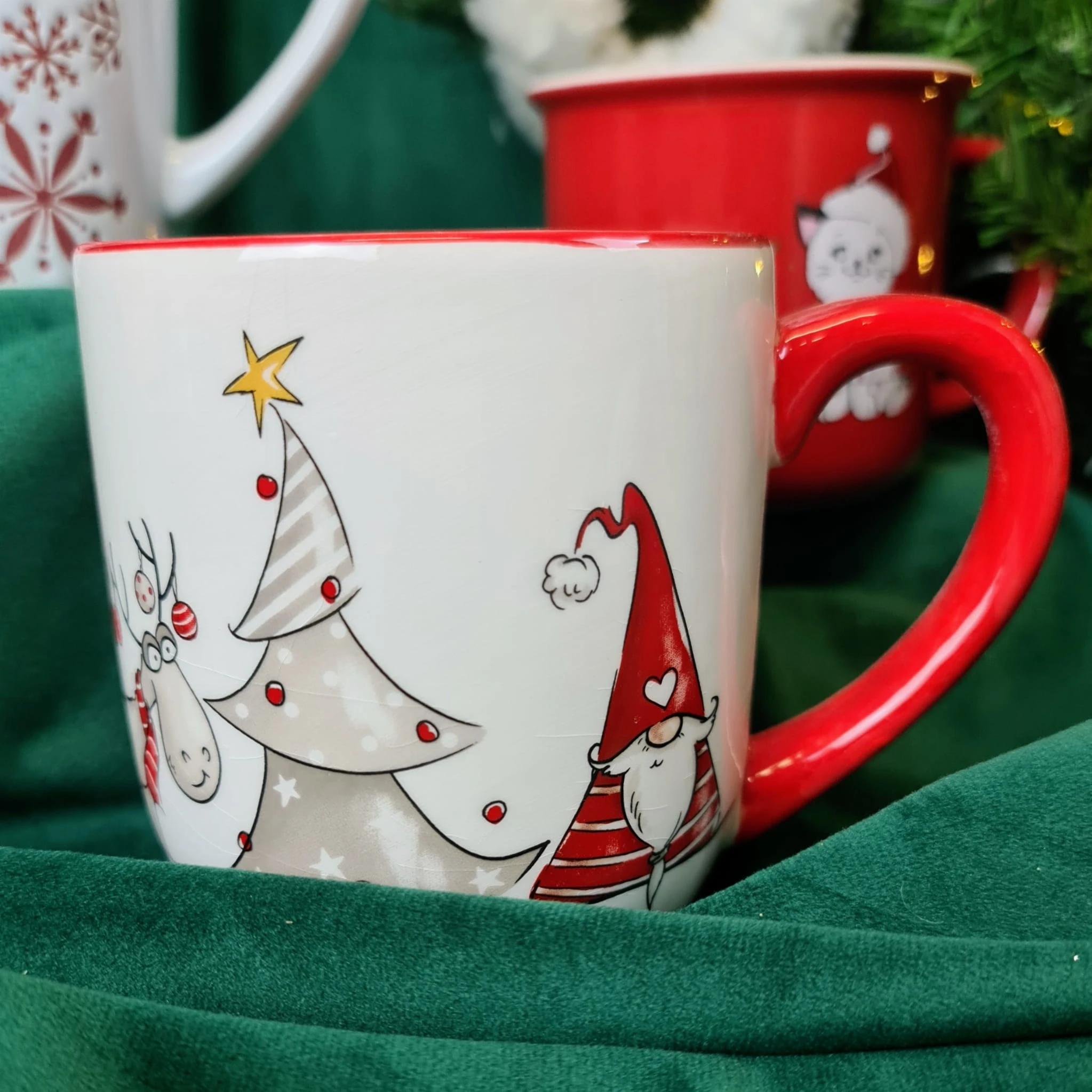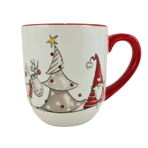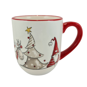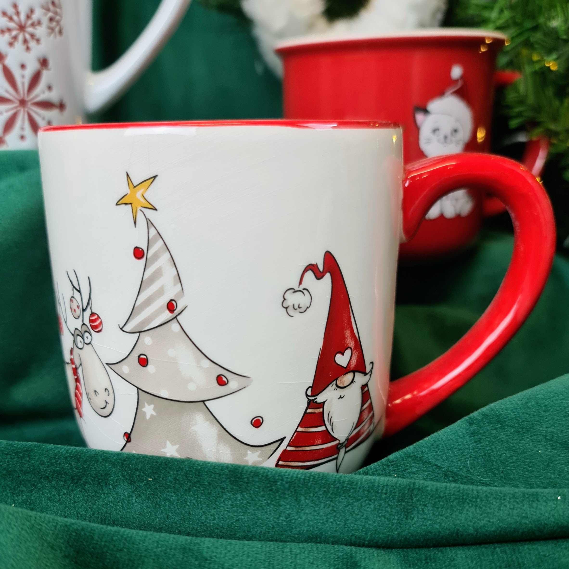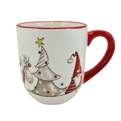 Sympatyczny ceramiczny kubek z Mikołajem, choinką i reniferem.