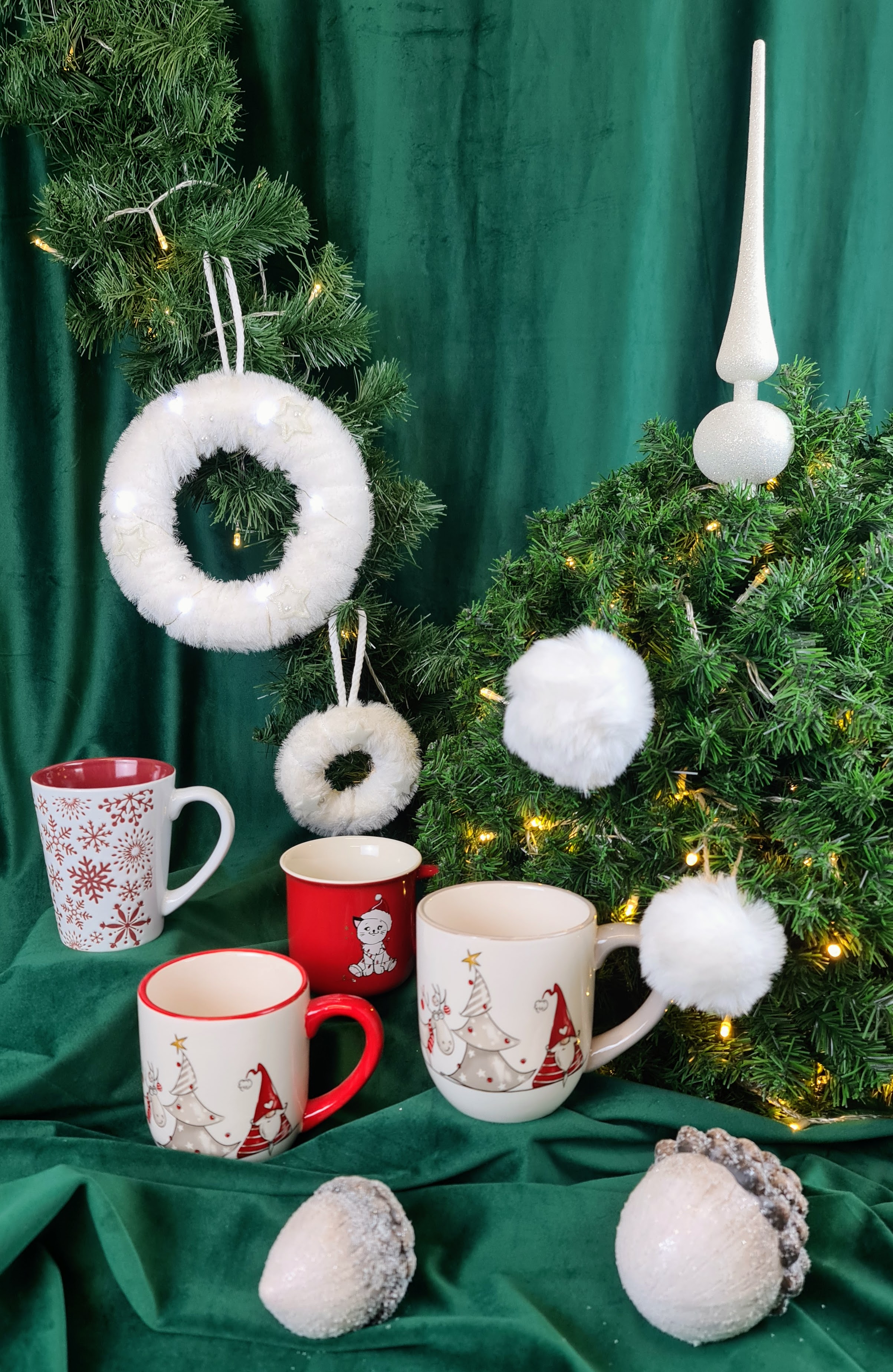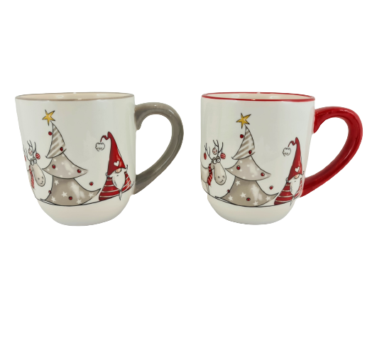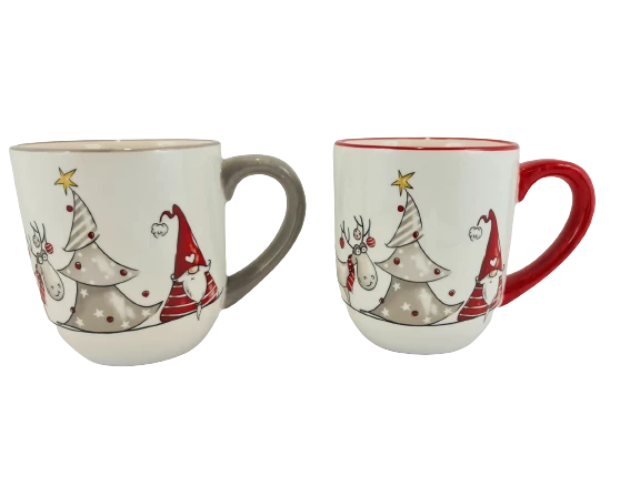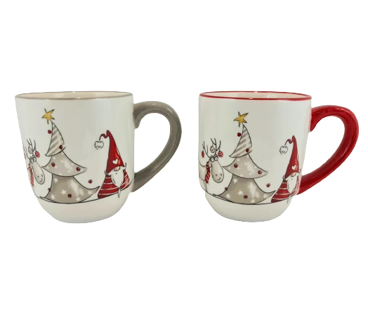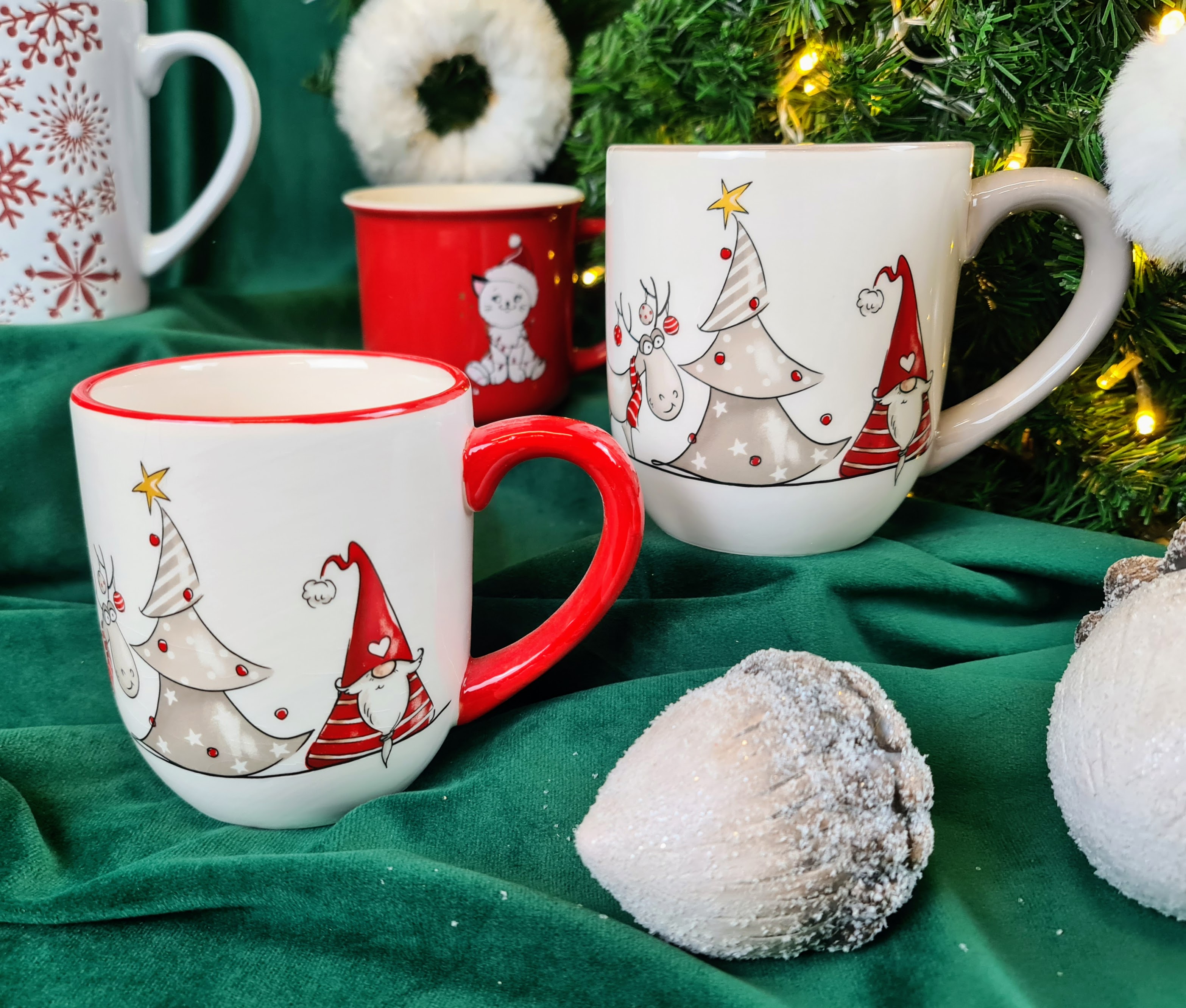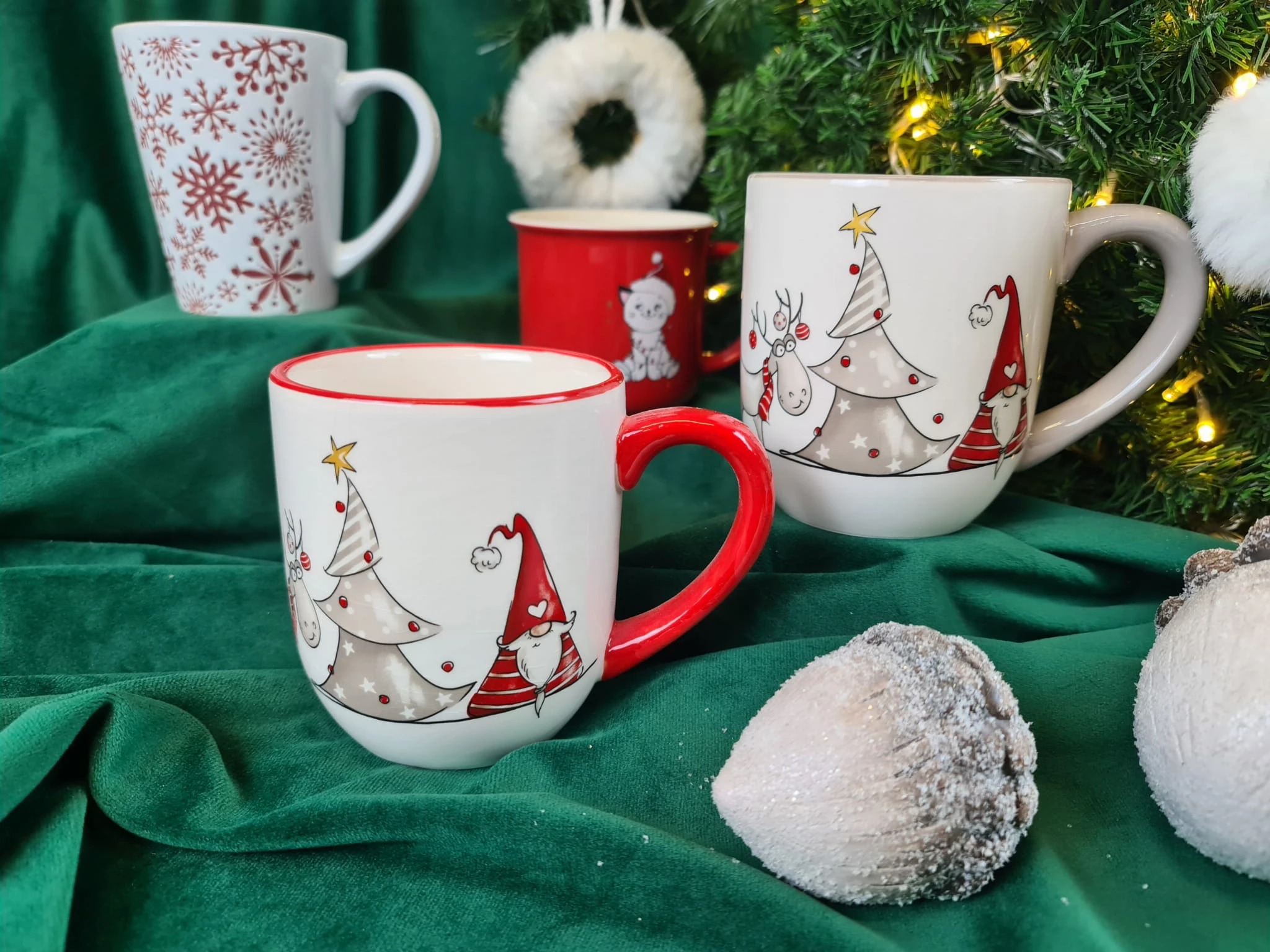 Sympatyczny ceramiczny kubek z Mikołajem, choinką i reniferem.