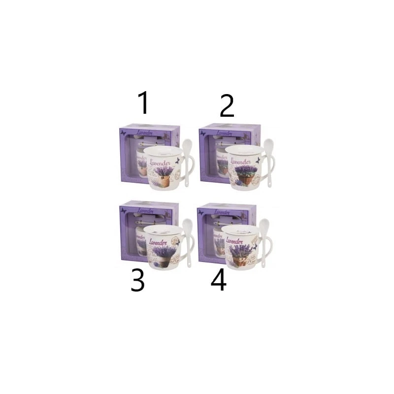 Kubek wykonany z porcelany, z łyżeczką oraz podstawką/przykrywką do każdego kubka.