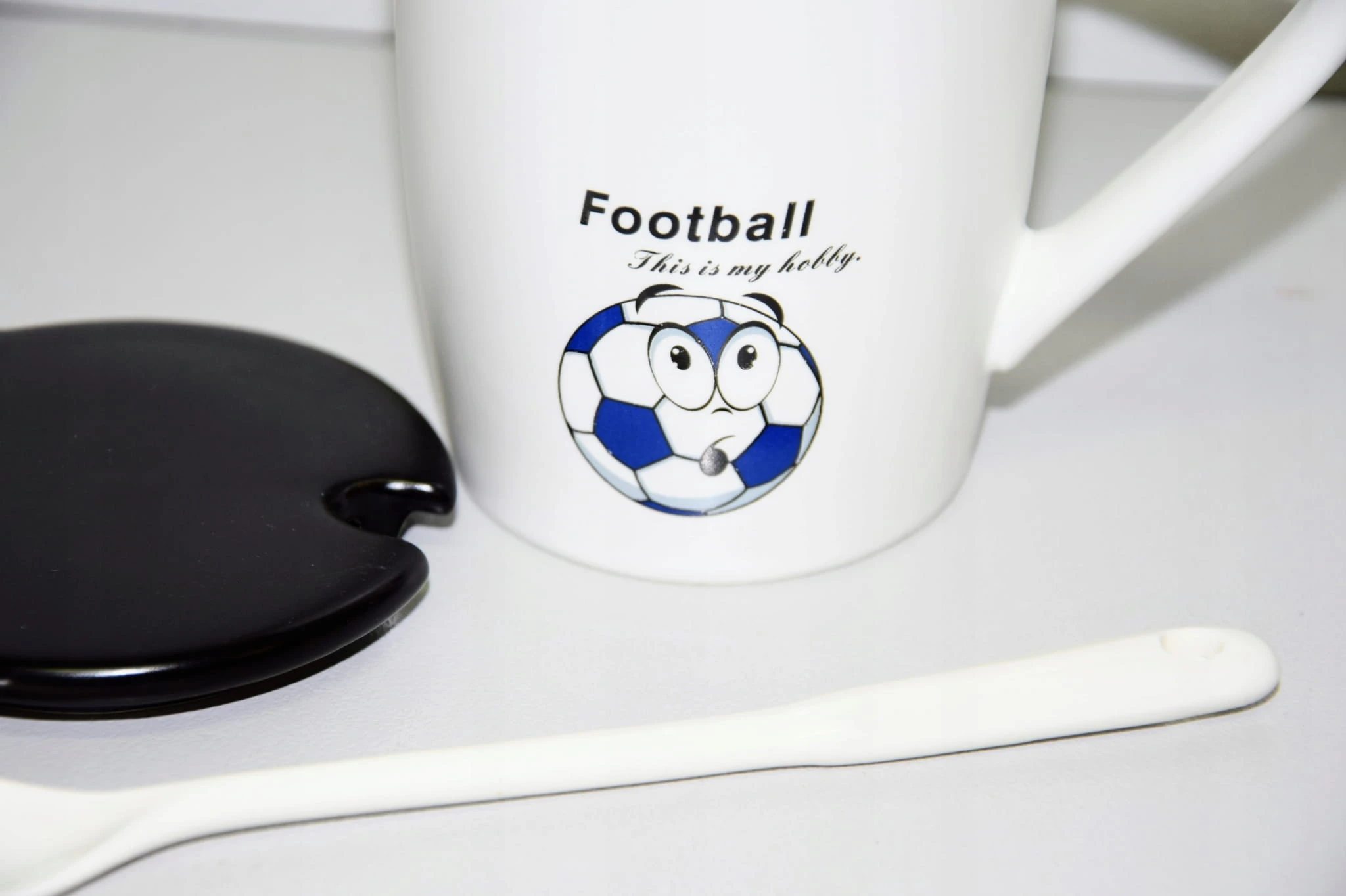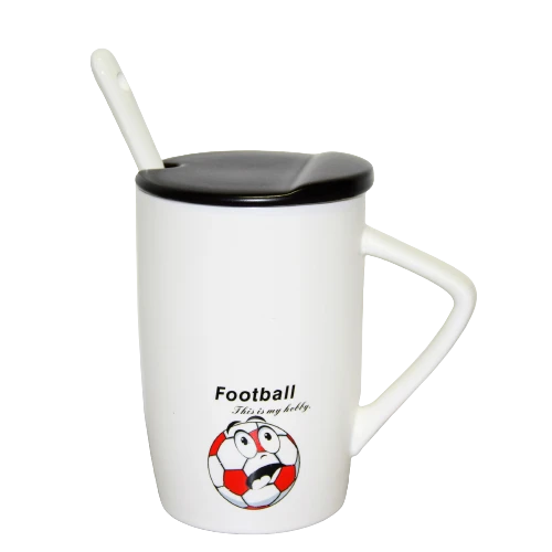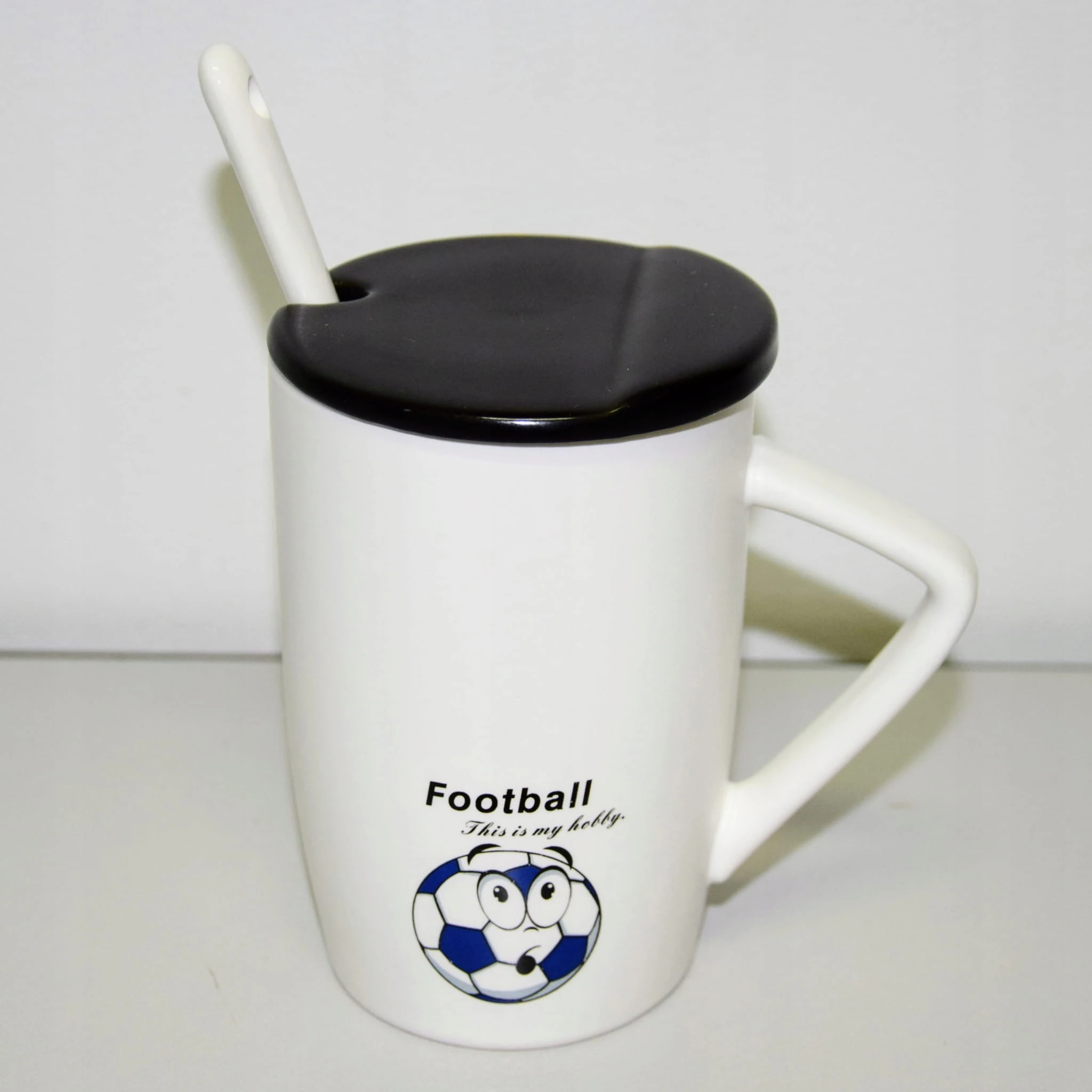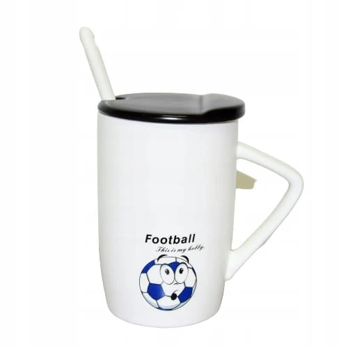 Zabawny, prosty kubek wykonany z porcelany, z łyżeczką oraz przykrywką.