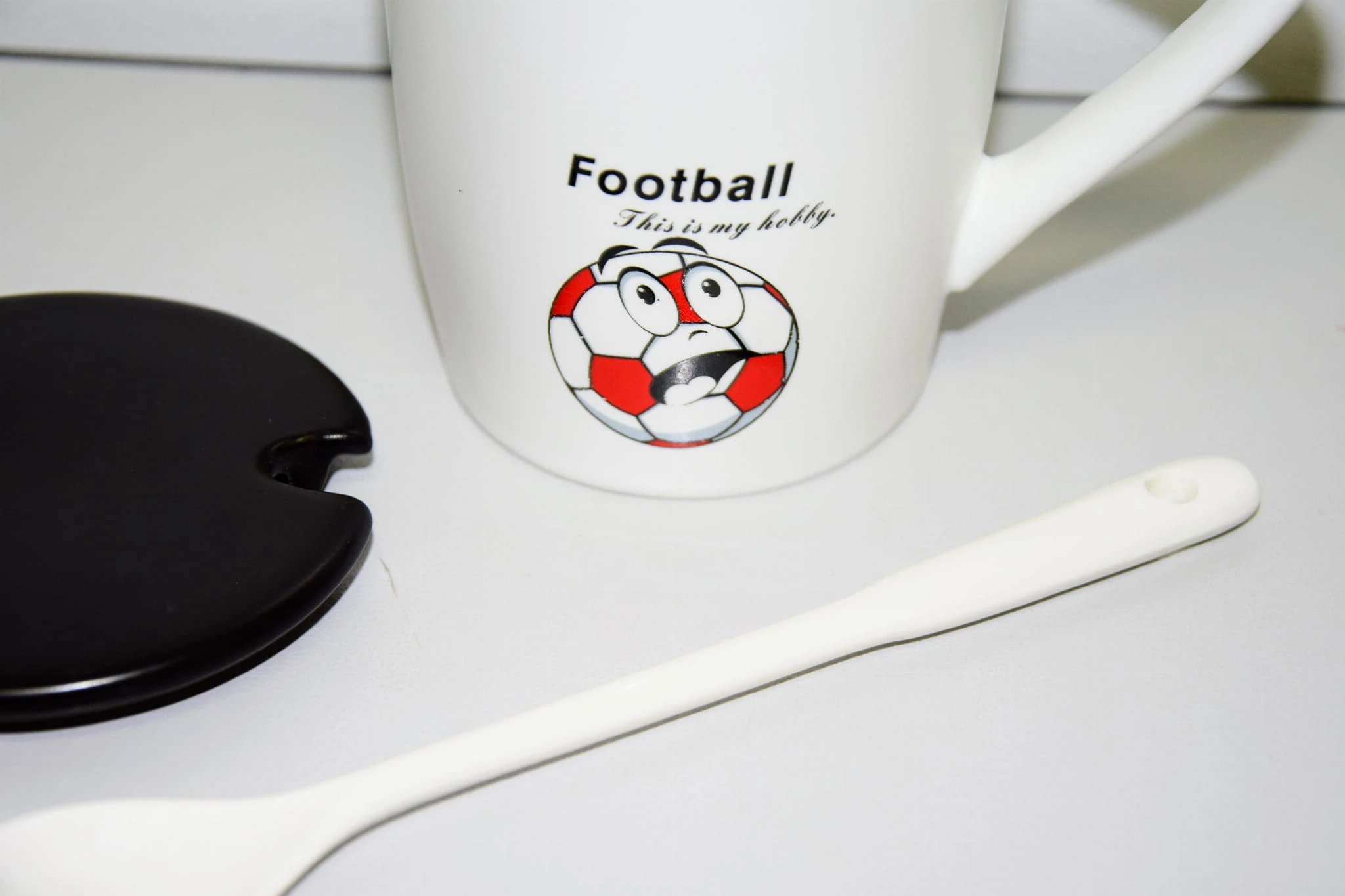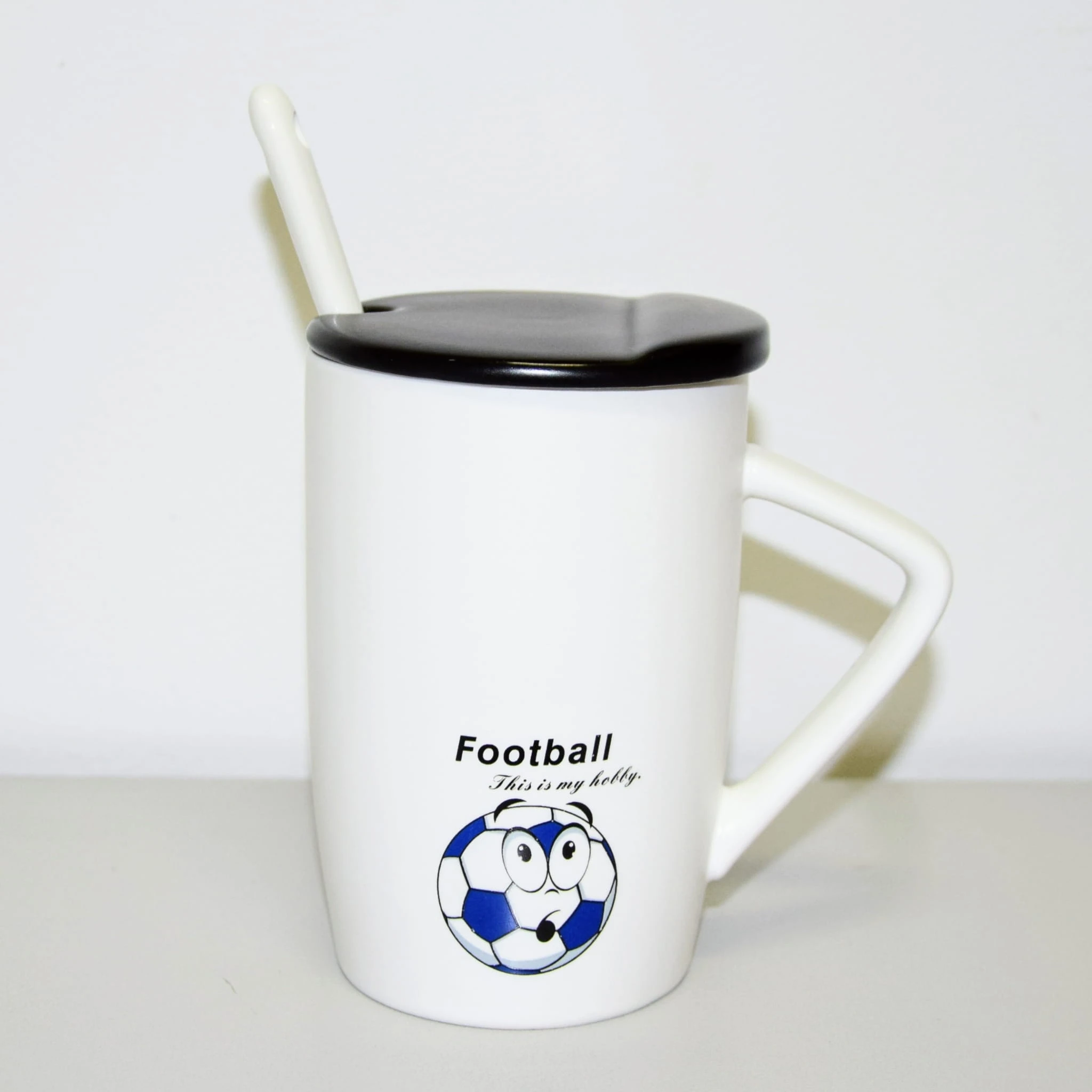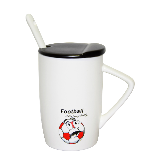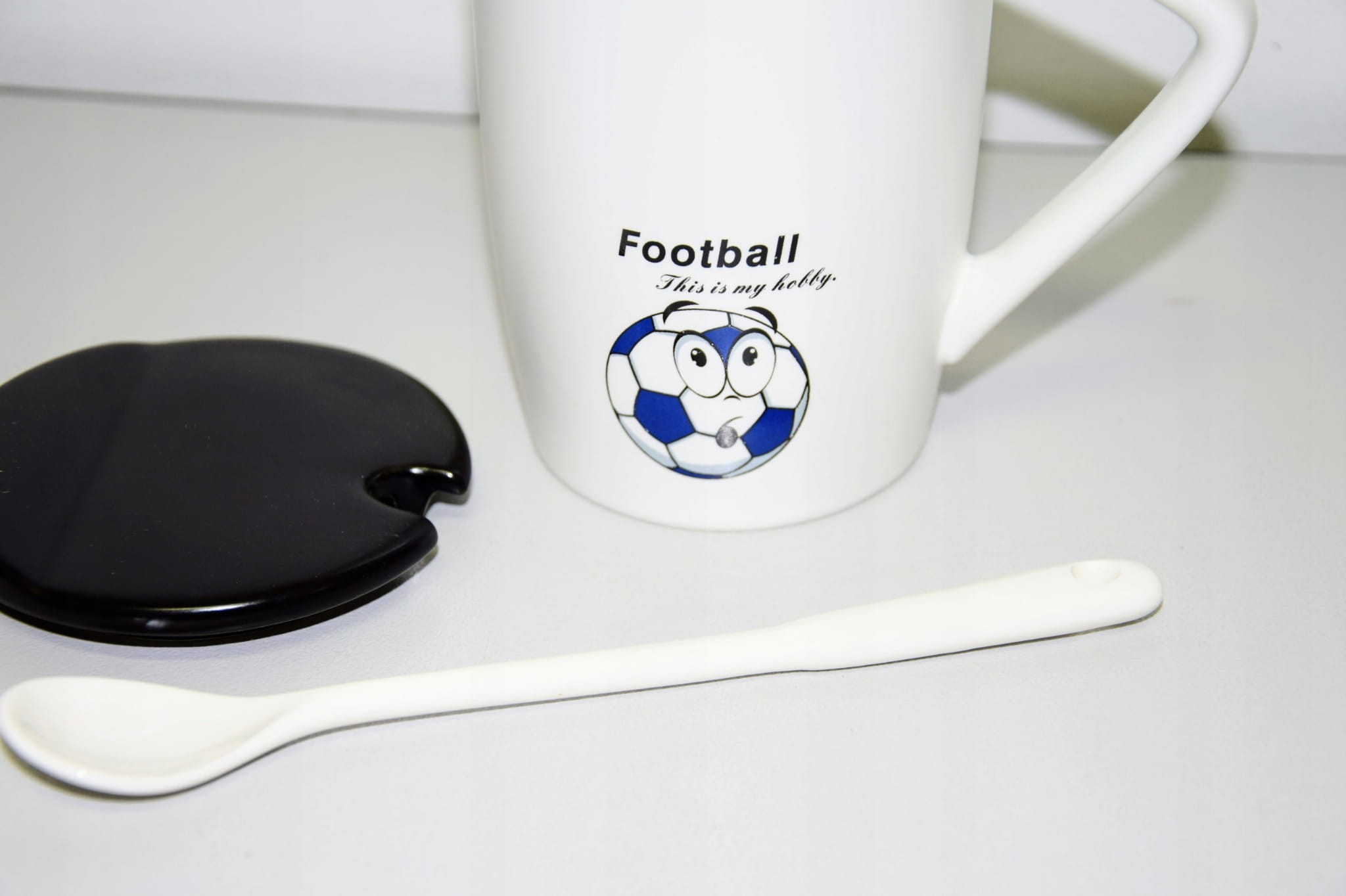 Zabawny, prosty kubek wykonany z porcelany, z łyżeczką oraz przykrywką.