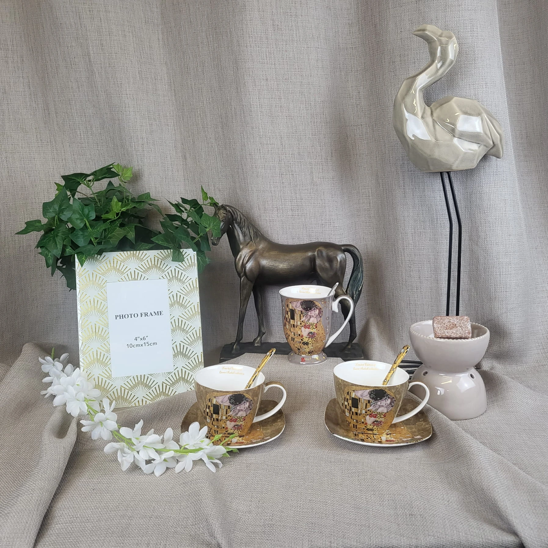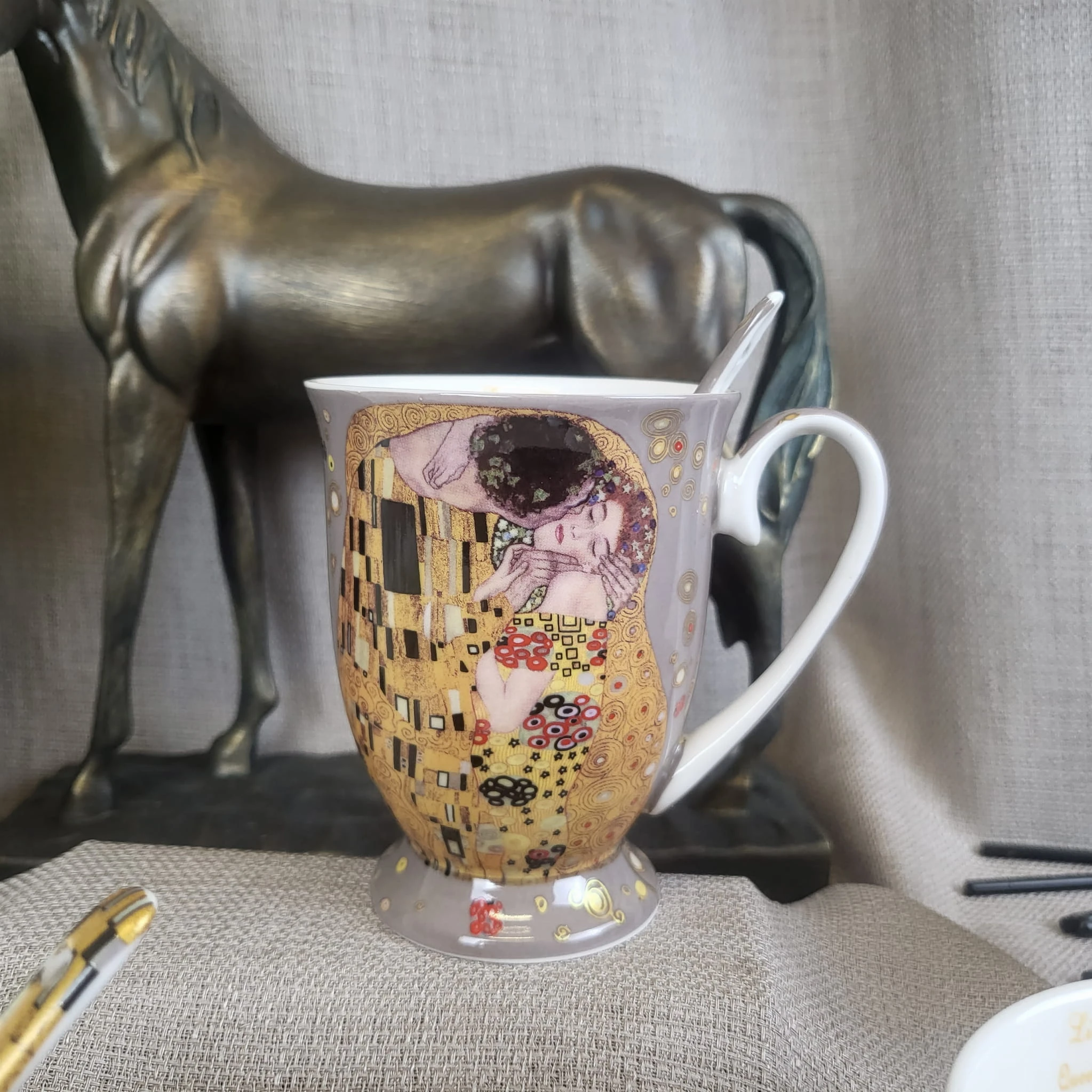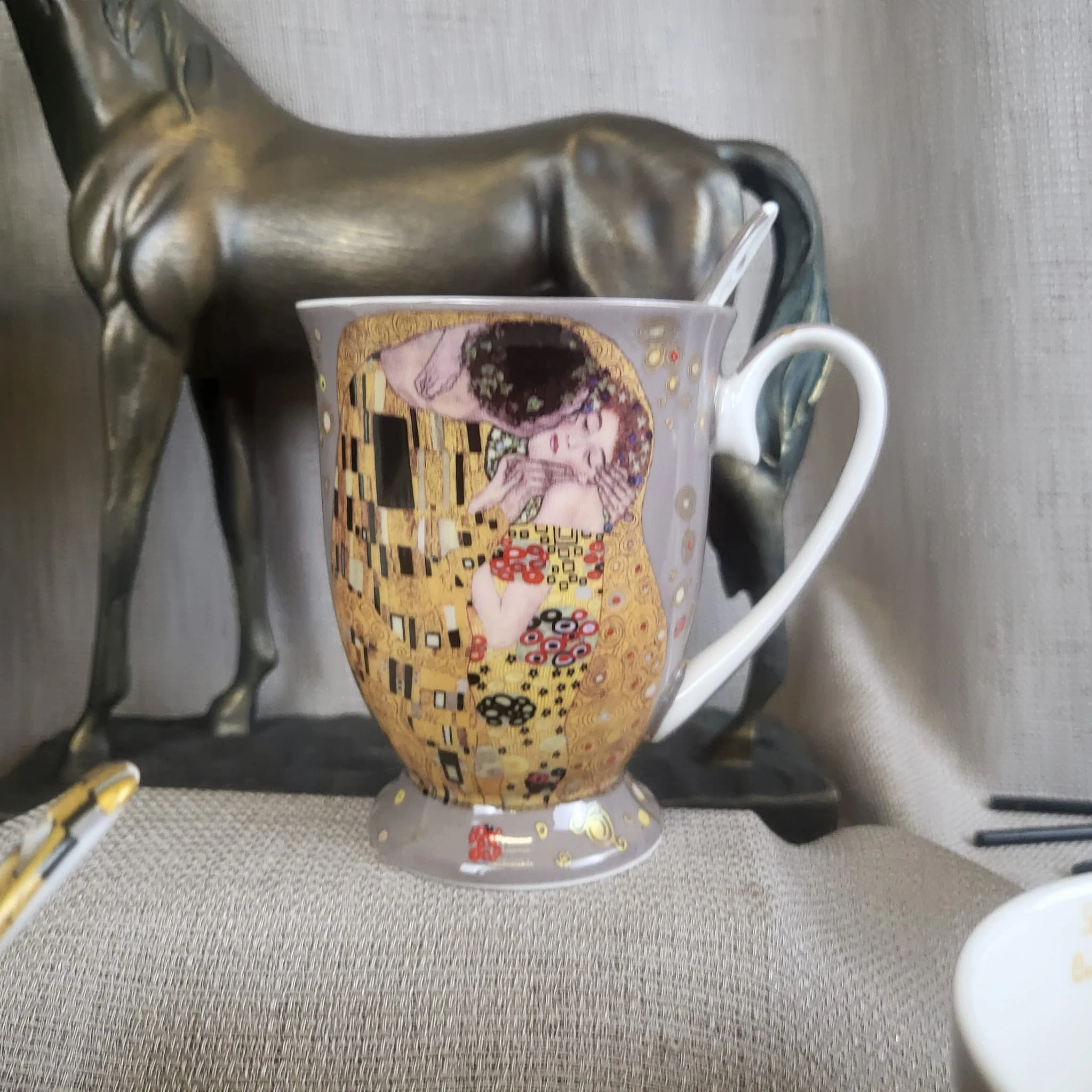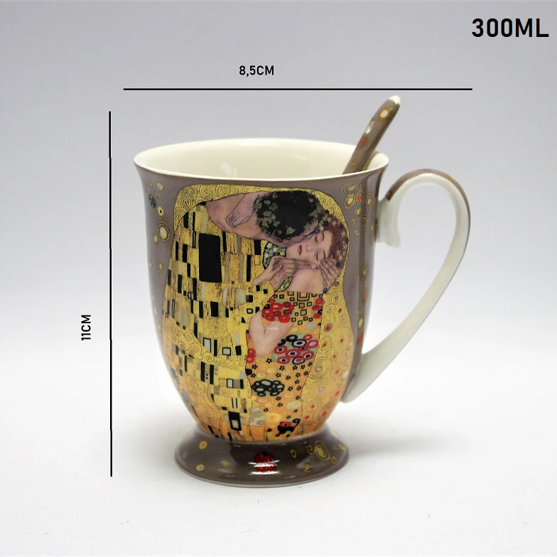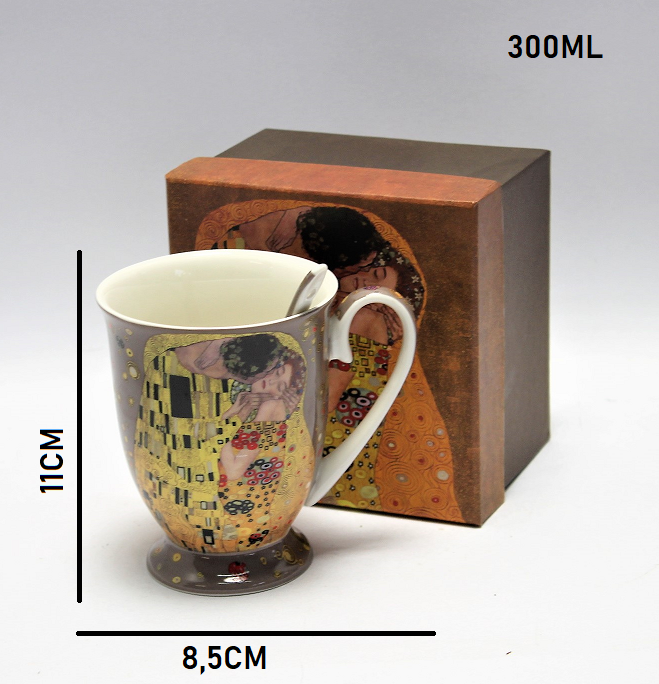 Na porcelanie znajduje się fragment słynnego obrazu Gustava Klimta: "Pocałunek" . Ta ikona sztuki połączona z spokojnym, szarym tłem tworzą niezwykły i oryginalny design, który na pewno przyciągnie uwagę wszystkich gości podczas porannej kawy lub wieczornego herbaty.