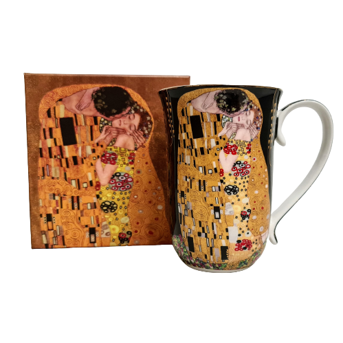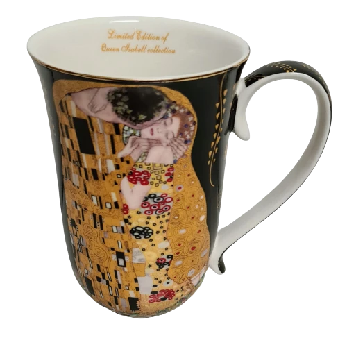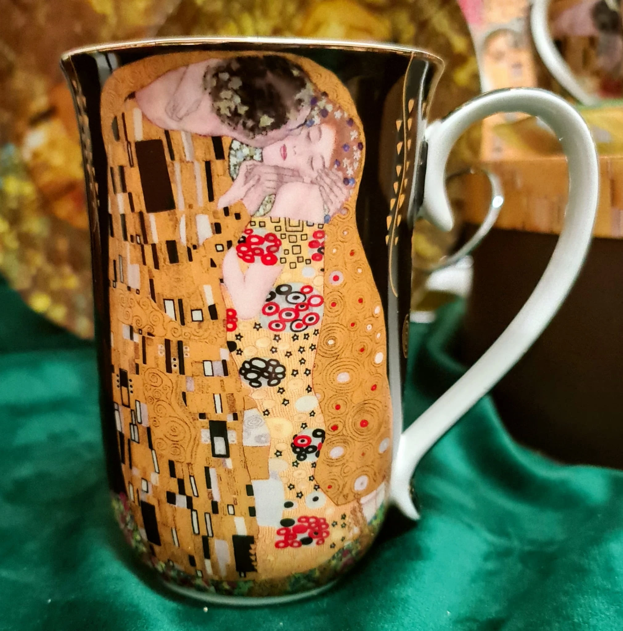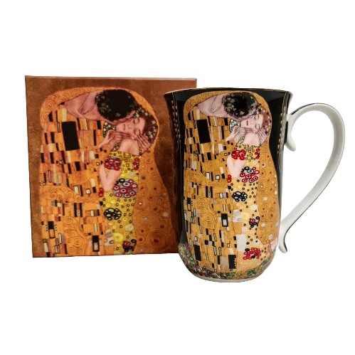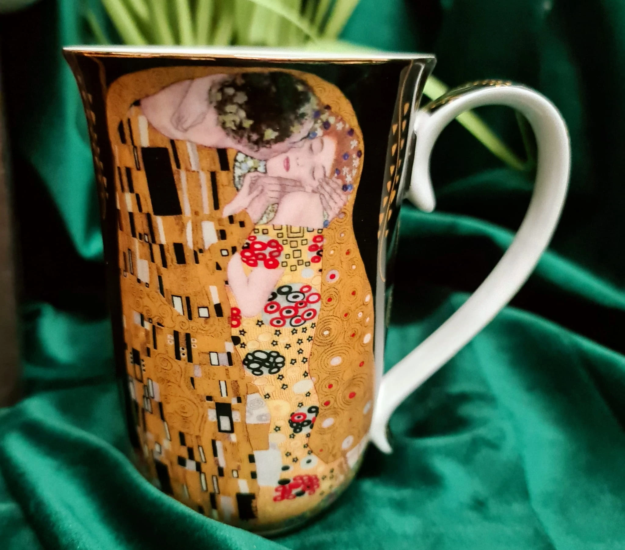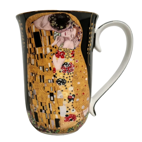 Kubek posiadający zdobienie przedstawiające obraz Gustawa Klimta- Pocałunek.