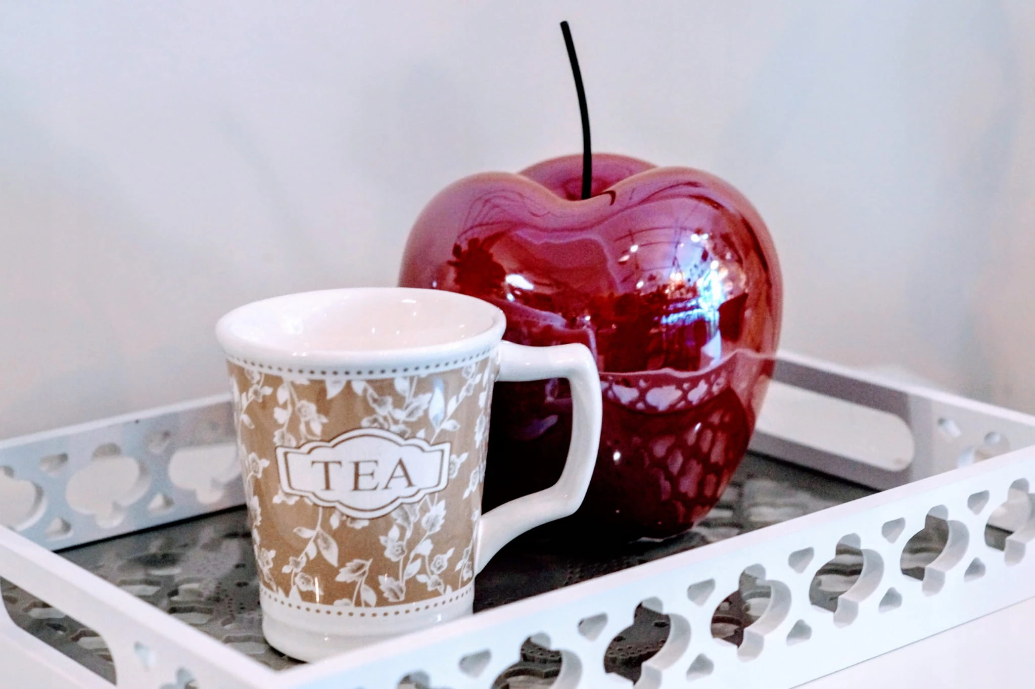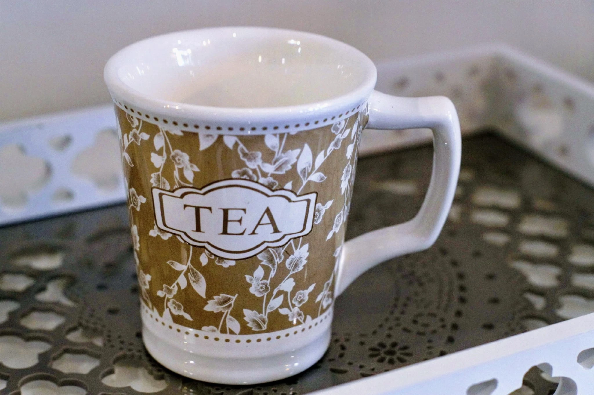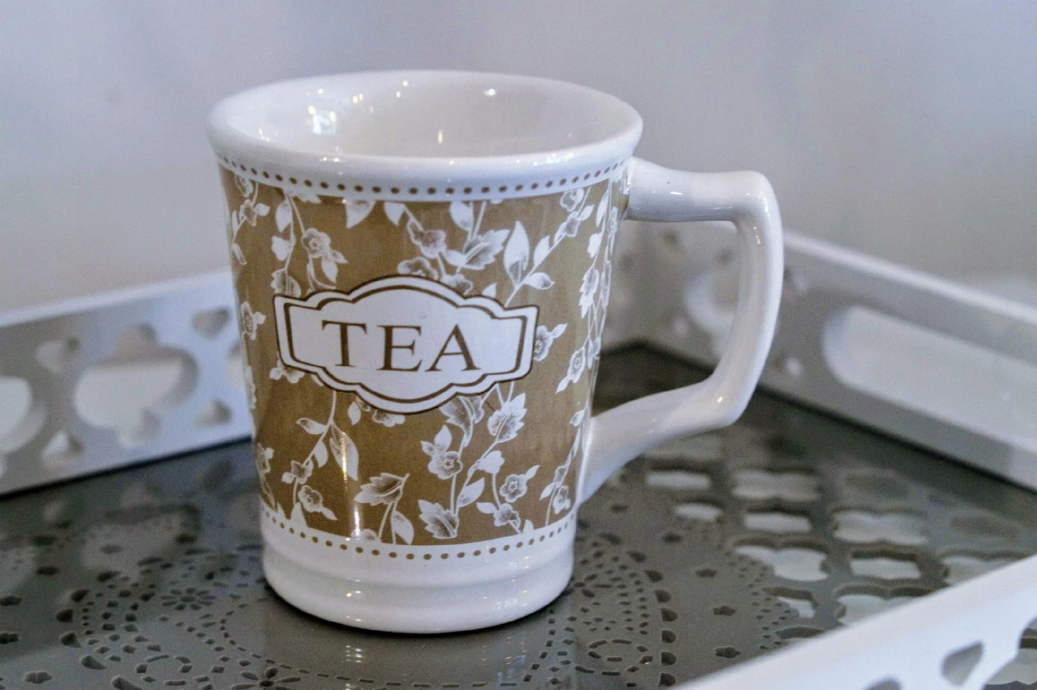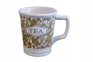 Kubek ceramiczny z nadrukiem "TEA". Dzięki jego subtelnej kolorystyce jest bardzo elegancki.