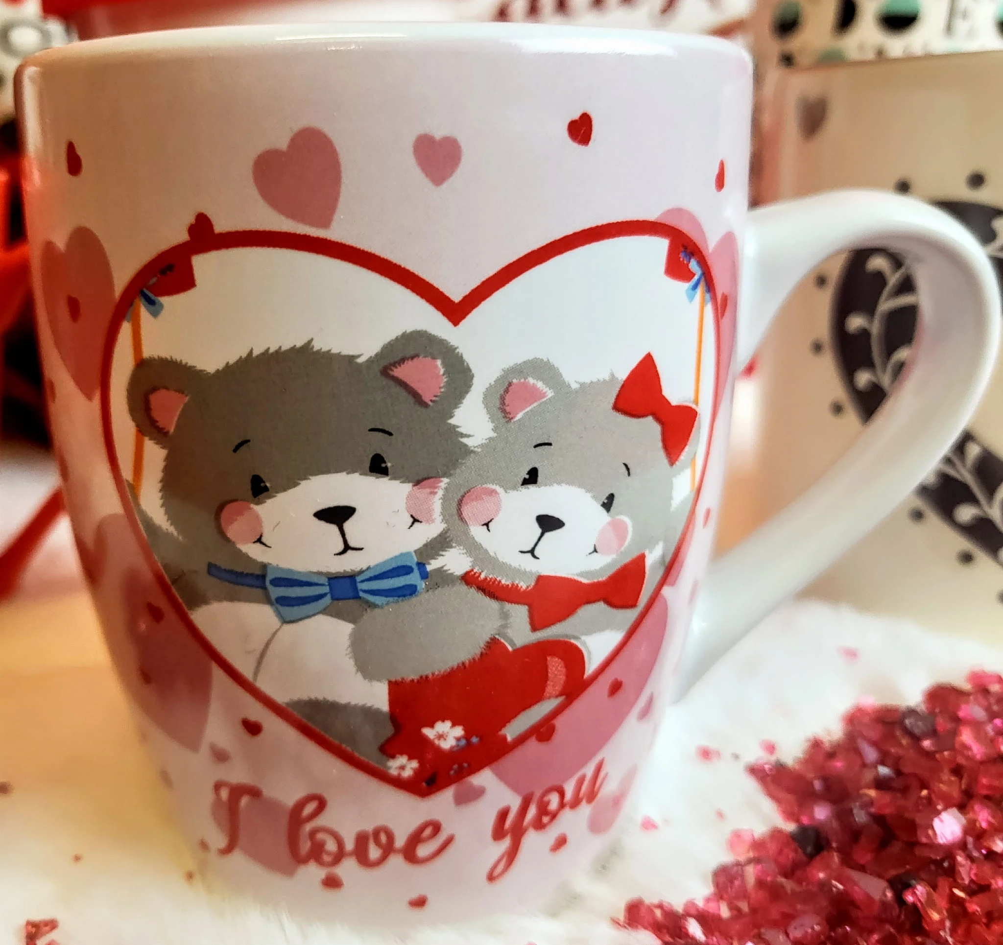 Kubek z motywem miłosnym, z zakochanymi misiami i napisem 'i love you'.