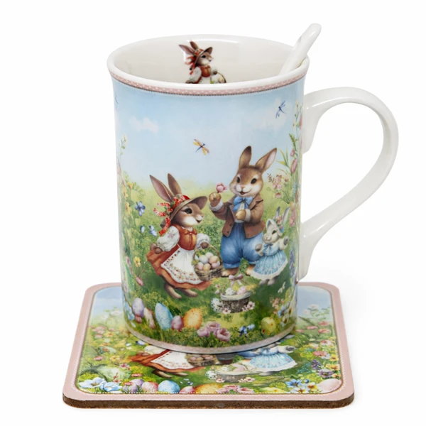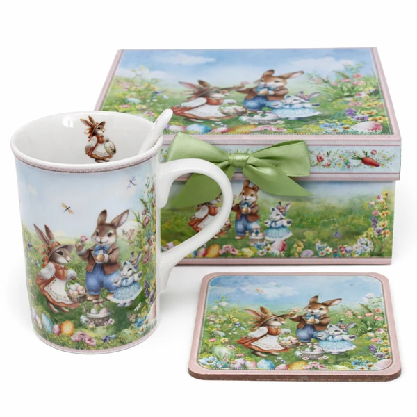 Każdy element zestawu został starannie zaprojektowany. Kubek zdobi barwna ilustracja przedstawiająca wielkanocne zajączki na kwitnącej łące. Co więcej, subtelny detal w postaci małego zajączka znajduje się również wewnątrz kubka oraz na rękojeści ceramicznej łyżeczki. To detale, które wywołują uśmiech przy każdym parzeniu kawy czy herbaty.