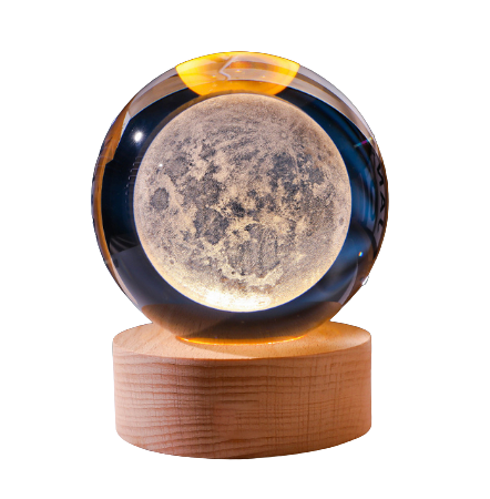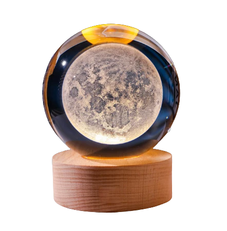 Podświetlana kryształowa kula dekoracyjna na podstawie drewnianej z wizerunkiem Księżyca to nie tylko elegancka ozdoba, ale także wspaniałe źródło nastrojowego oświetlenia. Doskonale nadaje się do salonu, sypialni, biura lub jako prezent dla bliskiej osoby. To doskonały pomysł na prezent dla miłośnika astronomii, dekoratorów wnętrz oraz młodzieży, która pasjonuje się nauką.