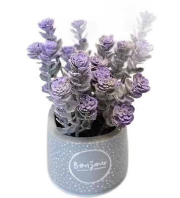 Dekoracyjna, sztuczna roślina – odcienie FIOLETU w ozdobnej SZAREJ, NAKRAPIANEJ donicy z napisem "Bonjour".