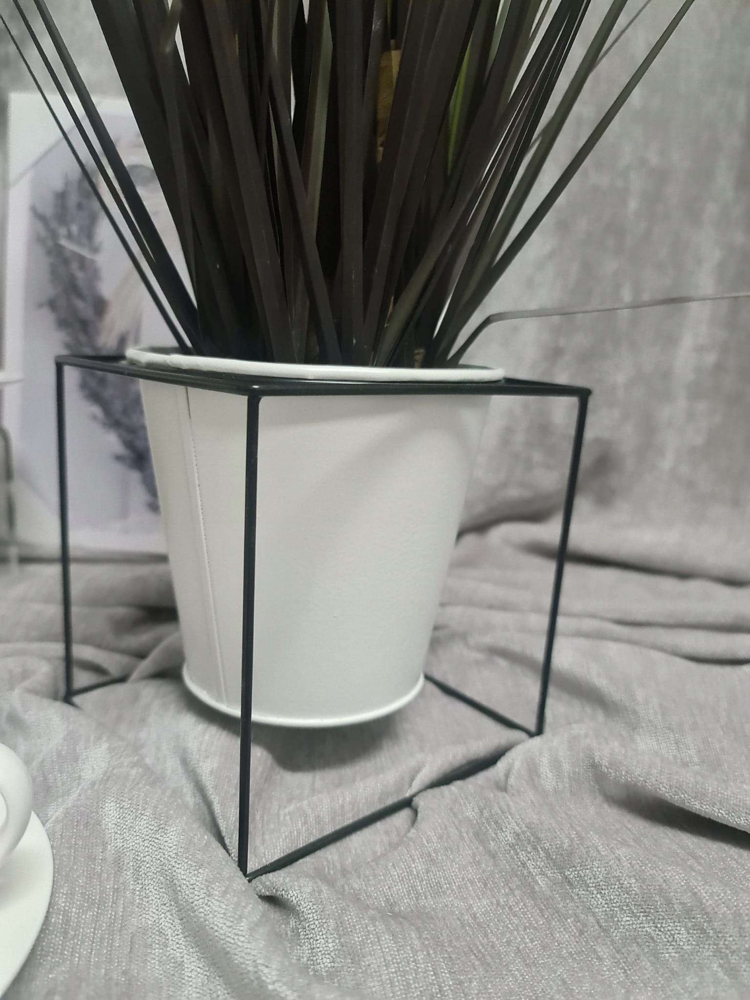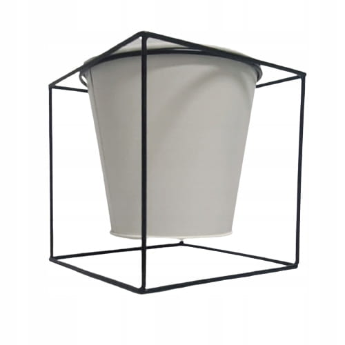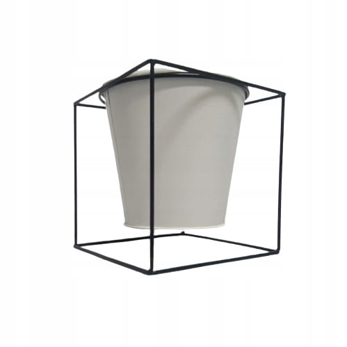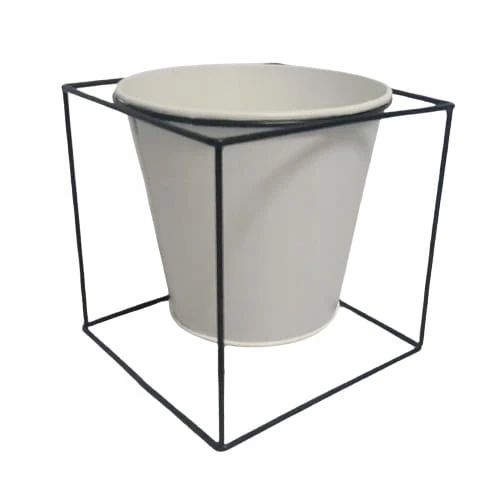 Oryginalny element dekoracyjny. Biała, metalowa doniczka/ kwietnik na czarnym stelażu.