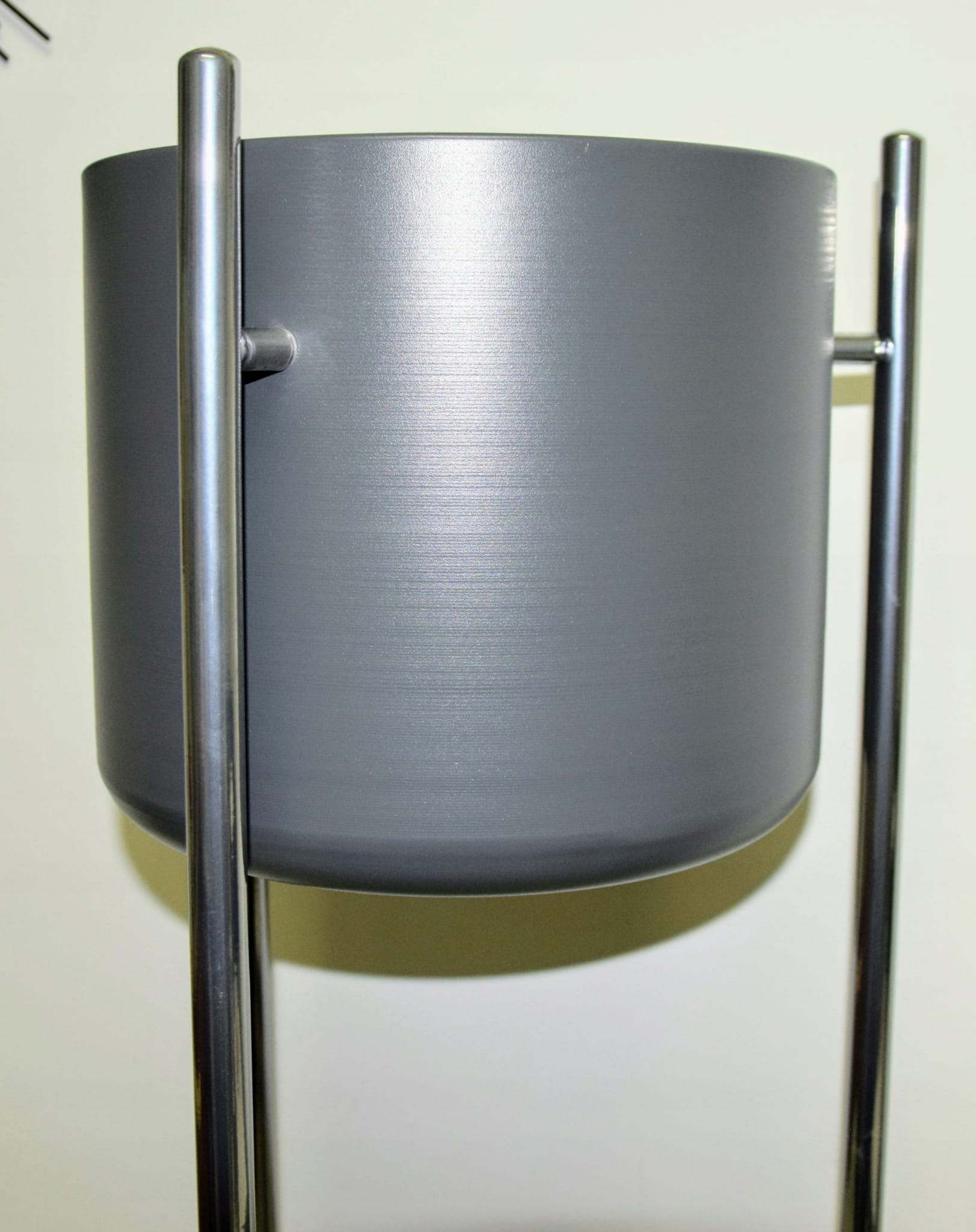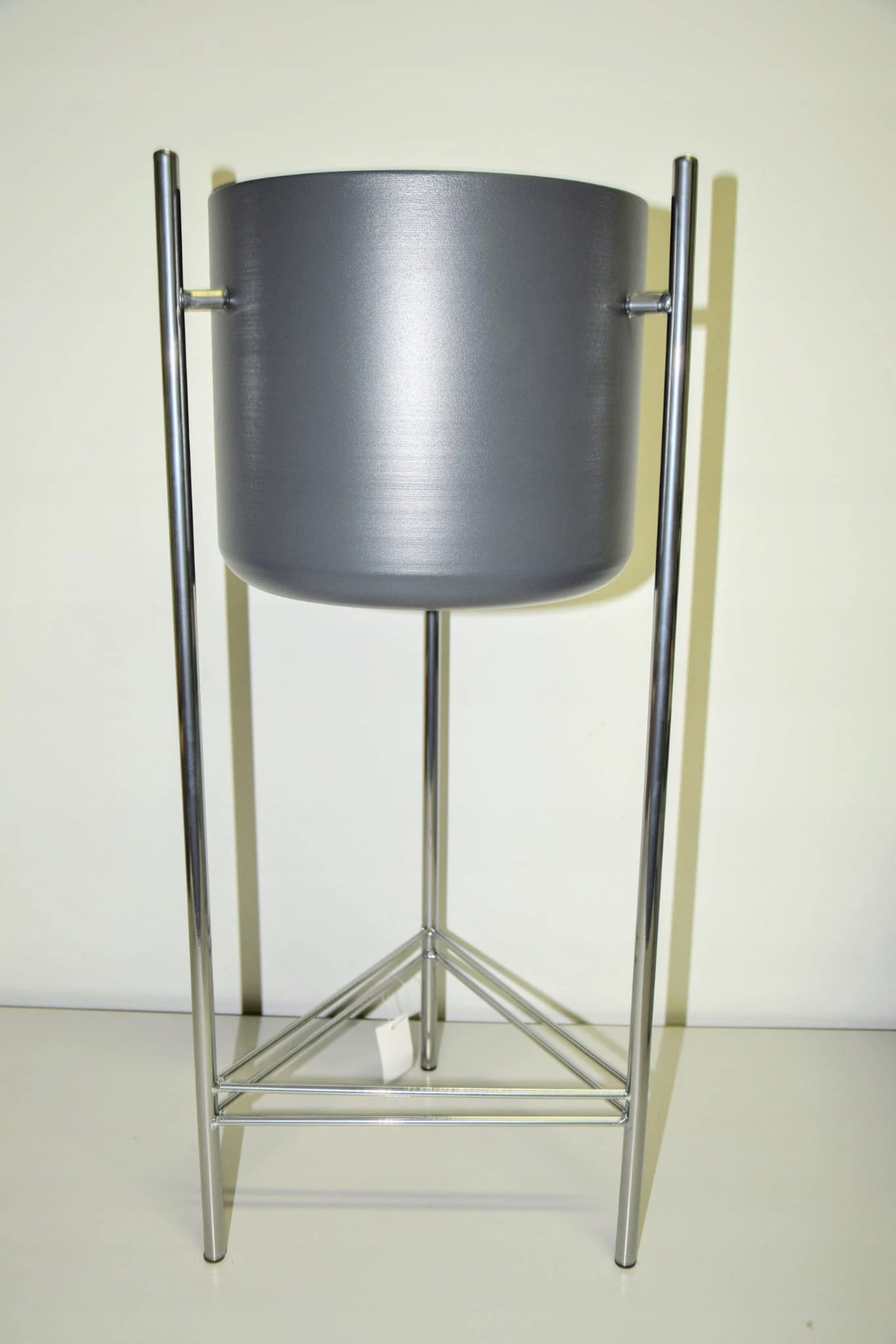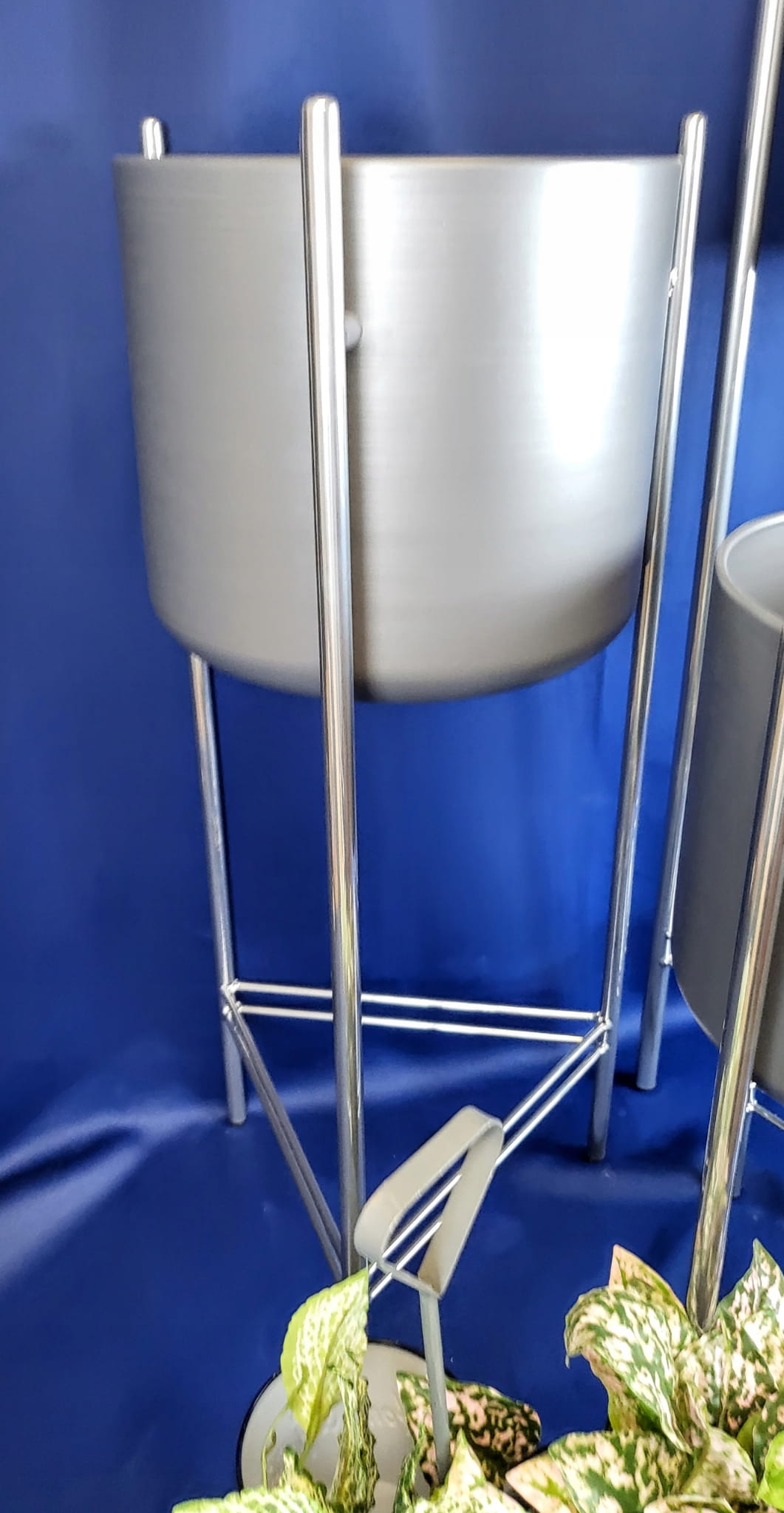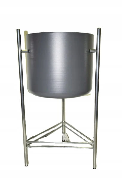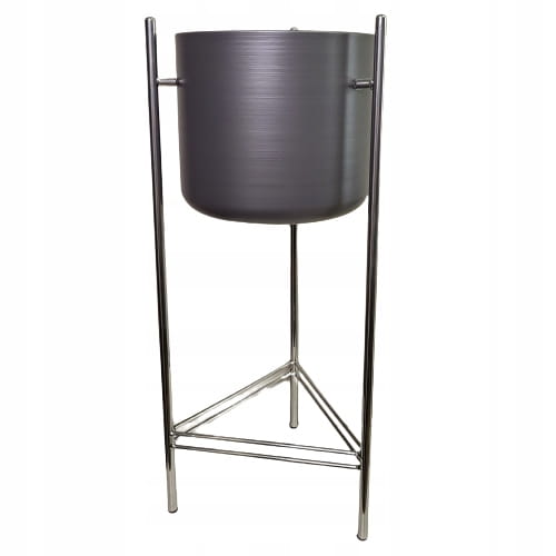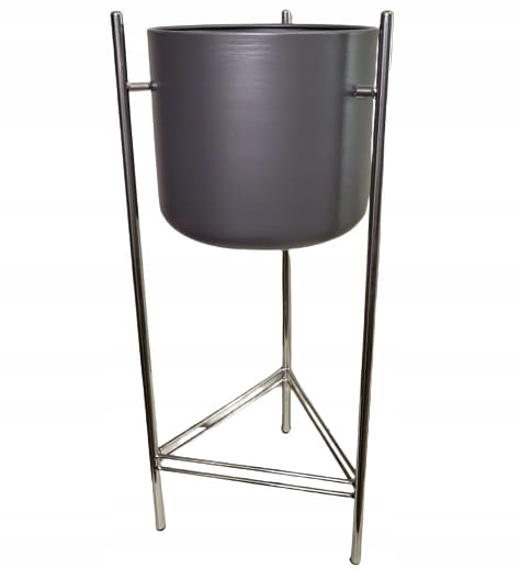 Oryginalny element dekoracyjny. Szara doniczka na srebrnym stelażu.