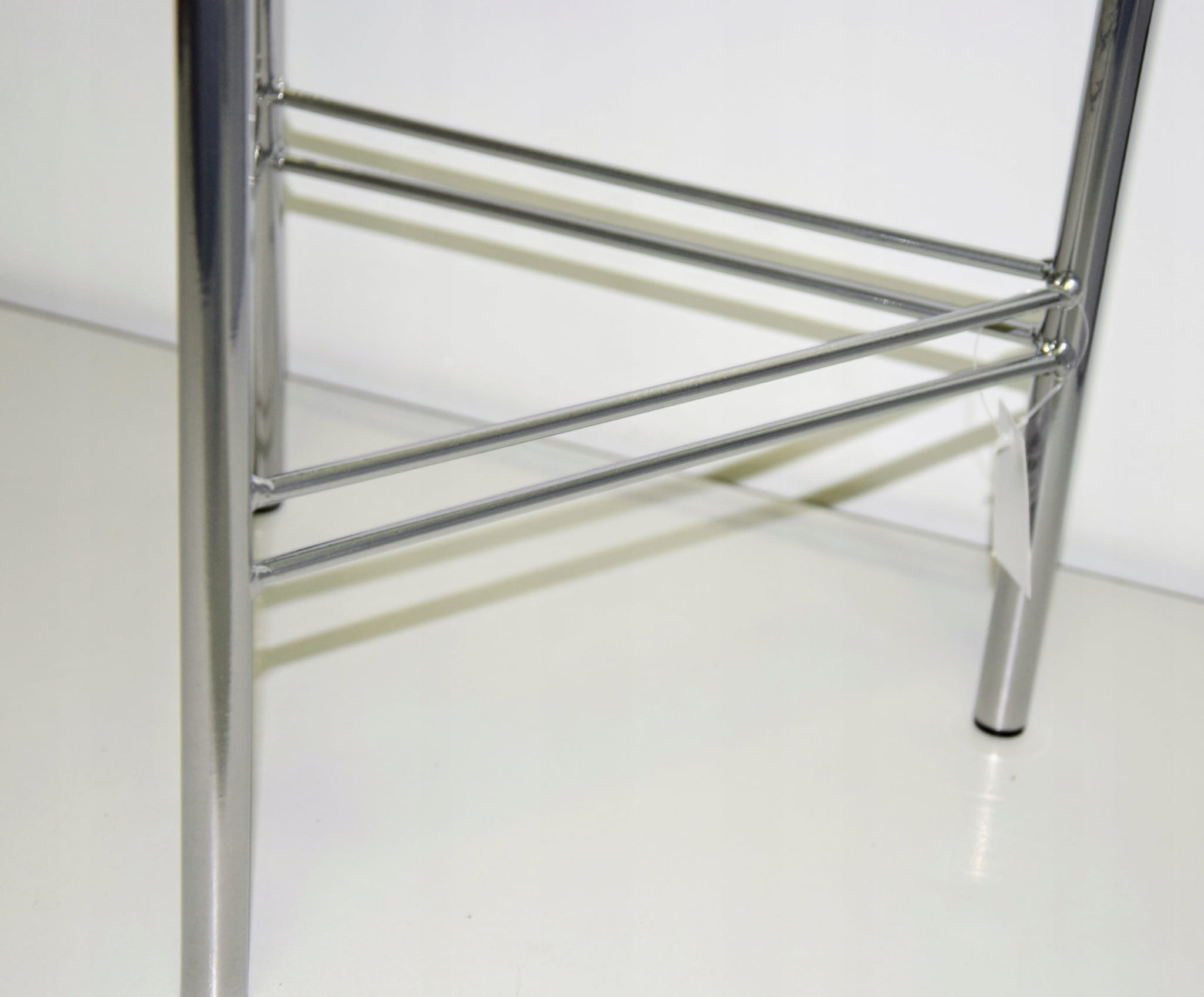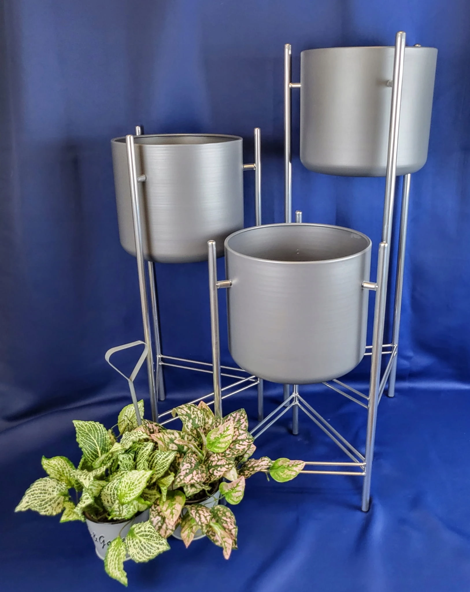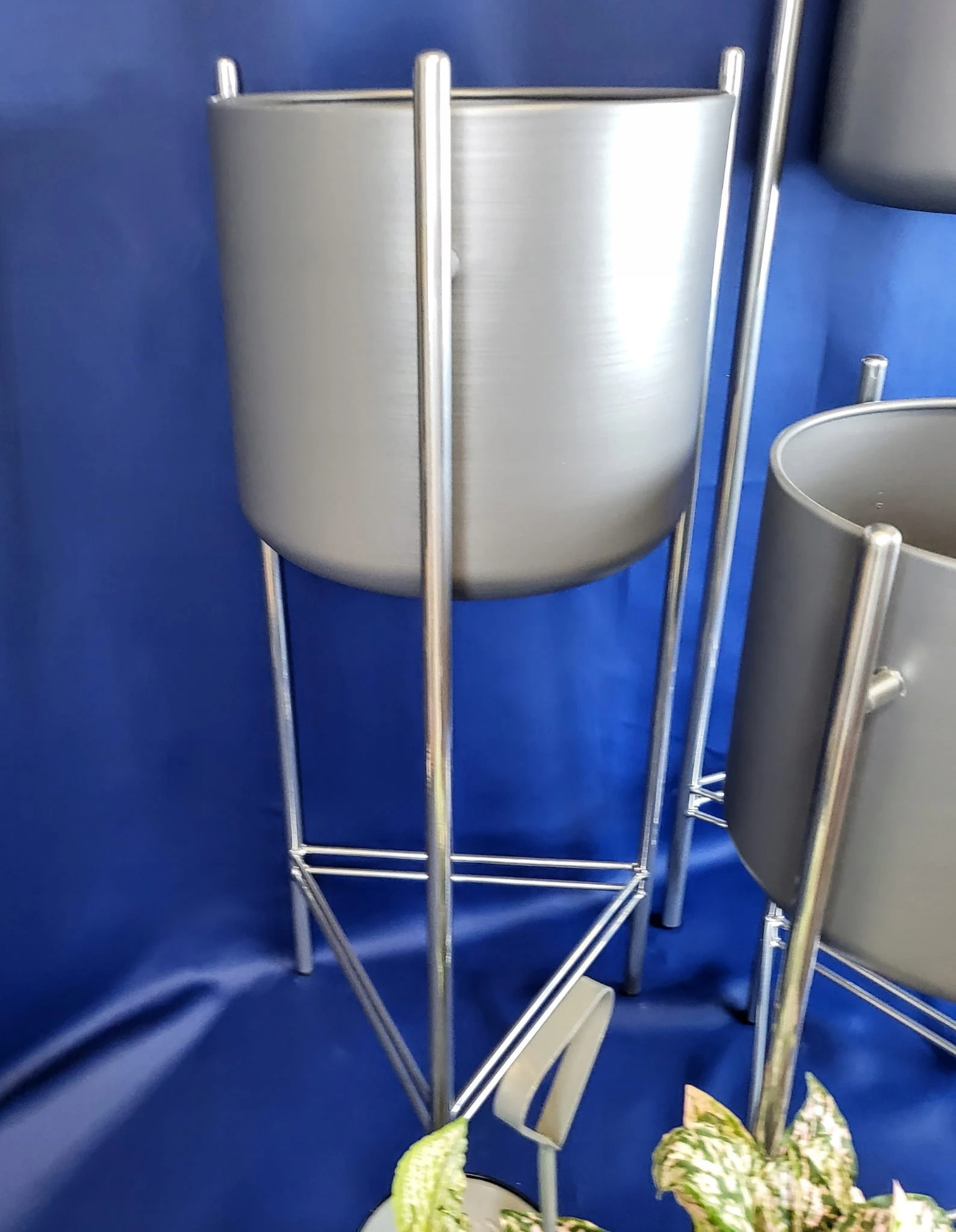 Oryginalny element dekoracyjny. Szara doniczka na srebrnym stelażu.