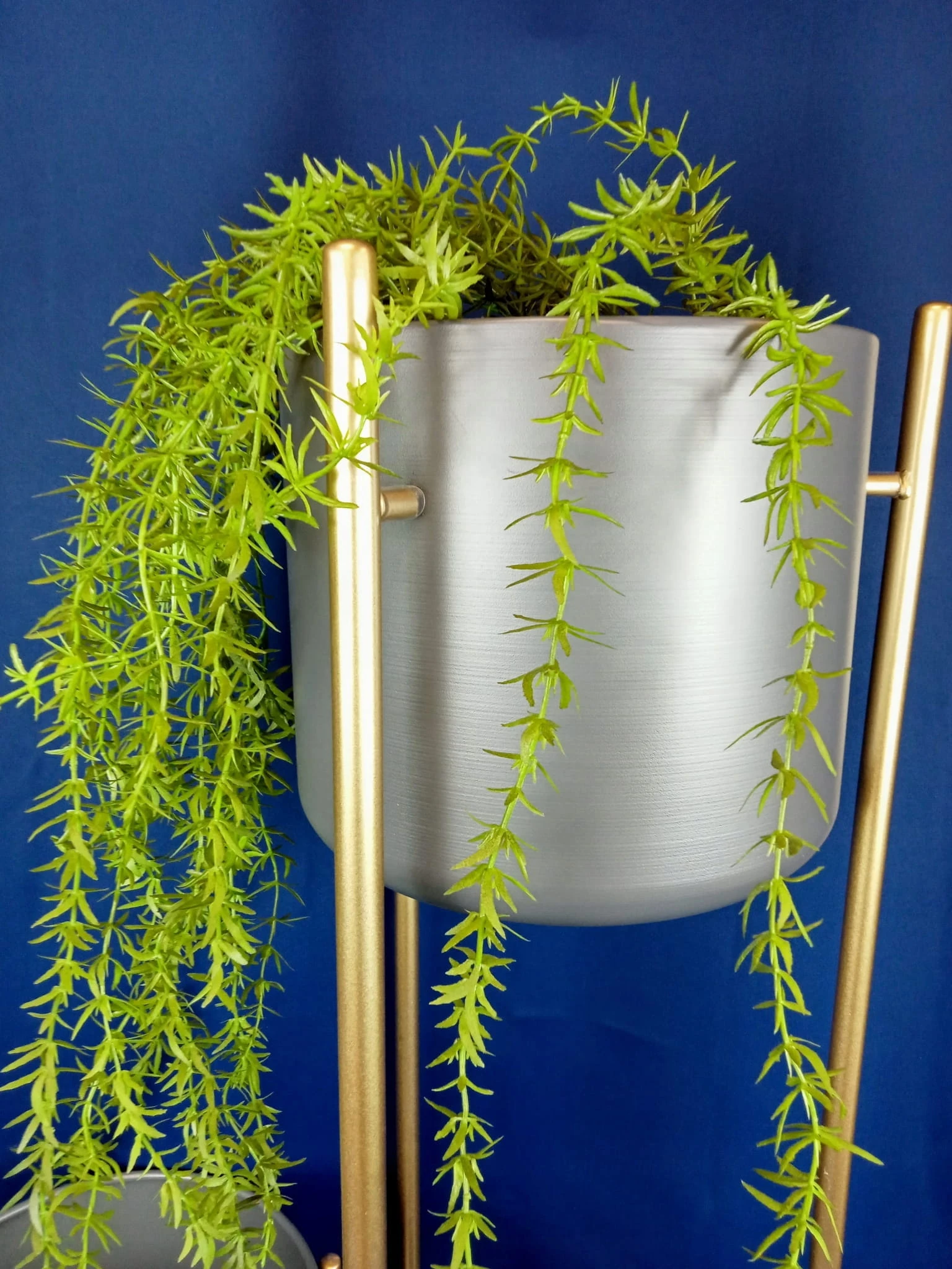 Oryginalny element dekoracyjny. Szara doniczka na złotym stelażu.