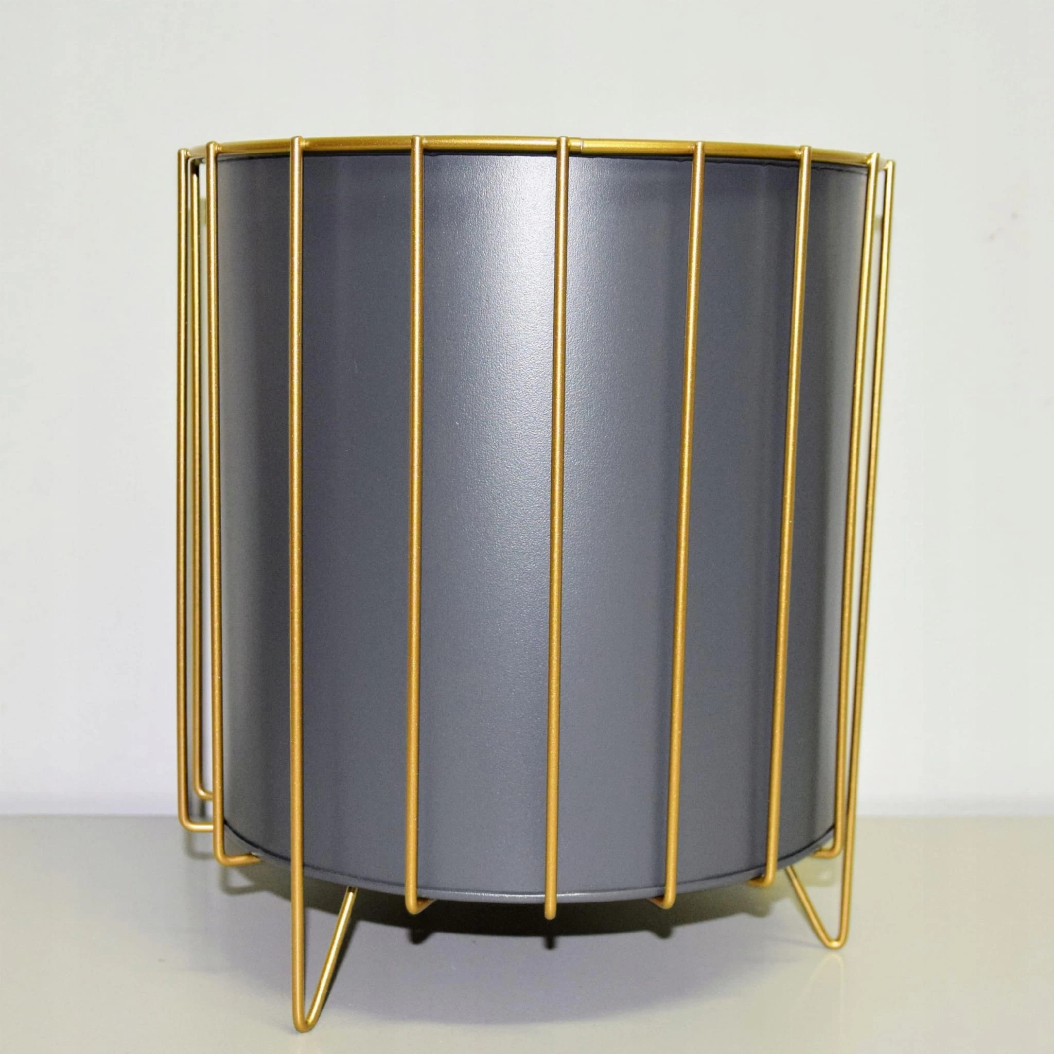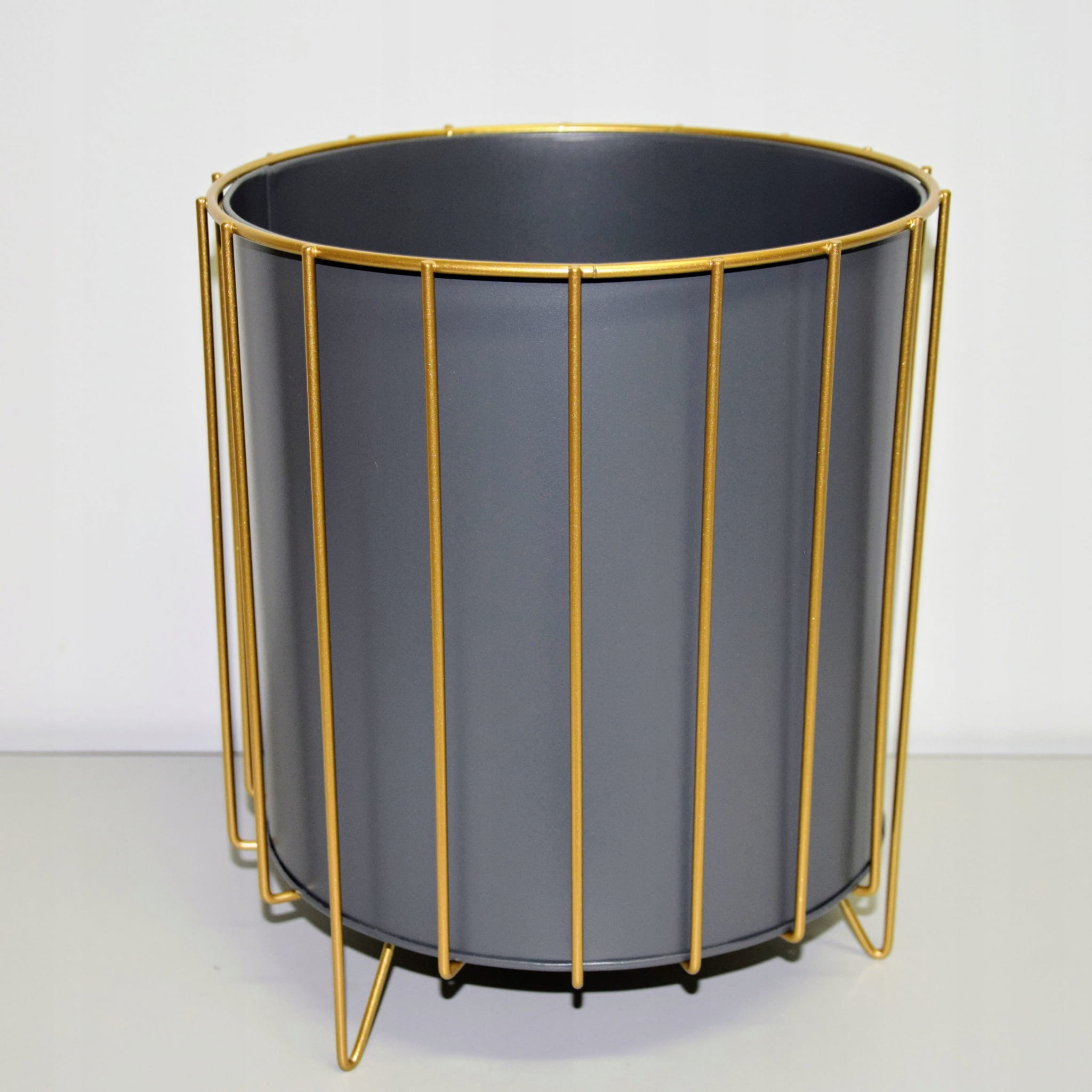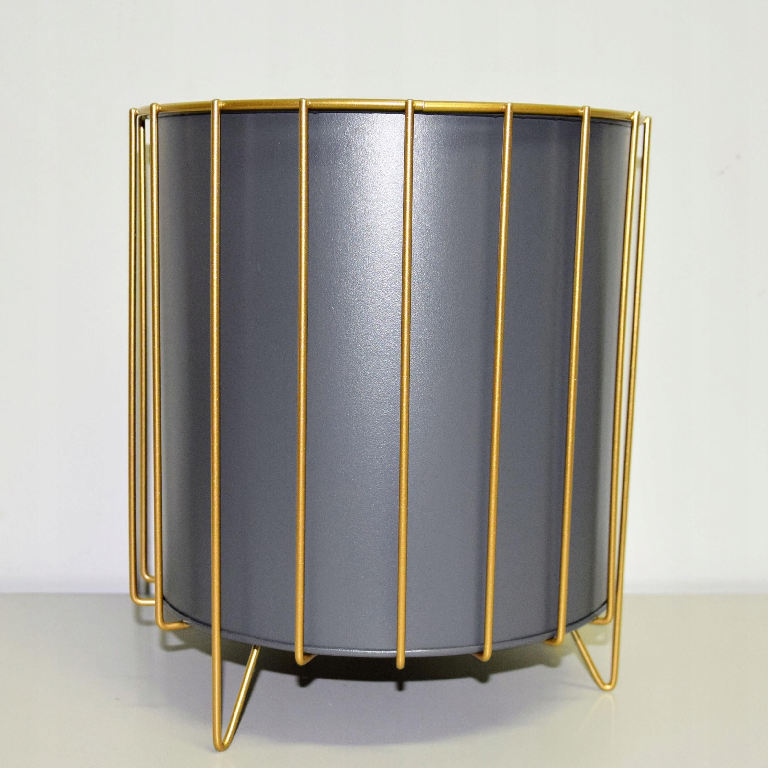 Oryginalny element dekoracyjny. Szara doniczka na złotym stelażu.