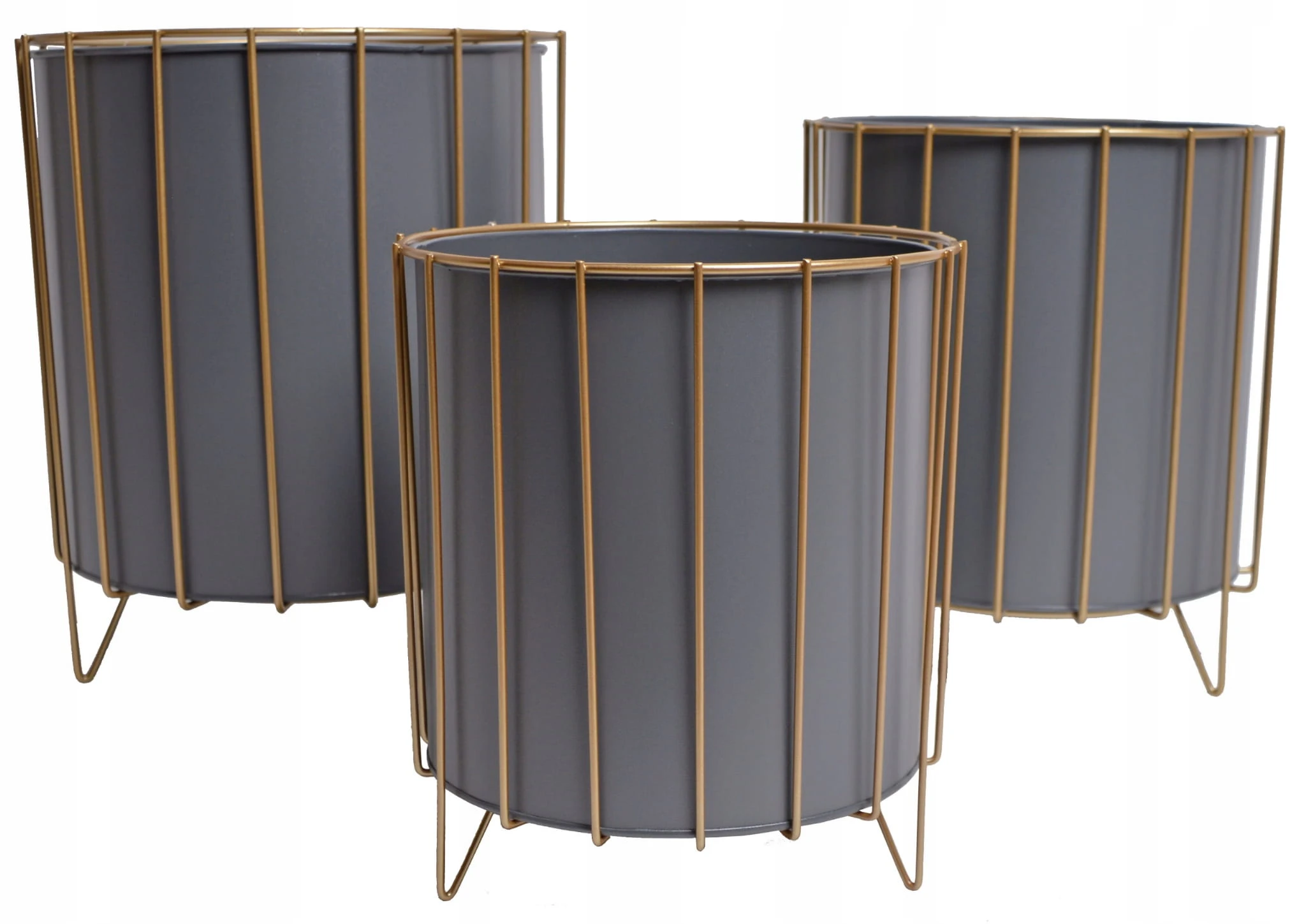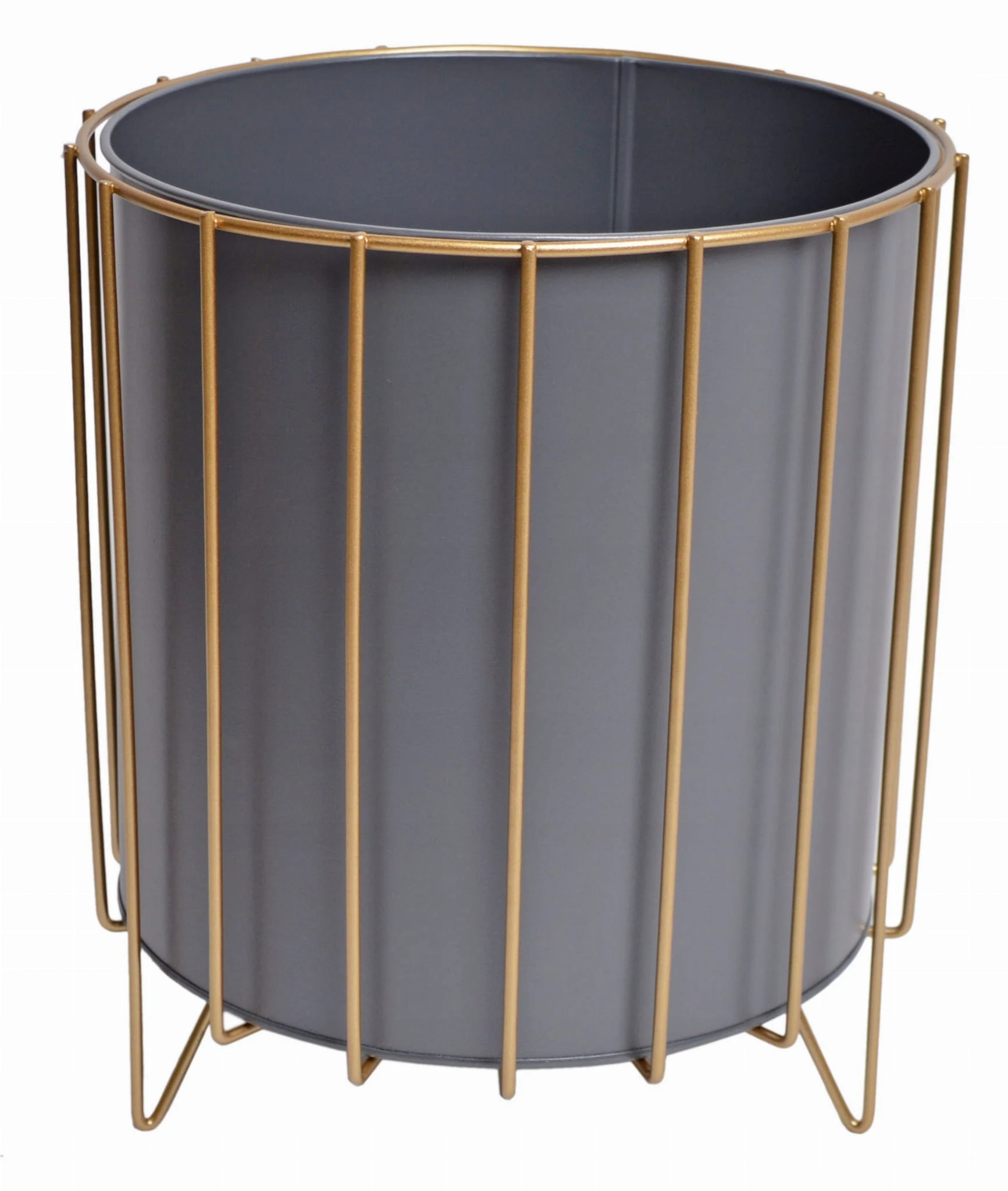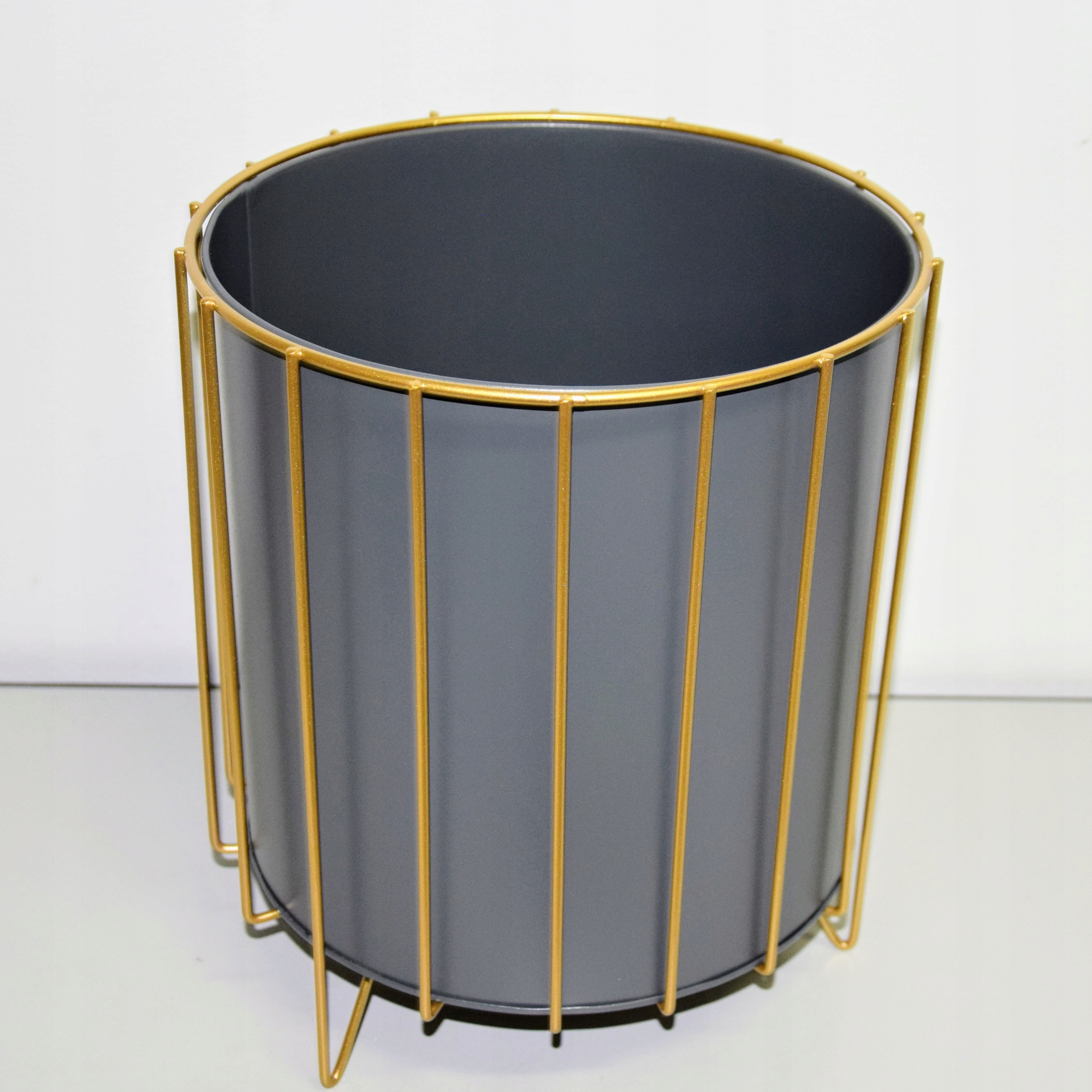 Oryginalny element dekoracyjny. Szara doniczka na złotym stelażu.