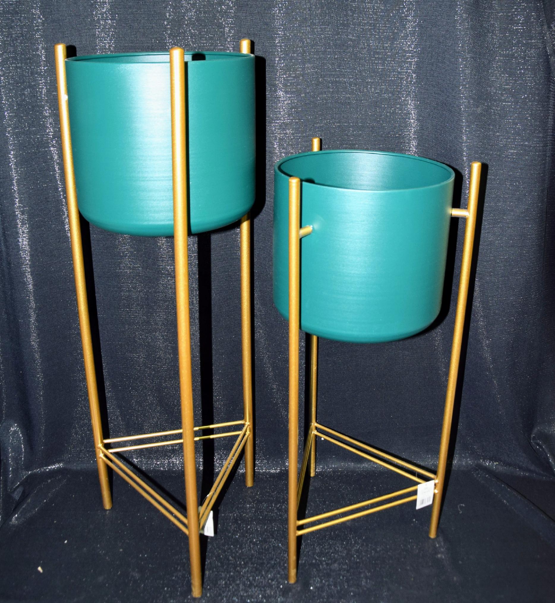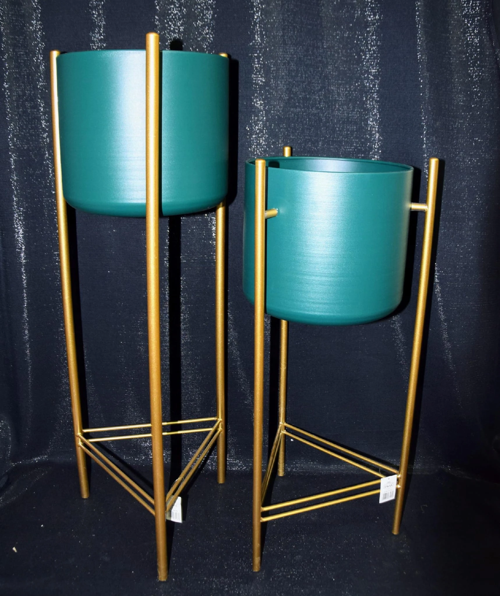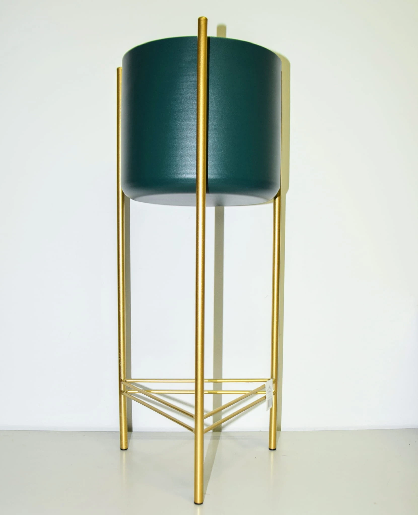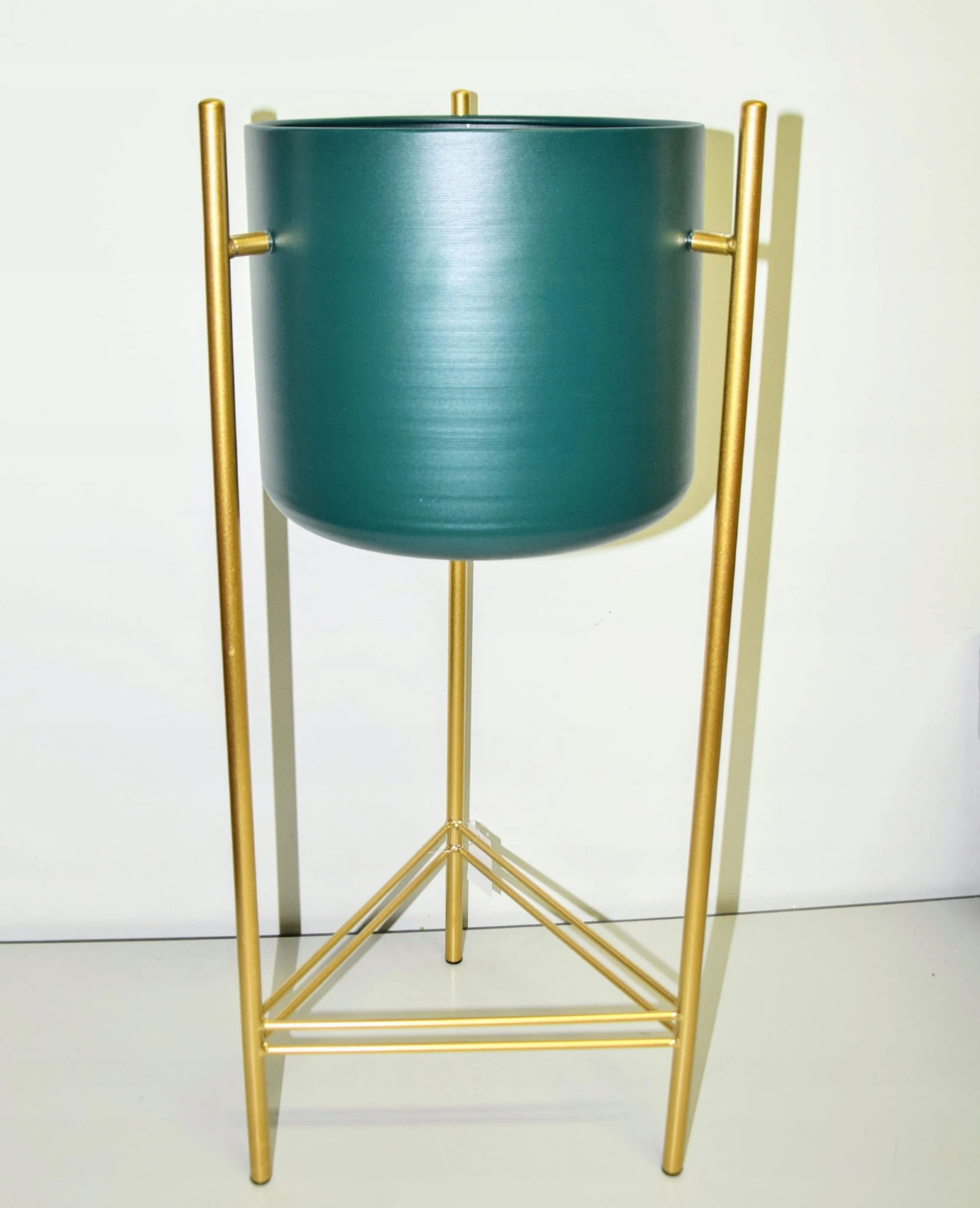 Duży kwietnik z zieloną donicą na wysokich, stabilnych nóżkach w kolorze złotym. Idealny dla każdego amatora kwiatów. Doskonale wpisze się w industrialne wnętrze.