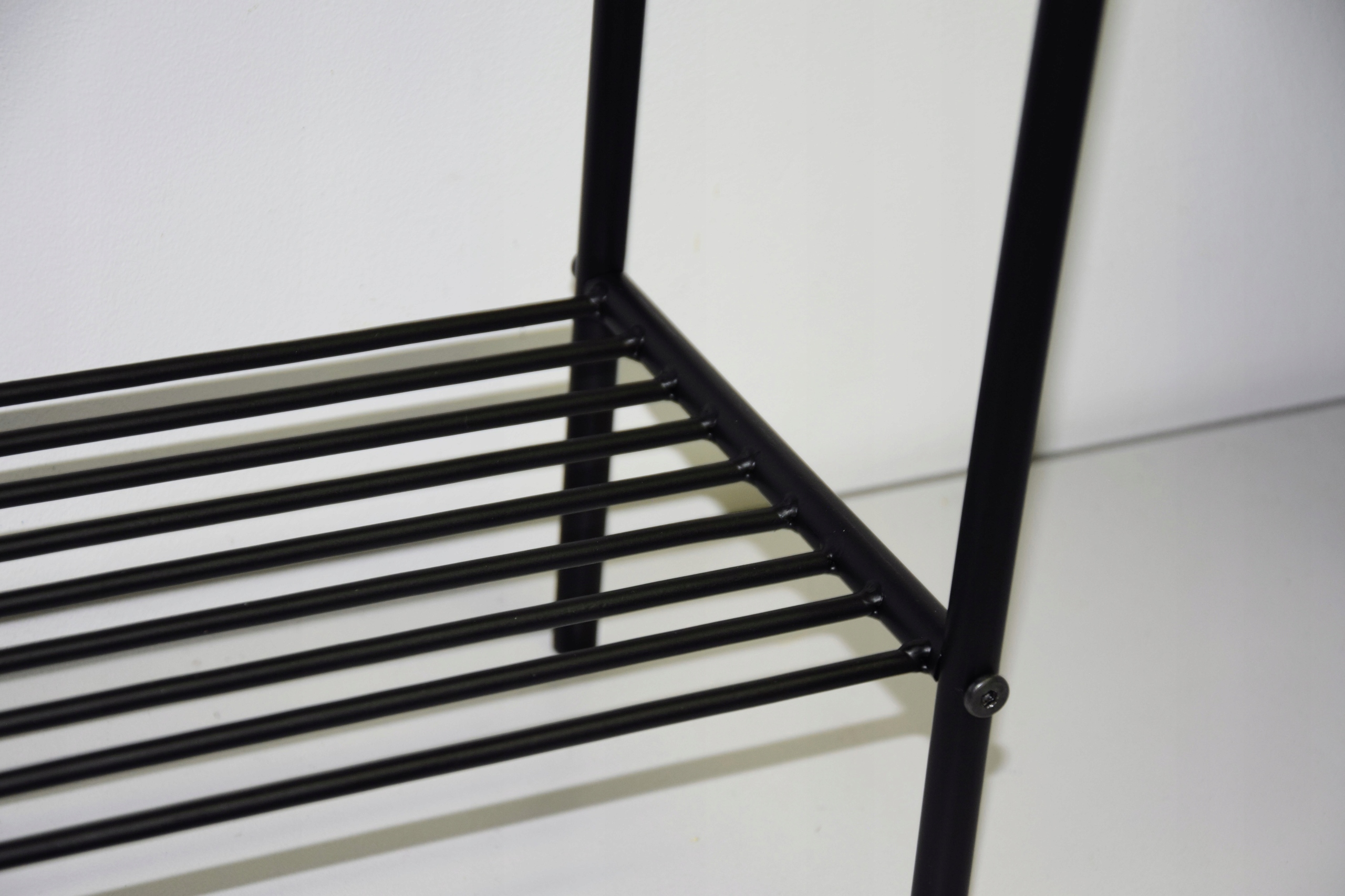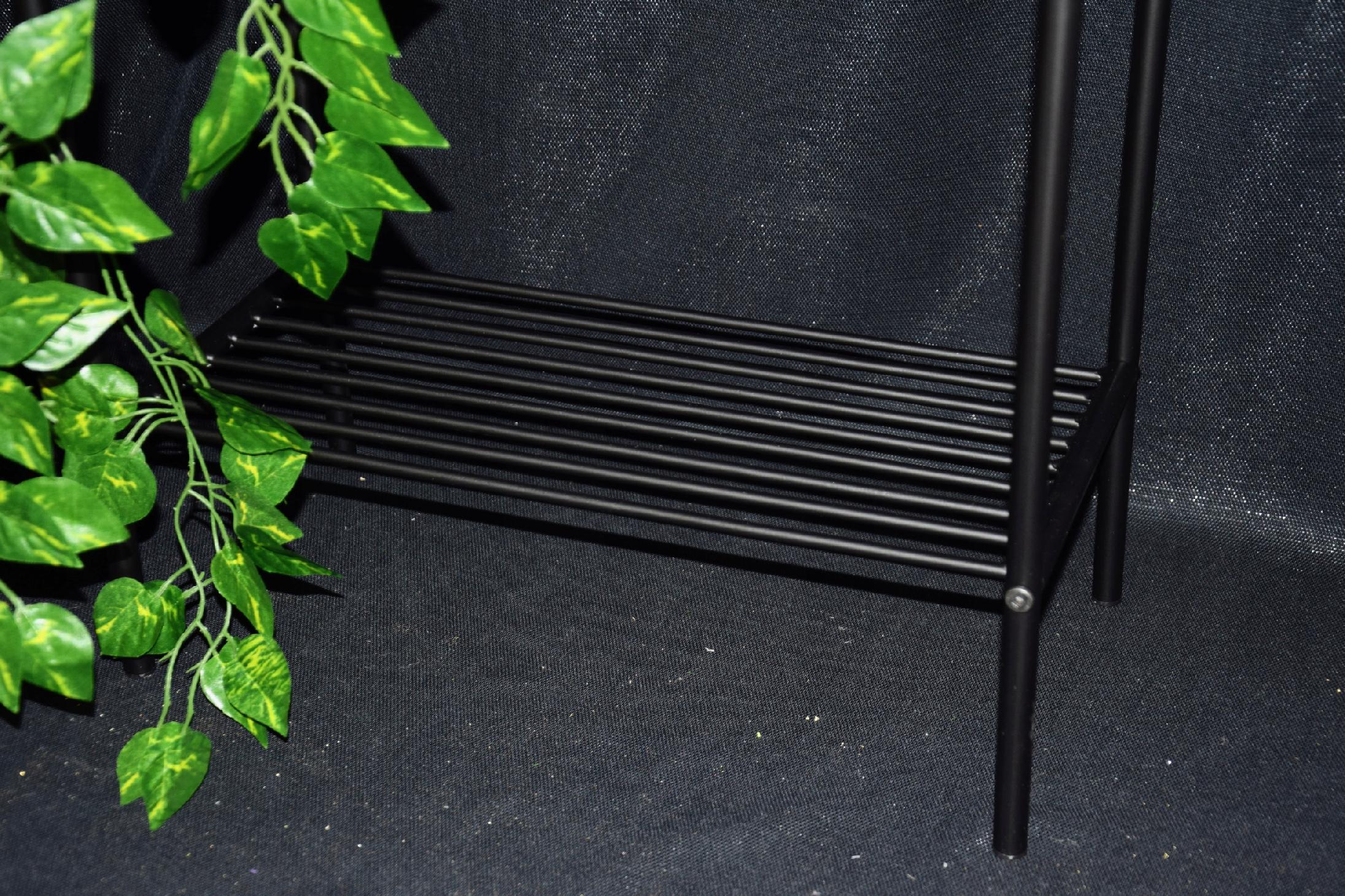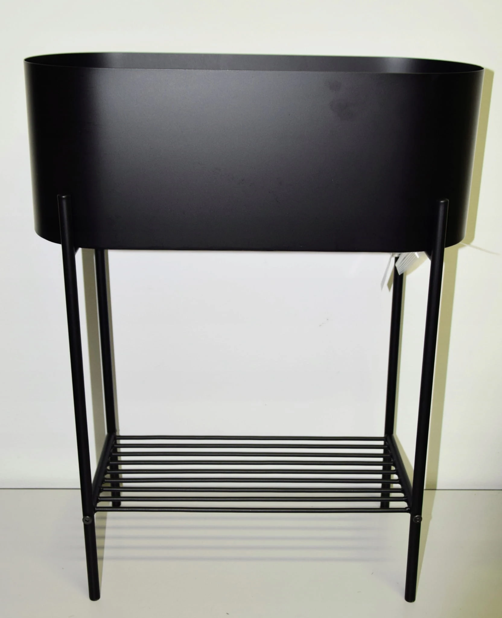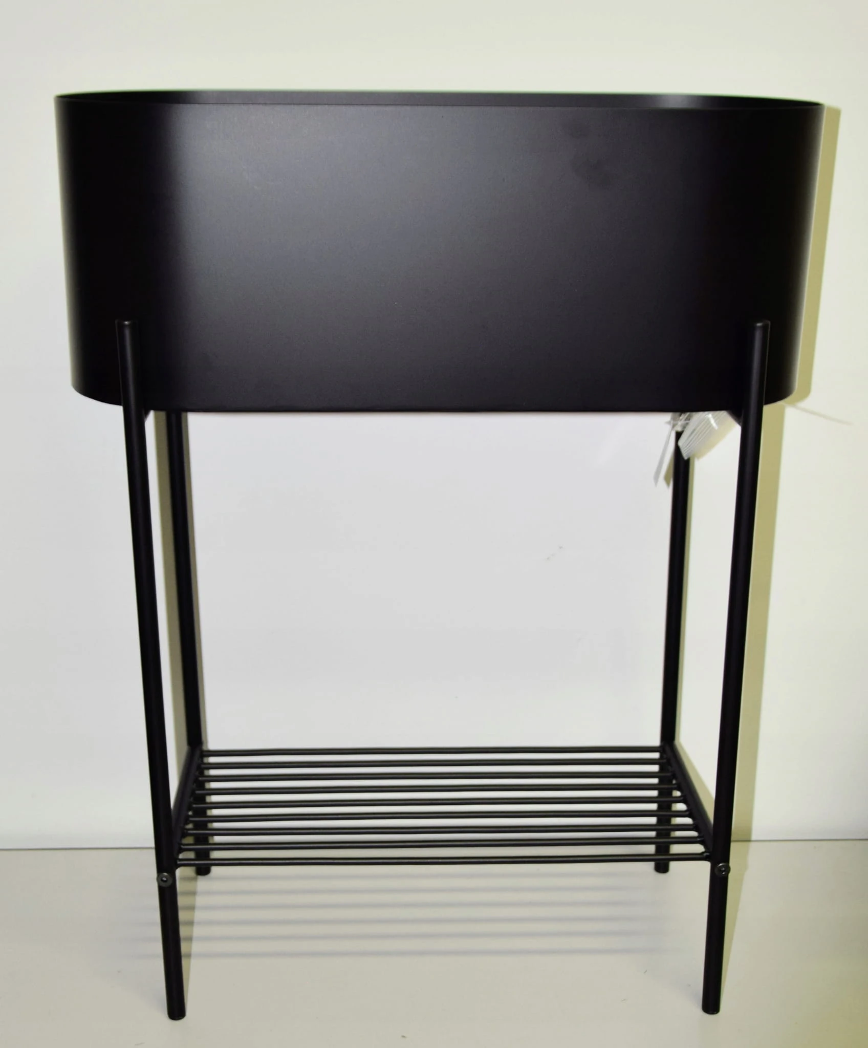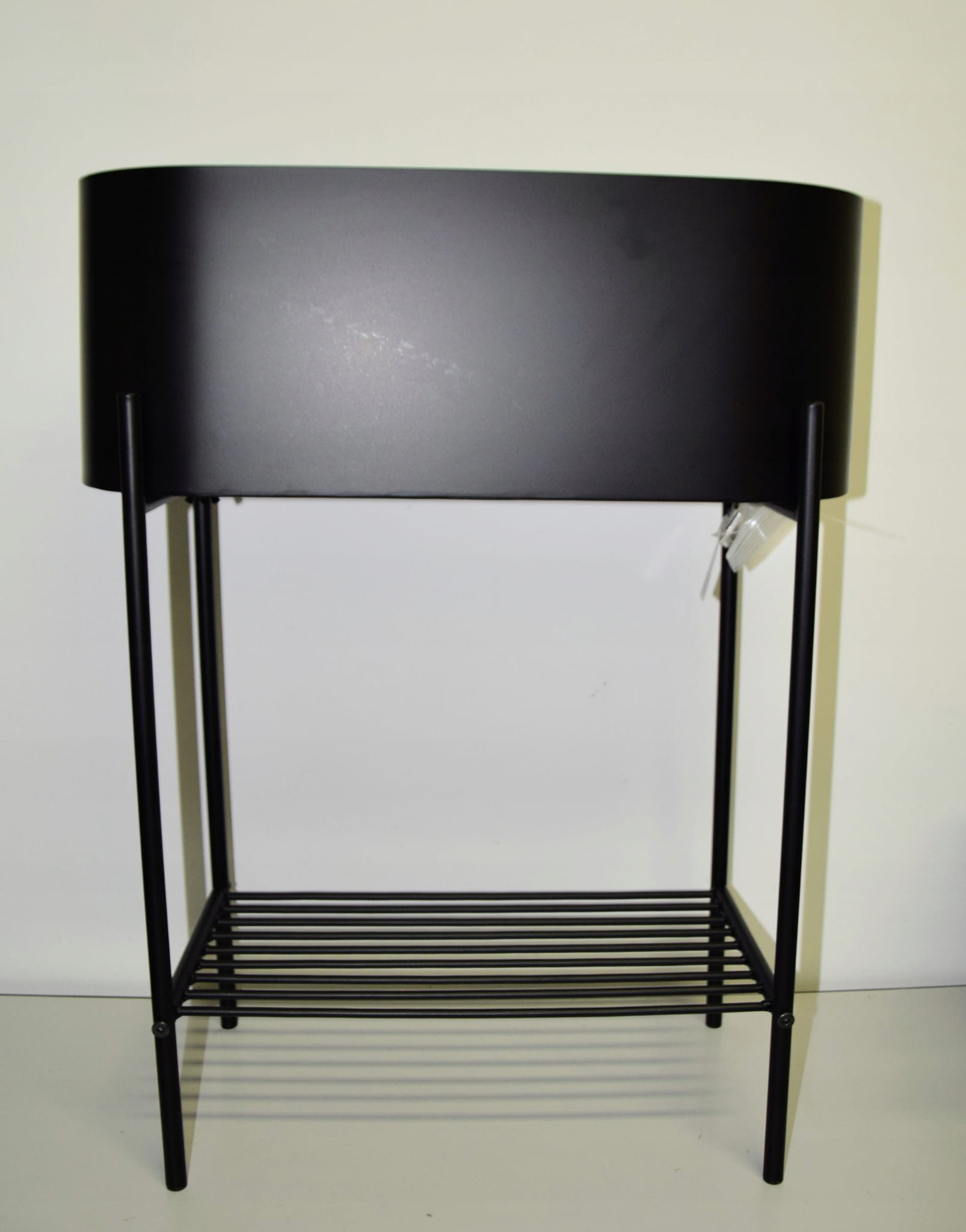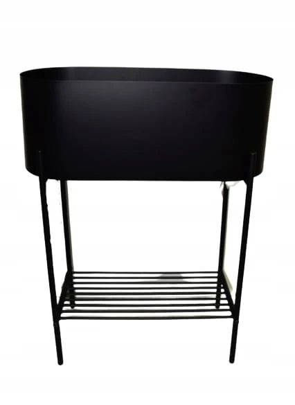 Kwietnik metalowy owalny w kolorze CZARNYM na czarnych nogach. Półeczka na dole stanowi dodatkowe miejsce na kwiaty lub gazety.